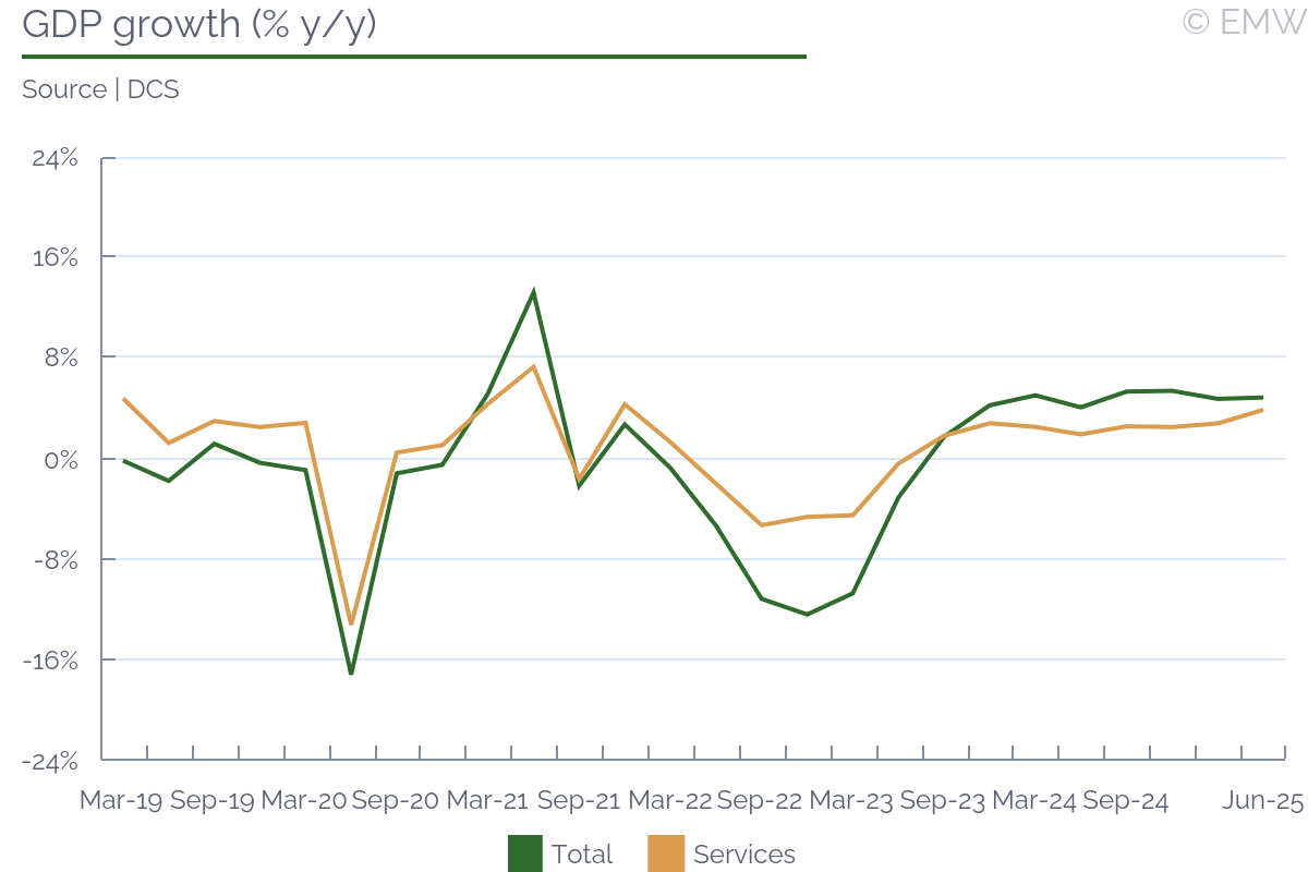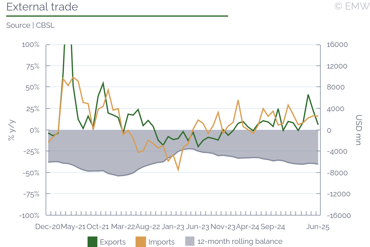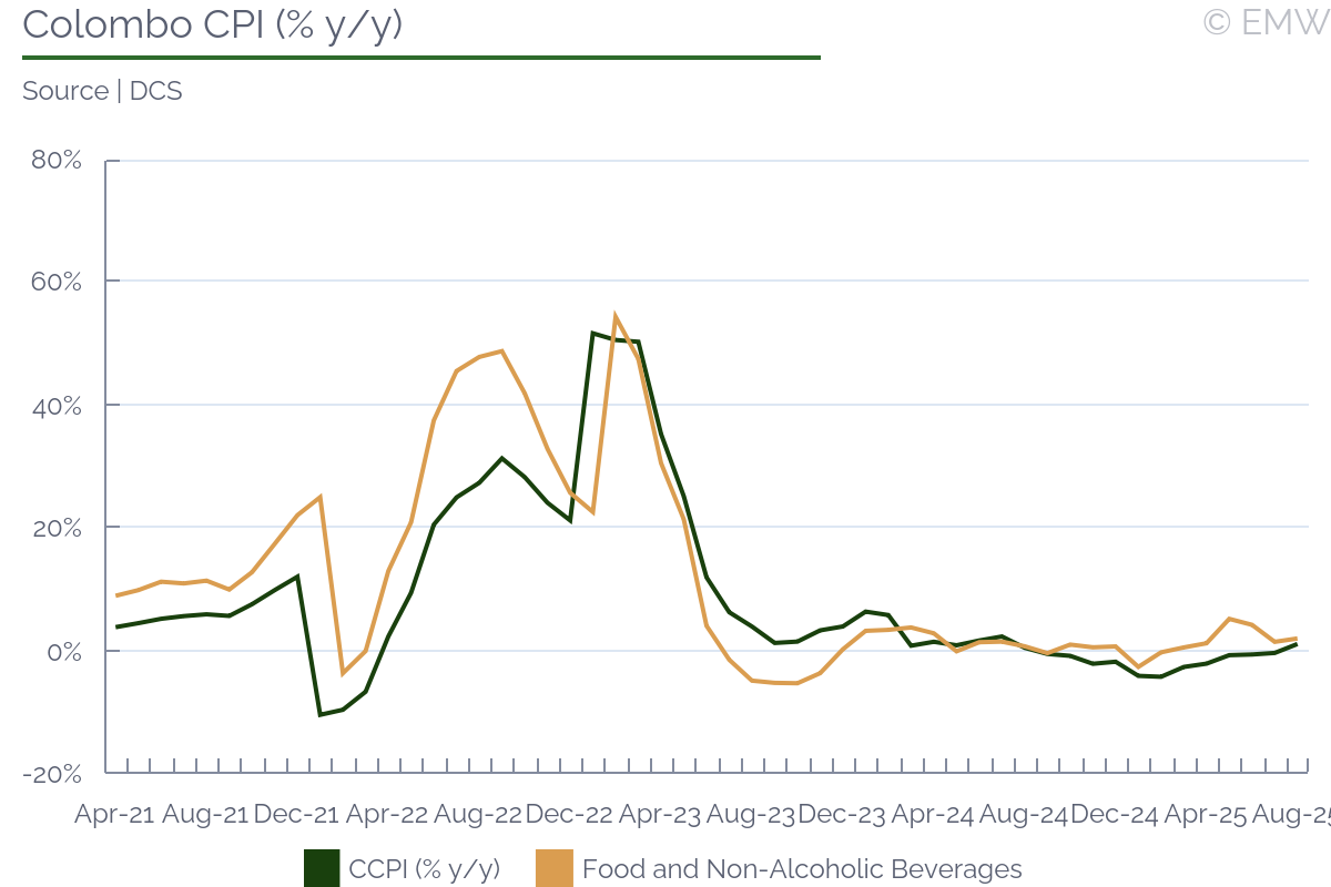 At its July 23 meeting, the CBSL held the Overnight Policy Rate (OPR) steady at 7.75%, following a 25bp cut in May. The Monetary Policy Board views this stance as consistent with guiding inflation toward its 5% medium-term target, allowing time for previous monetary easing to fully impact credit markets. The hold marks a shift from active easing to a data-driven pause as CBSL balances recovering demand with persistent global and domestic risks. The symmetric corridor is still in place, with the Standing Deposit Facility Rate (SDFR) at 7.25% and the Standing Lending Facility Rate (SLFR) at 8.25%, as per the revised monetary policy framework introduced in Nov 2024. Inflationary LandscapeDeflation pressures have reversed, with inflation turning mildly positive. The Colombo Consumer Price Index (CPI) recorded a y/y increase of 1.2% in August, up from a 0.3% decline in July, ending eleven consecutive months of deflation. Key drivers include faster price growth in food and non-alcoholic beverages (2.0%), clothing and footwear (4.5%), alcoholic beverages and tobacco (4.4%), education (5.7%), and a rebound in housing and utilities prices (0.5%). Core inflation rose to 2.0% y/y in August, up from 1.6% in July, indicating that demand-side price pressures are gradually emerging. CBSL projects inflation will continue rising, trending toward its 5% medium-term target by 2026, supported by recent tariff increases such as the 15% hike in electricity rates implemented in mid-June. The central bank's pause reflects caution to let recent rate cuts influence the economy fully and to avoid premature easing amid a fragile inflation recovery. Growth DynamicsSri Lanka's economy expanded 4.9% y/y in Q2, up slightly from 4.8% y/y in Q1 2025. The quarterly performance was supported by robust industrial activity, steady growth in services, and a modest contribution from agriculture. The industry sector grew 5.8% y/y, marking its strongest quarterly performance in over a year. Construction activity expanded by 8.5% y/y, while manufacturing grew by 3.7% y/y. Forward-looking indicators are mixed, with PMI showing strong growth, but slowing tourist arrivals could be a concern in Q3 and Q4. Robust private credit growth supported by easing lending rates and ample liquidity continues to bolster consumption and investment. CBSL expects this trend to drive recovery in the second half of 2025. External SectorDespite a rising trade deficit, Sri Lanka's external accounts remain resilient. The country posted a current account surplus of USD 244mn in July 2025, lifting the Jan-May cumulative surplus to USD 1.74bn. Worker remittances exceeded USD 680mn in August and have stayed above USD 600 million for six consecutive months. Tourism receipts surpassed USD 2bn in the same period. Gross official reserves remained strong at approximately USD 6.1bn as of end-July, buoyed by steady CBSL FX interventions and the timely release of the fifth IMF-EFF tranche in early July. The Sri Lankan rupee has seen slight depreciation YTD, but reserves provide a solid buffer against external shocks. OutlookCBSL maintains a wait-and-see stance, pausing to evaluate inflation recovery, credit transmission, and external risks before considering further rate adjustments. The May rate cut continues working through the system, with lending rates and yields adjusting downward and credit growth gaining traction. The policy rate is expected to remain unchanged through Q4 2025 unless inflation picks up sharply or external vulnerabilities worsen. CBSL will remain vigilant about global energy prices, trade developments, particularly including those linked to the US-Kenya tariff deal (and the impact on its textile sector), and financial market volatility in shaping its policy path. The current monetary stance aims to anchor inflation expectations without undermining the economic recovery. Further ReadingMonetary Policy Review, July 2025 | |||||||||||||||||||||||||||||||||||||||||||||||||||||||||||||||||||||||||||||||||||||||||||||||||||||||||||||||||||||||||||||||||