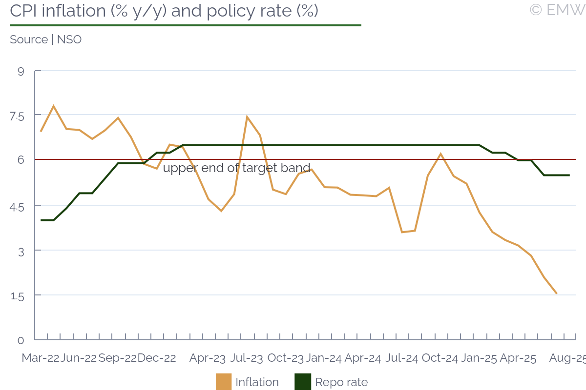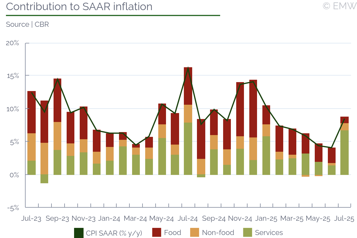 Next MPC announcement: September 18, 2025 Current policy rate: 7.0% EmergingMarketWatch forecast: 7.0% We maintain our interest rate call for the next MPC meeting at a hold, keeping the repo rate at 7.0%. While the July decision to cut by 25bps was in line with expectations, the SARB's latest guidance suggests that further easing is unlikely in the near term. The SARBS's policy focus has shifted toward achieving inflation at the bottom of the 3-6% target band, effectively anchoring at 3% instead of the previous 4.5%, without undermining credibility or fuelling exchange rate volatility. Inflation and growth outlook CPI inflation accelerated to 3.0% y/y in June, with core inflation at 2.9% y/y, placing both measures at the bottom of the SARB's 3-6% target range. The still low print was supported by a stronger rand and subdued goods price pressures, although food inflation edged higher, driven mainly by rising meat prices, and the decline in fuel costs slowed compared to earlier months. While the current readings support the SARB's shift toward a 3% inflation anchor, the bank expects and acceleration in the second half of the year driven by base effects, food price pressures and slower declines in fuel costs. We forecast July CPI at 3.3% and expect stability in August. Achieving and sustaining the new 3% anchor will be challenging given persistent structural cost pressures, including public-sector wage increases and above-CPI electricity tariffs. On the growth side, Q2 GDP is likely to surprise on the upside after stronger-than-expected mining and manufacturing output in June. Industry alone could add 0.3-0.4 percentage points to headline GDP growth, while agriculture is expected to perform well on the back of the maize harvest and a forecasted rebound from last year's drought. This could be partially countered by the meat industry which has been hit by disease in the second quarter. The latest data published by the stats office also suggest that even with retail sales slowing in June, the sector should still make a positive contribution to Q2 GDP. Nevertheless, underlying growth remains weak, and the SARB has cut its medium-term growth forecasts to only 0.9% this year and 1.3% in 2026, though still forecasting an acceleration to 2.0% in 2027. Global and domestic risks Tariff risks have now materialised, with the imposition of higher US import charges on South African goods weighing on the rand. However, local asset performance has so far held up reasonably well, aided by broad dollar weakness. The SARB continues to flag global uncertainty as a key risk factor, noting that permanently higher tariffs or renewed geopolitical tensions could disrupt global trade and capital flows. The extended hold in US interest rates is also a headwind for emerging market assets, including South Africa. Policy implications Given the SARB's commitment to the new 3% inflation anchor, the recent rand volatility, the likelihood of rising inflation in H2, and persistent external risks, we believe the MPC will prefer to pause at 7.0% in September. While the real policy rate remains high, the Bank appears willing to maintain a restrictive stance until the inflation outlook is more firmly anchored at its new objective. Monetary Policy Committee Statement | |||||||||||||||||||||||||||||||||||||||||||||||||||||||||||||||||||||||||||||||||||||||||||||||||||||||||||||||||||||||||||||||||