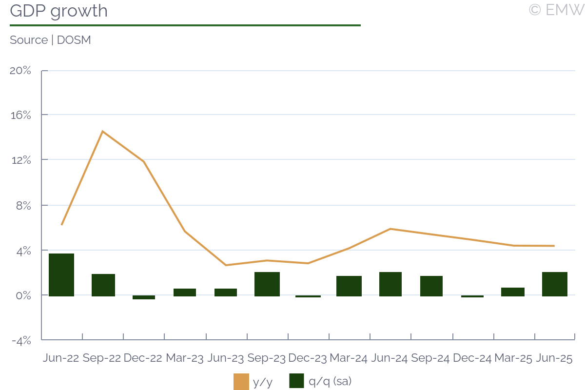 In line with market expectations, Bank Negara Malaysia on September 4 left the overnight policy rate unchanged at 2.75%. Compared to July, when the key rate was cut for the first time in five years as a pre-emptive move to support growth, the central bank sounded a bit more optimistic about the country's economic prospects, citing resilient domestic demand and easing global trade uncertainties. The comparatively favourable outlook was reinforced by Malaysia securing a 19% tariff on exports to the US, lower than the 25% previously threatened by President Trump. BNM may also have wanted to assess the impact of US tariffs and the July 25bps rate cut on the economy before taking further action. Overall, the central bank deemed the current monetary policy stance appropriate and supportive of the economy. This guidance, which was absent from the July monetary policy statement, suggests that the OPR will likely remain on hold in the near term and supports our view that the July adjustment was a one-off move rather than the start of an easing cycle. That said, another rate cut in 2026 cannot be ruled out if the growth outlook deteriorates. With inflation in check and the ringgit strengthening, BNM has sufficient policy space to deliver another rate cut should conditions warrant. GDP growth BNM stated that Malaysia's GDP is on track to expand between 4.0% and 4.8% in 2025 - a forecast that was revised down in July from 4.5%-5.5% to reflect the negative impact of US tariffs on the economy. In the first half, growth clocked in at 4.4%, underpinned by sustained consumer spending and investment activity, highlighting solid domestic fundamentals. Domestic demand is expected to remain a key growth driver in 2026 amid lower borrowing cost, favourable labour market conditions, and continued high realization of approved investments. In addition, strong overseas demand for electrical and electronics goods, which account for nearly one-fifth of total manufacturing output, together with robust tourism activity could further lift growth prospects. While exports have stayed resilient so far, rising 4.3% y/y during Jan-Jul despite weaker oil and gas shipments, US tariffs, including a potential levy on semiconductors, pose a significant downside risk to the outlook. That said, Malaysia's export competitiveness may remain largely intact, given that other major export-oriented ASEAN countries generally face similar tariff rates. Moreover, the government has expressed confidence that most of Malaysia's semiconductor exports to the US will be shielded from the Trump's proposed 100% tariff on imported chips. Last month, Investment, Trade and Industry Minister Zafrul Abdul Aziz told the parliament that 65% of Malaysia's semiconductor exports to the US originate from US companies operating in Malaysia, allowing them to qualify for tariff exemption. Inflation environment Price pressures remain subdued, with CPI inflation rising 1.2% y/y in July, edging up from over four-year low of 1.1% y/y in June. During Jan-Jul, the headline figure averaged 1.4%, down from 1.8% in the same period last year. As a result, BNM in July lowered its inflation forecast to 1.5%-2.3% in 2025, down from the earlier projection of 2.0%-3.5%. The central bank continues to have benign outlook for inflation, noting that both headline and core inflation (averaging 1.9% in Jan-Jul 2025, up from 1.8% in Jan-Jul 2024) are likely to remain moderate this year and in 2026 due to contained global cost conditions and absence of excessive demand pressures. It reiterated that domestic policy reforms - both announced and upcoming, such as SST expansion and rationalization of RON95 petrol subsidy - are likely to have limited impact on inflation in the current environment. Exchange rate BNM did not provide any commentary on Malaysia's exchange rate in its latest monetary policy statement - an unusual omission, though the reason remains unclear. Nevertheless, the central bank is likely taking comfort from the strengthening of ringgit, which has appreciated by 6% against the US dollar so far this year, partly supported by foreign inflows into the bond market. The country's external position continues to improve, with international reserves rising to USD 122.7bn as of end-August - the highest since Nov. 2014. This gives BNM greater capacity to curb exchange rate volatility if necessary. Conclusion All in all, we expect BNM to maintain the OPR in the near term, provided growth remains within the central bank's forecast range and inflation stays under control. The central bank is likely to adopt a wait-and-see approach for an extended period to assess the impact of the recent rate cut as well as the earlier 100bps reduction in the statutory reserve requirement (SRR) ratio in May, which brought it down to a 14-year low of 1%. The SRR cut is expected to inject around MYR 19bn in liquidity into the banking system. Further Readings | |||||||||||||||||||||||||||||||||||||||||||||||||||||||||||||||||||||||||||||||||||||||||||||||||||||||||||||||||||||||||||||||||