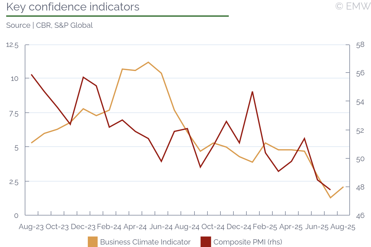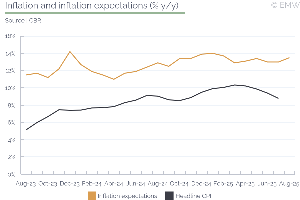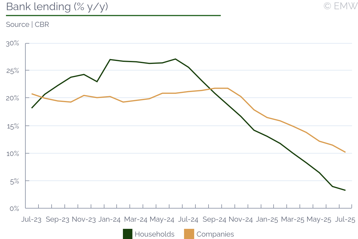 With the market consensus split almost equally between a 100bp and a 200bp rate cut on Friday, we find ourselves in the more dovish camp, expecting the regulator to make a larger cut ahead of October. By the time of the October meeting, the CBR will have fresh fiscal projections and an updated economic outlook for next year. Based on recent data and official comments, the slowdown of the economy is running ahead of budget capacity, with the high policy rate seen as the key factor. Thus, the regulator might need to act at the fastest possible pace for now. There is still a significant chance of the key rate being cut to 14% by year-end, with the CBR taking a pause in October, but not this time. Until now, the central bank has moved with gradual cuts and cautious projections, and we believe easing decisions remain uncomfortable for it. That is unsurprising, given that previous easing cycles often ended in renewed inflation. And despite that, this time the situation suggest easing the policy. One big argument for a larger cut is the inflation trend. The CBR expected inflation to fall to 8.5% y/y at the end of Q3, but this level was already reached in July, with seasonal disinflation arriving earlier than last year. As of Sep 1, CPI inflation stood at 8.3% y/y, meaning seasonally adjusted inflation in August is to remain below target at 8.3-8.4% (we are to see the data on Wednesday). While this improvement enables a bigger cut at the upcoming meeting, inflation could still exceed 7% by year-end, the ceiling of the CBR forecast range, once seasonal effects fade and the strong ruble loses impact. Which we think supports the idea of a larger cut this time and a possible hold in October. Another argument for easing is bank lending. Corporate lending grew by 10.2% y/y in July, the weakest in two years. While August data is not yet published, we expect the trend to remain largely unchanged. Household lending decelerated further to 3.3% y/y, the lowest since the invasion of Ukraine. That reflects not only savings activity, but also falling demand. The CBR has long ago admitted that the policy rate has less direct influence on lending due to high incomes and subsidized programs. Still, it affects consumer behavior, which matters as budget spending is reportedly to be cut. As for the corporate segment, which was a triggering indicator, much longer than the consumer one, we believe rate cuts can now decelerate demand in the short term, as companies see CBR follows its own projections of 2025 key rate, so there are more cuts ahead. Negative signals come from the real sector, which is building pressure on the CBR to accelerate rate cuts. GDP growth slowed to 0.4% y/y in July vs. 1.1% in Q2 and 1.4% in Q1. The FinMin cut the annual growth outlook to 1.5% from 2.5%, while industry growth slowed to 0.7% y/y, supported mainly by manufacturing on the back of defense-related output. Retail sales growth remains muted at 2% y/y, though it accelerated slightly as real wages continue to grow on the back of labour shortages. Real wages were up by 5.1% y/y in June, the highest since January, while nominal wages climbed above the RUB 100,000 mark for the first time (outside of December when wages are much higher due to bonus payments). The unemployment rate dipped to a new record-low level of 2.2% back in May and has stayed there, while Putin publicly spoke about the growth of shadow employment. PMI and BCI surveys show stronger labor demand, which could put more pressure. The economy is certainly cooling, raising concerns about whether this slowdown is manageable. CBR faces a choice between lowering rates to support investment and lending, or risking labor market strain. Inflation expectations data are somewhat mixed. On the one hand, we saw household inflation expectations rising to 13.5% y/y in August, but the level generally stays elevated this year. It was likely caused by the one-time effect of the first higher utility bills received after the tariff indexation in July, and with a temporary lag, seasonal price increases for vegetables and fruits will provide additional momentum by the year-end. The BCI survey suggests some improvement in the situation, while the PMI survey remains mixed, as service and manufacturing segments had different attitudes in price policy. We expect the CBR not to pay too much attention to inflation expectations this Friday. External political and economic factors also favor a cut. Despite the regulator's cautious policy of keeping the ruble strong in order to curb import price growth, current oil price dynamics suggest that additional support for exports is important at this stage. Thus, a rate cut could weaken the ruble, which would be beneficial for the budget. The current state of the diplomatic peace negotiations with Ukraine is also causing increasing concern, and the CBR should want to relieve the real sector of excessive barriers in the form of an 18% rate. | |||||||||||||||||||||||||||||||||||||||||||||||||||||||||||||||||||||||||||||||||||||||||||||||||||||||||||||||||||||||||||||||||