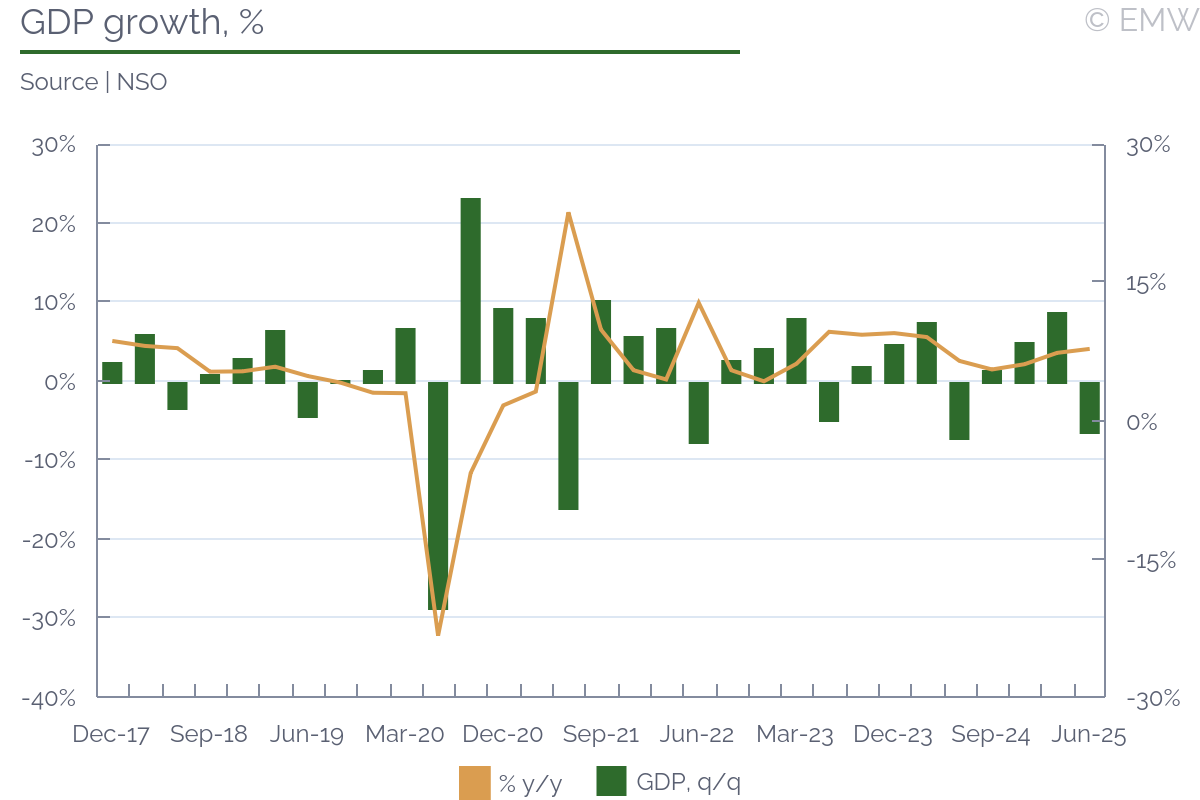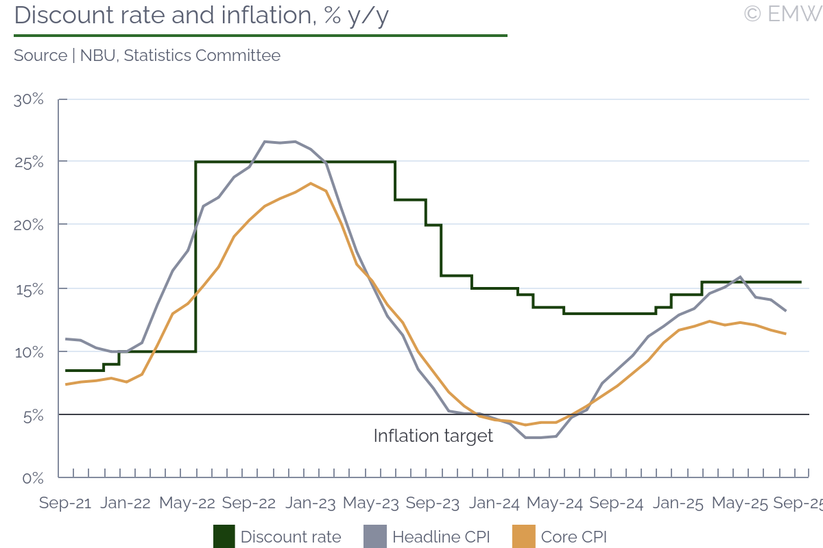 The board of the central bank (NBU) on Sep 11 decided to keep the key rate on hold at 15.5%. This was the fourth on-hold decision in a row, and it was expected. The NBU said that the headline CPI disinflation - down to 13.2% in August from 14.1% y/y in July - was faster than anticipated, while core inflation decline - down to 11.4% from 11.7%, respectively - was in line with expectations. Among the factors behind disinflation this past summer, the NBU listed a new harvest, labour market stabilisation, better inflation expectations, and sufficient external financial assistance so far this year. The NBU expects that disinflation is likely to continue this year. This means that easing is likely. At the same time, Russia's war remains the main risk to inflation, given the increasing defence spending and uncertainty over what direction the war might take. The NBU signalled that it could revise its plan to start an easing cycle at end-2025, if the war situation deteriorated. The next MPC meeting is scheduled for Oct 23. As things stand now, the NBU is likely to cut the main rate by 50bps to 15.0% by end-2025, in line with its summer projection.