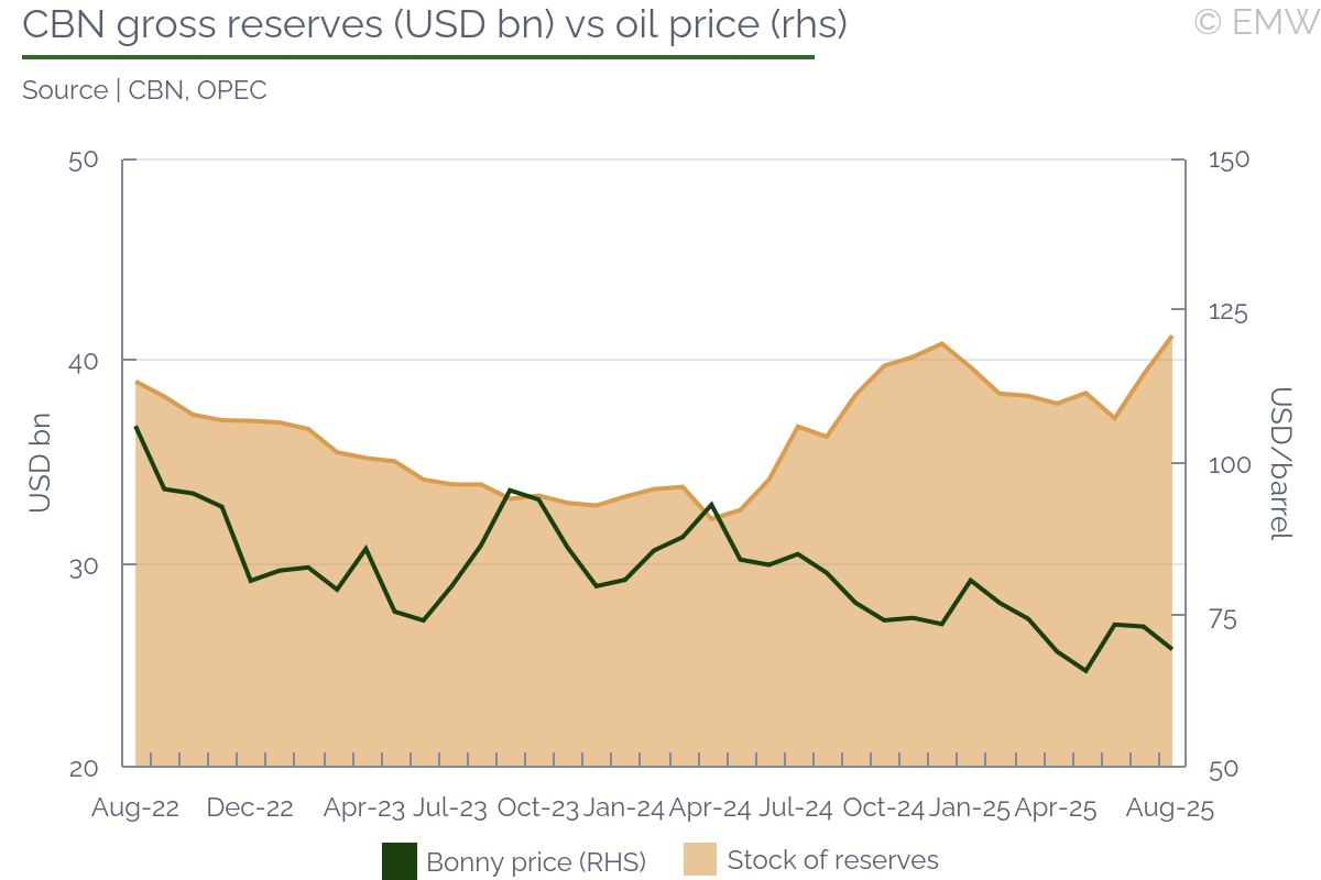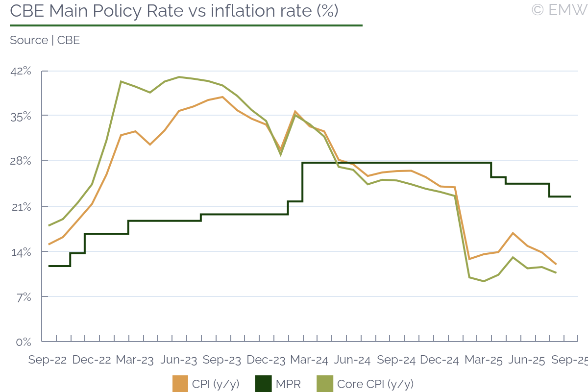 The MPC's decision to lower the monetary policy rate by 50bps to 27% on Monday (Sep 23) was based on both recent data and forward-looking projections, according to CBN governor Olayemi Cardoso. He revealed that CBN staff expect continued declines in inflation through the end of 2025, driven by the lagged effects of previous rate hikes, stable exchange rates, falling petrol prices and the seasonal increase in food supply as the harvest progresses. Cardoso said improved crude oil production and rising capital inflows are also easing inflationary pressures and helping anchor expectations. All 12 MPC members supported the rate cut, the first in 5 years. The MPC will next meet in November and we anticipate another cut if disinflation continues. Nigeria's rate cut aligns with a broader trend across Africa as Ghana recently lowered its policy rate to 21.5% and Kenya to 9.5%, although Nigeria's rate remains the highest on the continent due to still-elevated inflation pressures. Analysts note that the easing signals confidence in the stability of Nigeria's FX market, backed a healthy current account surplus and higher reserves. Gross external reserves rose to a record USD 43.05bn as of September 11, providing an 8.28-month import cover. The MPC also discussed progress in bank recapitalisation, with 14 banks meeting new capital thresholds. Earlier in July, only 8 banks had met the threshold. Analysts view the 14-bank milestone as a positive step but warn that consolidation is likely as the deadline approaches in March 2026. In addition to the rate cut, the CBN reduced the cash reserve ratio (CRR) for commercial banks from 50% to 45% in an effort to stimulate lending and economic activity. A new 75% cash reserve ratio was also introduced on non-TSA public sector deposits. The committee cautioned that the banking system has excess liquidity mainly due to government fiscal releases. The new CRR measures are intended to absorb this surplus and help to control inflation. Monetary Policy Committee Statement Monetary Policy Committee Meeting Schedule