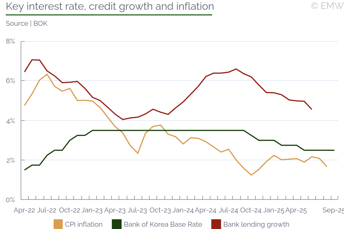 The Bank of Korea is likely to resume easing policy in its next policy meeting on Oct 23 after staying on hold for two consecutive meetings in July and August. The central bank cited the heated real estate market as the main reason for its wait-and-see approach. In particular, the central bank wanted to assess the impact of macroprudential measures taken in late June and early July on real estate prices. However, the central bank's policy stance remains accommodative and 5 out of the 6 members on its monetary policy board expressed a view in August that interest rates will fall over the next 3 months. In our view, Bank of Korea is still likely to cut rates two more times in 2025 and bring the policy rate to 2.00% by end-2025, as we expect it to deliver 25bps rate cuts in both October and November. At the same time, we think that the prospects for more rate cuts in 2026 have diminished after the government indicated that it will pursue loose fiscal policy with Budget 2026 and it will narrow only marginally the fiscal deficit in 2026 compared to the second supplementary budget of 2025. In our view, BOK's easing stance in the rest of 2025 will be also supported by the dovish Fed which is also expected to resume rate cuts in September. Moreover, the prevailing market expectations are that there will be 2 or 3 small rate cuts by the Fed in the rest of 2025, setting a dovish tone for other central banks. Importance of real estate prices likely to diminishReal estate prices in Seoul have started to cool down in August and the government has clearly stated that it will implement more real estate market stabilization measures if needed. As there is sufficient time until the October meeting for previously-adopted measures to be fully reflected in real estate prices and the government to implement additional macroprudential measures, if needed, we think that real estate prices will become less of a concern for the central bank. Overall, we remain optimistic that real estate prices can be controlled with macroprudential measures, and the current rate of real estate price growth will not be an obstacle for rate cuts. To note, apartment prices in Seoul rose by 0.08% w/w in the first week of September, but the central bank cut rates in February and May when apartment prices in Seoul were rising at quicker weekly rates. Tariff uncertainty could impact policy rate decisions yet againThe uncertainty regarding the implementation of the US-Korea tariff agreement from late July could impact BOK's policy rate decision yet again as the US continues to delay the executive order to lower tariff on South Korean goods. In particular, the two sides remain at odds over the terms of the USD 350bn investment pledge that Korea made to receive the same 15% tariff rate given to Japan and the EU. The Korean government has given signals that it considers unacceptable the investment conditions agreed by Japan, which include a commitment to invest directly into the US the full size of the investment package by the end of Trump's term. In particular, the Korean government has made it clear that it cannot raise more than USD 20-30bn per year to invest in the US due to FX market limitations. Thus, South Korea is unlikely to reach a final trade agreement with the US in the near future, which will create a tariff gap with competitors in Japan that have already transitioned to lower tariff rates. On the other hand, if South Korea folds and accepts similar conditions as Japan, the repercussions for the local FX market will be significant and could put significant pressure on the won. Either way, BOK is likely to continue to monitor closely the progress on the tariff deal implementation. Inflation remains subdued, fiscal stimulus boosts private consumptionCPI inflation stood at just 1.7% y/y in August, falling below the 2% central bank target for the first time in 8 months. That said, inflation was impacted by a temporary 50% mobile fee cut by SK Telecom in August due to a hacking incident, and prices could return above 2% in September when the fee cut ends. At the same time, food prices accelerated to 4.9% y/y growth in August, posting the highest increase in 20 months, which continues to exacerbate consumers' inflation perceptions. On the positive side, private consumption has rebounded due to the consumption coupons included in the second supplementary budget, with retail sales rising by 2.4% y/y July. However, private consumption momentum is likely to dissipate after September when the coupon program expires unless the government approves additional stimulus measures. Meanwhile, construction output remained a serious drag on growth as it fell steeply yet again by 14.3% y/y in July. Industrial output rose by 5.0% y/y in July as it continued to be propped up by robust semiconductor demand. That said, we expect US tariffs to start impacting external demand more pronouncedly in late 2025. First because of the temporary tariff gap that has opened with Japan, and second because companies will have to start raising prices eventually because they can't continue to internalize tariffs. At the same time, the construction downturn is not expected to be reversed any time soon. ConclusionBank of Korea remains in an easing cycle and is likely to resume rate cutting in October as its concerns about rising real estate are likely to be alleviated by macroprudential measures. In addition, Fed's expected dovishness is also going to strengthen the case for rate cuts. Even through the economy remains in relatively good shape as of Q3 and private consumption has been propped up by fiscal stimulus, we think that the impact of US tariffs will finally start to impact negatively growth in late 2025, which warrants additional rate cuts by the BOK. Useful Links | |||||||||||||||||||||||||||||||||||||||||||||||||||||||||||||||||||||||||||||||||||||||||||||||||||||||||||||||||||||||||||||||||