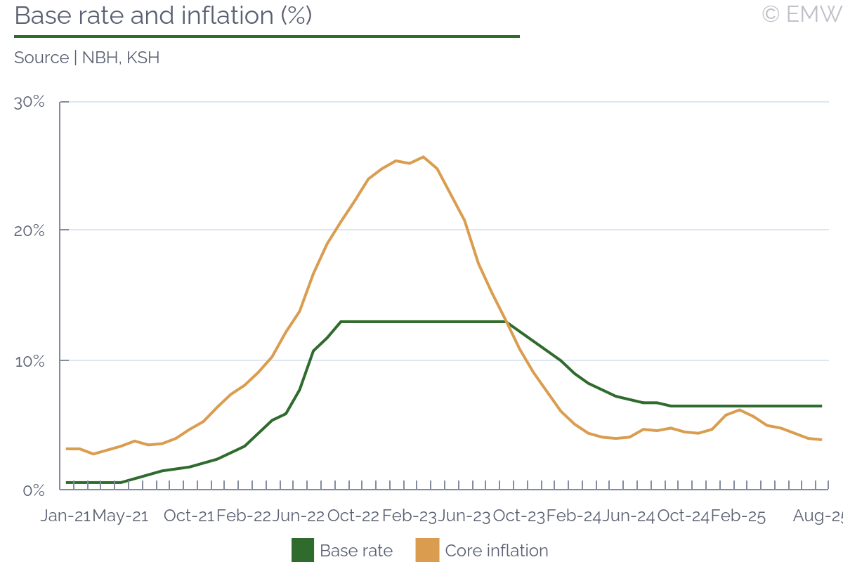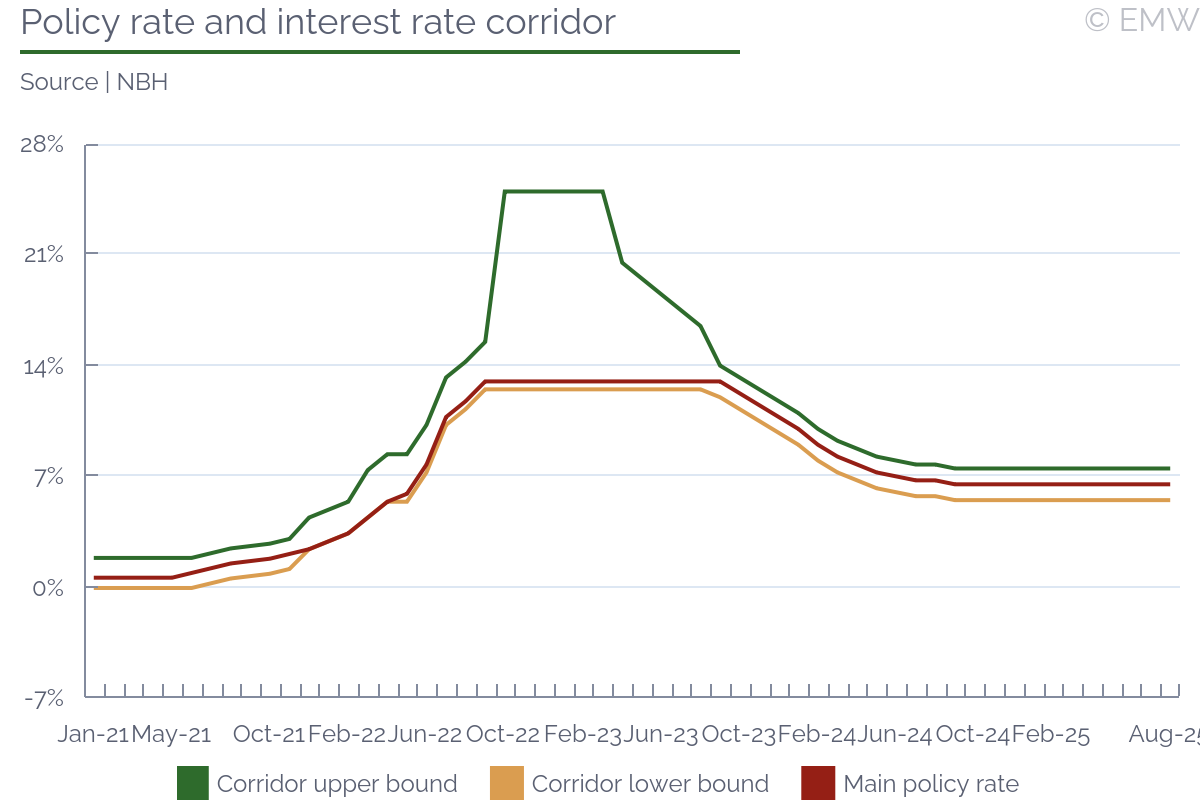 The MPC is likely to continue its no-change policy on the next meeting in September and this stance is likely to be maintained in the longer term as well. The MPC last kept the policy rate unchanged at 6.50% on its meeting in August and also maintained the overnight interest rate corridor at 1pp around the policy rate. The decision was unanimously expected as it fit the policy guidance for a prolonged hold on the policy rate. According to the updated NBH forecasts, inflation will remain above the 4.0% upper band of the tolerance range around the 3.0% mid-term inflation target and will start slowing as of early 2026. The mid-term objective was expected to be achieved in the beginning of 2027. Recent inflation developments showed that corporate pricing behaviour remained strong outside the margin cap limits, the NBH has pointed out in August. The MPC continued to highlight its prioritisation of the price stability objective over any stimuli for economic growth, according to its statement after the August meeting. It repeated the main elements of its policy guidance and NBH governor Mihaly Varga specifically emphasised that the policy guidance was unchanged from the earlier months. Monetary policy will continue to be based on a cautious and patient approach, in our opinion implying the lack of prospects for quick changes in the policy stance. Tight monetary conditions have to be maintained because of uncertainty and inflationary risks related to the geopolitical and global trade conflicts, it said. Ensuring positive real interest rates remained an explicit feature of the monetary policy stance. Consumer inflation expectations have eased recently but remained elevated and their level was not in line with the price stability objective, Varga highlighted after the meeting. Increased tariffs have added to inflation expectations, the MPC warned further. The increase in global food prices and sustained market services inflation represented additional pro-inflationary risks, it pointed out. The fight against inflation was not over yet, Varga cautioned, in our opinion highlighting that monetary policy easing cannot return to the agenda yet. The MPC approved a surprise cut in the reserve requirement ratio on its meeting in July. The ratio was cut by 2pps to 8% as of Aug 1, while the non-interest bearing share of the required reserves was left at 2.5% of the reserve base. The loosening of the reserve ratio followed the gradual decline of the excess liquidity of the banking system in H1 and will ensure that liquidity developments are neutral towards the monetary transmission, the MPC highlighted. The reduction of the reserve ratio therefore does not mean a change in the continued tight stance of monetary policy, it stressed. Varga also underlined that the adjustment of the required reserve ratio should not be considered a change in the monetary policy stance and explained that it was meant to counter the tightening of liquidity from the expiration of the five-year collateralised loans that were disbursed as support for the banking sector during the coronavirus epidemic.