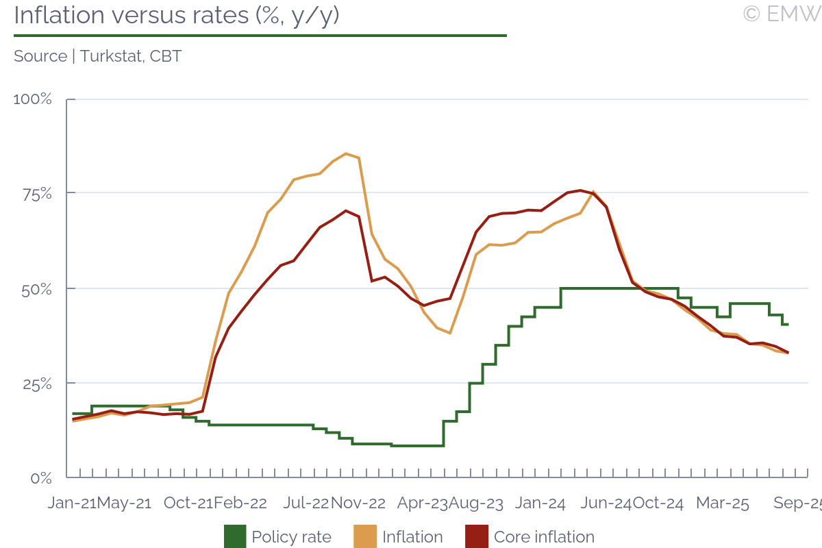 We anticipate the CBT will preserve its monetary accommodation path at the forthcoming MPC meeting and we expect the CBT to cut the policy rate by 200-250bps. This recalibration rested on four pillars. First, we expect the CPI to register about 2.1% m/m in September, materially below last year's 2.97%, mechanically lowering the y/y rate to roughly 31.8%. With the policy rate at 40.5%, the ex-post real policy rate stood near 8.7pps on headline CPI. Such a cushion might afford the CBT scope to deliver a further step in the easing cycle without immediately compromising disinflation credibility. Second, Turkey's recent CDS traded below its level preceding the Mar 19 detention of IMM mayor Ekrem Imamoglu, yet that compression reflected event postponement rather than resolution. The court adjourned the CHP congress annulment case to Oct 24, declined the precautionary reinstatement request for the party's former leadership and boards, and thereby deferred, not removed, political risk. The MPC decision will therefore precede a consequential legal milestone by one day, leaving markets exposed to headline risk that could reprice the term structure and narrow the CBT's tactical room. Third, market colour indicated the CBT intervened heavily to stabilise the currency last week prior to the court case, with reported sales north of USD 10bn. Should the court's next stance shift against the CHP, or should investigations targeting CHP-led municipalities broaden, most recently the Bayrampasa operation, where the mayor and several suspects were detained, FX stability could come under renewed pressure. A resurgence of depreciation expectations would tighten financial conditions through the FX channel and argue for the smaller end of the envisaged rate-cut corridor to preserve market functioning. Fourth, the latest GDP release signalled firm activity. Demand has cooled but not to the degree needed to anchor disinflation swiftly, in our assessment. This tension was clear in the CBT's target year-end inflation at 24% and upper bound forecast of 29% upper bound-versus our 30.5% expectation. In this regard, we infer that the output gap dynamics and sticky services disinflation argued for calibrated easing, stringent liquidity management and a communication stance that conditioned future steps on realised disinflation rather than calendar-based commitments. In practical terms, this favours a base-case 200bps cut with guarded guidance, while a 250bps move remains feasible only if post-MPC political headlines and FX conditions stayed benign enough to avoid risk-premium slippage. Against this backdrop, governor Fatih Karahan's recent tone remained cautiously dovish on disinflation prospects. We therefore judge the MPC will choose between the lower and upper edges of the 200-250bps range as a function of three near-term variables - the September CPI run-rate and breadth, day-after political developments around the CHP case and the immediacy of FX-reserve use required to maintain market stability. Therefore, our modal view favours 200bps with data-contingent forward guidance, while a 250bps outcome requires a clean political tape and contained FX pressure to safeguard the credibility of the disinflation trajectory. Summary of September rate-setting meeting (to be released on Sep 18) MPC rate decision in September | |||||||||||||||||||||||||||||||||||||||||||||||||||||||||||||||||||||||||||||||||||||||||||||||||||||||||||||||||||||||||||||||||