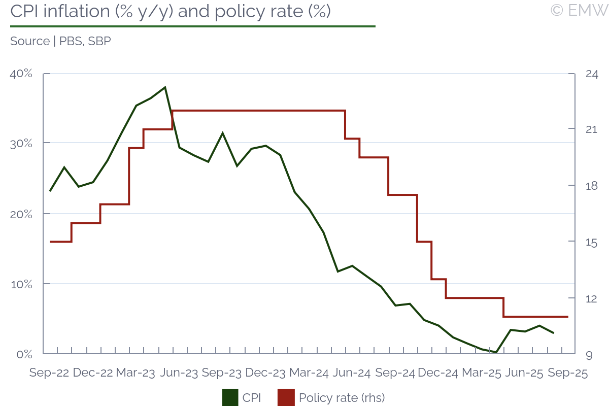 The State Bank of Pakistan (SBP) maintained the policy rate at 11.0% on September 15, marking the second consecutive meeting without a rate adjustment. The decision was widely anticipated, as the flood-induced supply shock had already led to shortages of perishable food items - including tomatoes, onions, and wheat flour - driving prices higher. While the SBP noted that inflation eased in August and economic activity continued to gain momentum, the near-term outlook has worsened slightly due to the floods, which devastated large swathes of farmland in central and southern Punjab. The resulting crop losses are expected to push inflation higher, widen the trade deficit, and weigh on economic growth. Nonetheless, the central bank downplayed the risk of significant damage to Pakistan's macroeconomic fundamentals. Expressing optimism about the economy's resilience compared with past major flood events - such as in 2022 - the SBP emphasised that the sharp inflationary and external account pressures witnessed after the previous floods are projected to remain contained this time. We believe that the monetary easing cycle, which delivered a cumulative 1,100bps of rate cuts since June 2024, has effectively ended. With the SBP projecting inflation to climb above 7% in the coming months, the real interest rate on a spot basis would drop below 4pps, from around 8pps currently. Given the IMF's emphasis on maintaining adequately positive real rates, we expect the policy rate to remain steady in the near to medium term. Inflation environmentCPI inflation eased to a four-month low of 3.0% y/y in August, down from 4.1% y/y in July. Core inflation also trended down, reaching a multiyear low of 7.8% y/y in rural areas. During Jul-Aug, the headline figure averaged 3.5% compared with 10.4% in the same period last year. The SBP expected price pressures to pick up, mainly due to higher food prices, with inflation projected to exceed the upper end of the 5%-7% target range for most of the second half of FY26. However, the food price shock was viewed as temporary. Combined with lower electricity tariffs, a stable exchange rate, and subdued global commodity prices, these factors were expected to keep inflation contained. Overall, the SBP maintained its FY26 inflation forecast at 5%-7%. GDP growthThe SBP said that the ongoing economic recovery is under threat from the recent floods. Losses to kharif crops would affect the agriculture sector, which, along with supply chain disruption,s could also dampen activity in the manufacturing and services sectors in the near term. As a result, the SBP turned slightly cautious, projecting GDP to come in near the lower end of its earlier 3.25%-4.25% forecast range, though still an acceleration from 2.7% in FY25. External sectorThe SBP projected Pakistan's goods trade deficit to widen as losses to crops - mainly cotton, rice, sugarcane, and vegetables - hurt food exports while lifting food imports. The country's food trade deficit already surged 11-fold y/y to USD 695.1mn in the first two months of FY26, primarily on account of higher palm oil imports and a decline in rice exports. This, together with a sharp rise in imports of vehicles, machinery, plastic materials, and iron and steel products amid economic recovery, pushed the overall trade deficit to USD 6.0bn, up from USD 4.7bn in Jul-Aug FY25. However, the SBP expected proved US market access following a recent trade deal to support exports, which posted a fractional 0.6% y/y growth in Jul-Aug FY26. Overall, the central bank kept its external sector outlook largely unchanged, projecting the FY26 current account deficit at 0-1% of GDP. Similarly, the forex reserves were forecast to rise to around USD 15.5bn by December 2025, up from USD 14.3bn as of September 5, supported by disbursements from multilateral creditors, including the IMF, bilateral debt rollovers, and sustained interbank purchases. ConclusionOverall, while the SBP remains confident in the economy's ability to absorb the impact of the floods, policy space appears limited going forward. With inflation risks tilted to the upside, the central bank is likely to prioritise price stability over growth. Until greater clarity emerges on the extent of crop losses and their second-round effects, the policy stance is expected to remain cautious. Therefore, we expect the SBP to maintain the status quo on the key rate in the near to medium term. Further ReadingsPrevious policy rate decisions | |||||||||||||||||||||||||||||||||||||||||||||||||||||||||||||||||||||||||||||||||||||||||||||||||||||||||||||||||||||||||||||||||