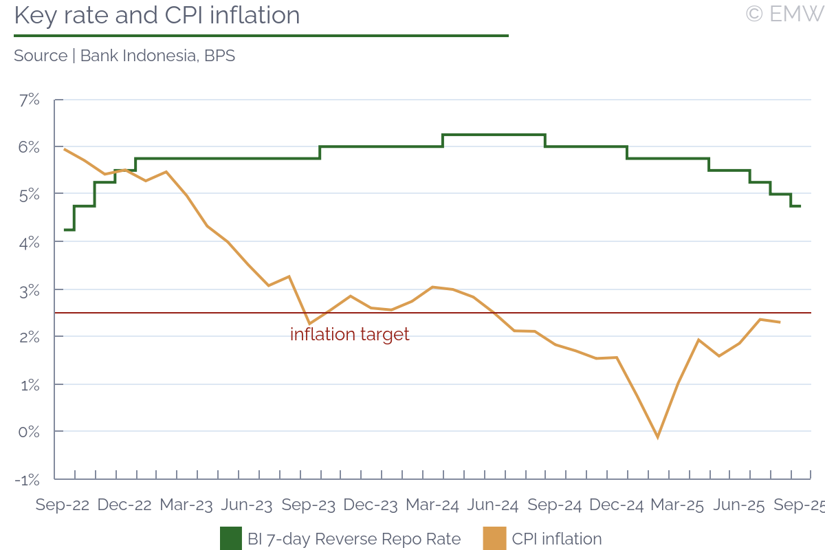 Bank Indonesia cut the key rate by 75bps cumulatively in the last three MPC meetings, bringing the monetary easing cycle to five rate cuts (125bps) since the beginning of the year. The central bank justified the rate cuts with the need to support GDP growth in a low-inflation environment, as the rupiah has stabilised against the dollar. So far, the central bank has become more and more dovish in light of the low inflation and economic growth slowdown. Moreover, CPI inflation remains subdued and below the midpoint of the central bank's 2.5+/-1% target band. Although it has started to rise, inflationary expectations remain firmly anchored to the central bank's target. GDP growthGDP growth accelerated to 5.12% y/y in Q2 from 4.87% y/y in Q1. Despite the surprising acceleration, BI proceeded with the latest rate cuts, attributing the strong GDP growth to the front-loading of exports to the US in anticipation of the introduction of the 19% import tariffs in August. BI has maintained its GDP growth forecast at 4.6-5.4%, while most IFIs and rating agencies have their forecasts even lower at 4.7-4.9% in 2025. In addition, the government also lowered its GDP growth forecast to 5.0% from 5.2% previously, though even this number now looks optimistic. Private consumption has been slowing down, dragging down overall GDP growth. On the bright side, export prospects have improved, particularly with the recent trade agreement with the US, which saw the US lower the import tariffs on Indonesian goods to 19%. Exchange rate stabilityThe rupiah has strengthened since the beginning of May, erasing some of the losses accumulated in March and April. As a result, its YTD depreciation has eased to about 1%, with the exchange rate now back into the USD/IDR 16,100-16,300 level. This has given the BI confidence to slash the key rate. The governor stated that Bank Indonesia will continue to use its tools to keep the local currency stable. In fact, the BI has been regularly intervening in the forex market since the beginning of the year, when volatility increased due to capital outflows seen in other EMs as well. Moreover, expectations for a Fed rate cut have given Bank Indonesia further confidence to slash the key rate as pressure on the rupiah has eased significantly. Inflation environmentCPI inflation accelerated to 2.31% y/y in August from 2.37% y/y in July, thus returning to more normal levels overall the last two months. Looking forward, inflation expectations have also shifted towards lower inflation this year, with most projections pointing to CPI inflation remaining below the midpoint of the central bank's 2.5+/-1% target band by the end of the year. The latest IMF forecast points to 1.7% CPI inflation this year. At any rate, Bank Indonesia expressed confidence that CPI inflation will remain under control and within the target band in 2025. This projection looks realistic, in our view, especially given the recent downward trend. As a result, BI had ample room to cut rates, given that inflation is well below its target. The impact of imported inflation also seems subdued, as despite the rupiah's weakening, CPI inflation has remained below the BI's target. ConclusionLooking forward, we expect Bank Indonesia to keep the key rate on hold in Q4, in a bid to evaluate the impact of the last three successive rate cuts. Instead, we expect BI to accelerate its government debt purchases on the secondary market in Q4, focusing on liquidity provision and stimulating credit growth. On the other hand, hopes for a Fed rate cut have grown due to the persistent low inflation in the US, which may prompt other central banks to follow suit and reduce rates as well. Further reading | |||||||||||||||||||||||||||||||||||||||||||||||||||||||||||||||||||||||||||||||||||||||||||||||||||||||||||||||||||||||||||||||||