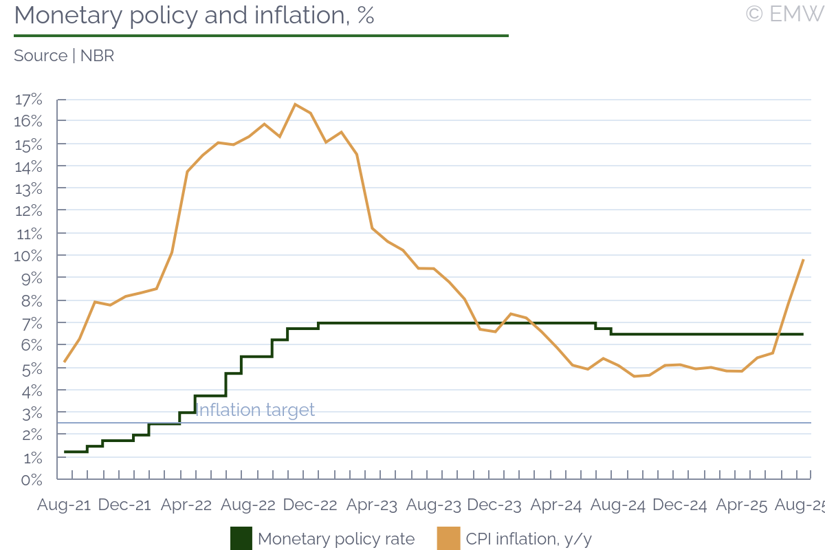 Rationale: Romania's central bank will very likely maintain the key policy rate at 6.50% in the Oct 8 MPC meeting and will very probably make no changes by the end of the year as well due to the high inflation that spiked in July to much-higher than expected 7.8% and is expected to continue gaining speed in the following months, as suggested by NBR governor Mugur Isarescu at the presentation of the August Inflation Report. The NBR assessed in its press release announcing the policy rate-hold decision on Aug 8 that the government fiscal measures package would exert significant pressure on inflation in Q3. Apart from that, food inflation has been on an upward trend too, but that might ease with the stabilisation of the RON rate after the government committed reforms to reduce the fiscal gap, we think. The high inflation is not expected to result in a rate hike either, Isarescu assured, adding that monetary policy was partly aimed at avoiding recession risks. He said that there were risks for a recession mainly due to external factors because of the export-dependency of the industrial sector, to which massive reduction in consumption is to contribute too. Acceleration of the EU funds absorption might offset those and the country might avoid a recession, however, the governor added. Isarescu said that economic growth might linger in the 0-1% range in the next year, according to his estimates. Inflation was higher than expectations in August, speeding up to 9.85% in the month from 7.84% y/y in July. Part of the jump was due to the removing of the electricity price caps, which impact turned out to be somewhat higher (2.2pps) than the one expected by the NBR (2.0pps), while the VAT rate hike to 21% from 19% contributed as well. Developments were in line with NBR estimations, which pointed to 1.6pps contribution from the VAT rate hike and 0.4pps from higher excises. Moreover, the central banks see inflation to likely remain above 9% at the end of this year after peaking in September, NBR governor Isarescu said, meaning that the inflation forecast of the NBR for 8.8% y/y at the end of 2025 is already outdated as it did not include the July and August prints. The fiscal consolidation measures are going to have a containing effect on private consumption and inflation will start falling gradually already at the start of 2026 and more visibly as of Q3 2026 after the higher base enters the calculations, according to the NBR. Thus, inflation will enter the target at the end of 2026 and will continue slowing down to 2.7% y/y in Q2 2027 as the fiscal consolidation measures are to assist in stabilising the country's economy. Thus, a rate cut for pushing up economic growth does not appear likely in the near future, we think. | |||||||||||||||||||||||||||||||||||||||||||||||||||||||||||||||||||||||||||||||||||||||||||||||||||||||||||||||||||||||||||||||||