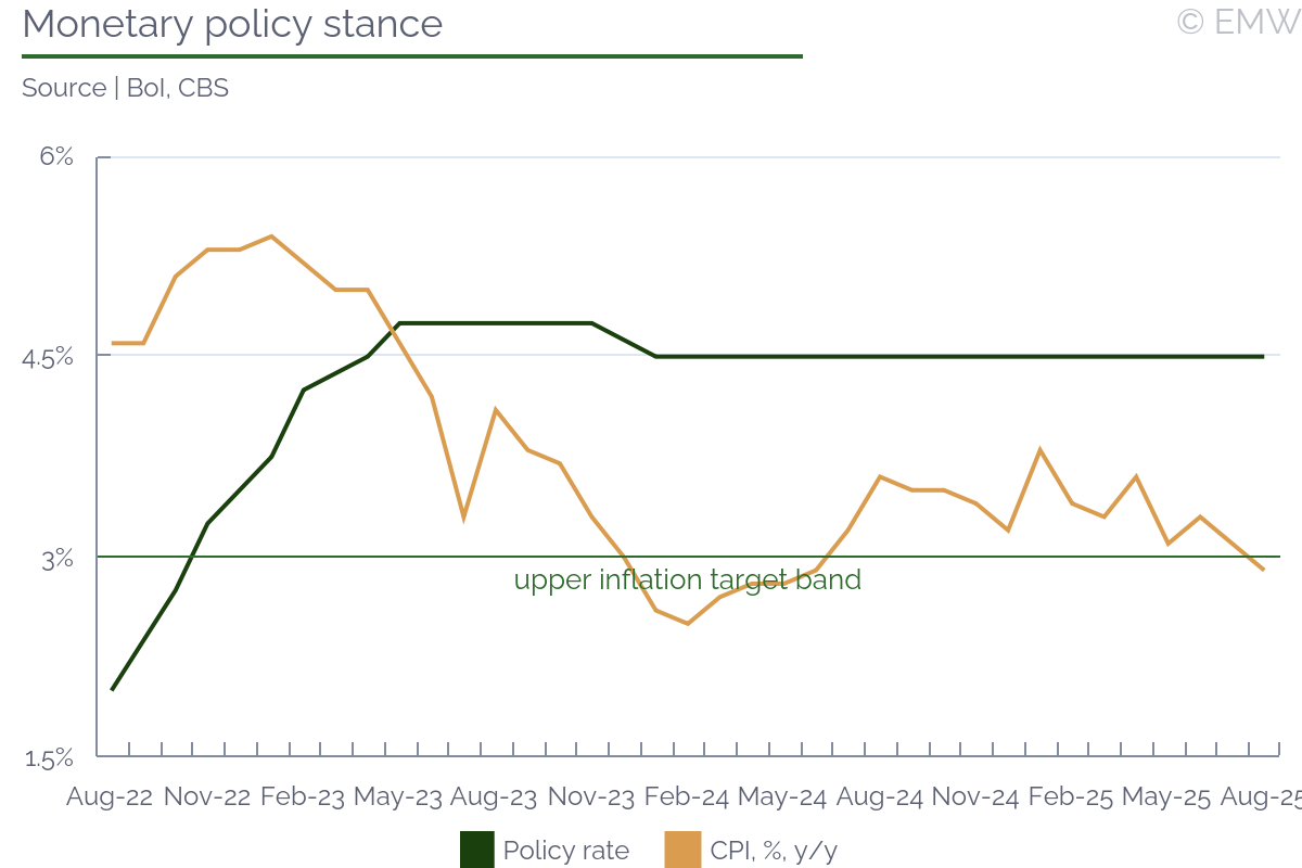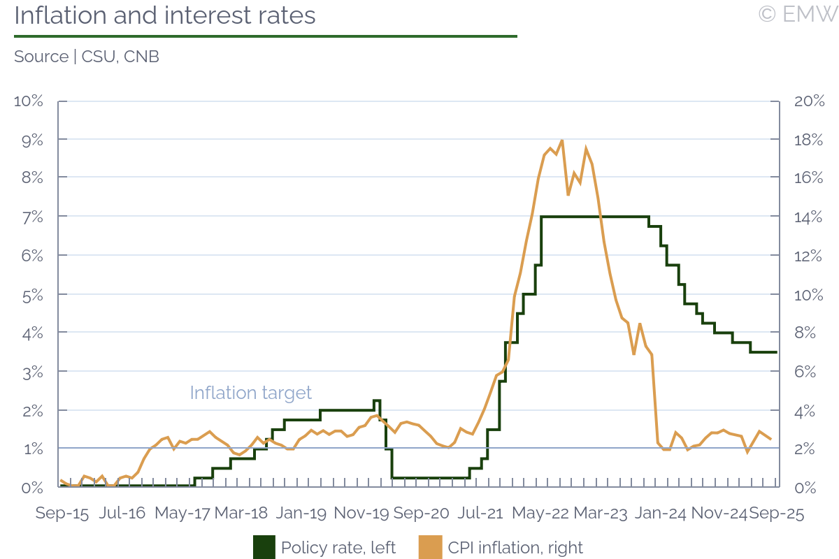 Rationale: The CNB board was very predictable this time, and there were no surprises. The vote to keep the policy rate unchanged at 3.50% was again unanimous, as in August, and economic conditions have not changed much since then. The tone of the post-meeting statement was again on the hawkish side, and the outlook continues to be perceived as inflationary overall. The potential impact of introducing the ETS2 in 2027 was added as an inflation risk, which only adds to inflationary factors. Meanwhile, the possibility for a slower-than-anticipated German growth was mitigated due to fiscal expansion. We expect to hear more of the same language after the post-meeting blackout ends when the minutes of the September MPC meeting are published on Oct 3. There was a surprising absence of disagreement on the monetary policy course in August, and we expect to see the same this time around. Furthermore, CNB governor Ales Michl said outright that the board did not mind a stronger CZK, and it was one of the reasons why the board did not believe monetary conditions needed to be tighter. Thus, it appears that the more hawkish-minded board members are happy with things as they stand, which is why we are likely not to see any hike proposals any time soon. We see the next inflexion point being the 2026 budget bill, which will be likely rewritten by the new government. Since this will likely happen in late February 2026, it will be after the first MPC meeting in 2026, scheduled for Feb 5, 2026. This is why we expect that the first opportunity for a shift in policy will be at the MPC meeting in March 2026, and not earlier. If ANO, which will likely lead the next government, makes good on its generous fiscal promises, then a rate hike will be the most likely response from the CNB. Michl has been hammering quite long about the risk from a fiscal expansion, so he will be expected to put his money where his mouth is. Even if he stalls, due to his close ties with ANO leader Andrej Babis, there are enough people on the board who will do the job for him. On the other hand, if ANO decides to remain orthodox and not hurry with spending expansion, then we may see a rate cut as early as in Q1 2026. Yet, we doubt the next government will make the CNB's job easy, which means that monetary conditions will only get tighter from where we stand.