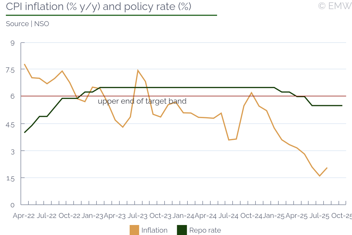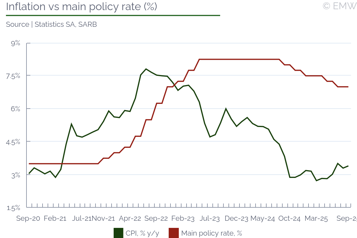 Next MPC announcement: November 20, 2025 Current policy rate: 7.0% EmergingMarketWatch forecast: 7.0% We maintain our forecast for a hold of the repo rate at 7.0% in November, consolidating the progress made in anchoring inflation near the new 3% objective. The CPI print in September at 3.4% y/y confirmed that the disinflation cycle remains broadly intact, with only mild upward pressure from base effects and rentals. Core inflation edged up to around 3.2% y/y, while food and fuel served to temper overall price momentum. Following cumulative cuts of 125 bps since late 2024, the MPC has shifted from active easing to consolidation, signalling that policy credibility now takes precedence over additional stimulus. The data show inflation stabilising close to the lower end of the 3-6% target band (despite the expected acceleration). Food inflation eased to 4.5% y/y, driven by declines in vegetables and dairy, while fuel prices remained in deflation for a thirteenth month, down 2.2% y/y. However, rental inflation accelerated modestly. With the SARB projecting inflation to average 3.4% in 2025, 3.6% in 2026, and settle at 3% by 2027, risks appear balanced but still warrant vigilance. Governor Lesetja Kganyago's recent remarks at the SA Tomorrow Investment Conference clarify that the central bank's strategy aims at "opportunistically disinflating" the economy and entrenching expectations, not chasing near-term growth. He has stressed that trade unions' inflation expectations are now lower than those of businesses noting that business expectations remain "sticky." They might be sticky but there is a central bank that means business, Kganyago was quoted as saying, and we will bring them down. The governor also linked the lower inflation target to South Africa's sovereign risk premium, arguing that credible disinflation reduces the cost of borrowing and aligns the country with its peers. If Fitch Ratings are correct in predicting the formal adoption of the 3.0% policy anchor by the Treasury in the MTBPS, the gains will become more entrenched and will continue to support the lowering of the cost of borrowing. Global dollar softness has helped the rand strengthen but the trade-related protectionist risks continue to linger and still constrain emerging-market appetite, indicating the need for caution amid volatile broader environment. The SARB's communication has persistently emphasised that monetary policy can only do so much without structural reform and fiscal coordination. Overall, we expect the majority of the MPC to prefer a hold, consolidating progress on inflation expectations and assessing the transmission of earlier cuts. Some of the members may still argue for a 25bps reduction, but we suspect the arguments to patience to prevail. With inflation to be anchored to the target over the policy horizon, growth stabilising, and credibility strengthening, the SARB can shift towards further easing depending on inflation expectations and actual prints next year. Monetary Policy Committee Statement | |||||||||||||||||||||||||||||||||||||||||||||||||||||||||||||||||||||||||||||||||||||||||||||||||||||||||||||||||||||||||||||||||