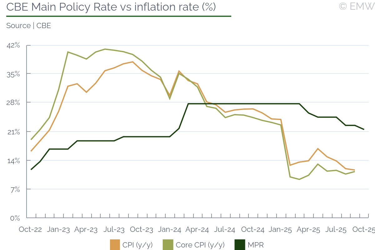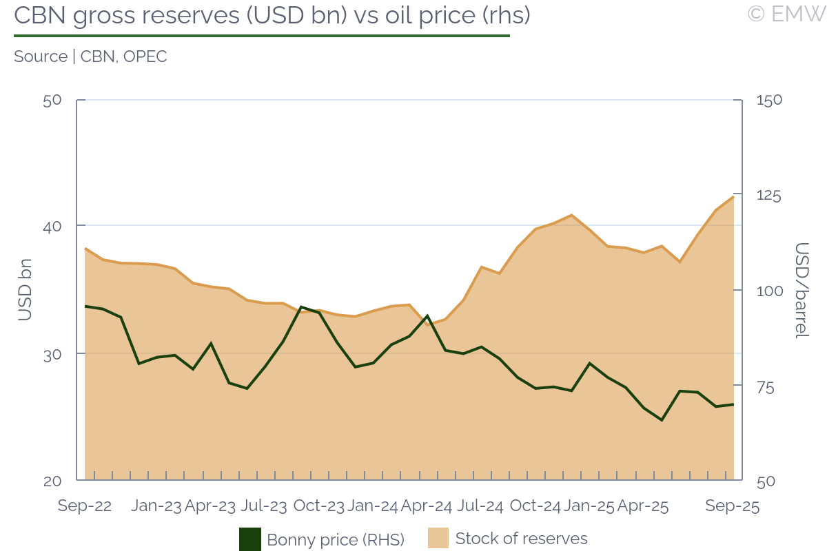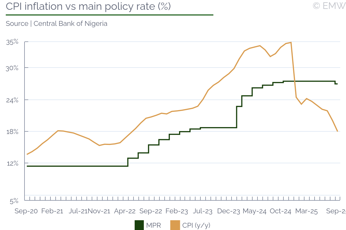 Following a m/m fall in headline inflation by 210bps in September, the MPC has flexibility to consider further rate cuts when it meets on 24 and 25 November. September's inflation rate of 18.02% marked six consecutive months of slowing inflation and the lowest rate in three years. The decline, which surpassed market expectations, was largely driven by a significant drop in food prices. When the MPC lowered the monetary policy rate by 50bps to 27% in September, this was largely due to CPI trends as of August (where inflation fell by 180bps m/m to 20.1%). CBN governor Olayemi Cardoso said in a statement that the cut was based on both recent economic data and forward-looking projections. In addition to disinflation, the MPC expressed satisfaction with improvements in output growth, stable exchange rates and robust external reserves. The committee concluded that this macroeconomic stability provides room for monetary policy to further support economic recovery. We anticipate continued stability and lower inflation for the month of October, which could lead to a more aggressive cut in the MPR (by 100bps) at the next MPC meeting. On foreign reserves, Cardoso was highly optimistic in his statement. He noted that sustained policy measures and renewed investor confidence had helped reserves rise to their highest levels since 2019. Gross external reserves reached USD 42.35bn as of end-September 2025. The CBN said the current account surplus also improved, reaching USD 5.28bn in Q2 2025 from USD 2.85bn in Q1. Strong oil exports and portfolio inflows drove performance. The stability of the naira in official and parallel markets has anchored inflation expectations and restored investor confidence, though dependence on oil revenues and capital inflows remains a vulnerability. Despite the easing in inflation, the MPC noted a persistent build-up of excess liquidity in the banking system, largely due to fiscal releases from improved government revenues. To absorb excess public sector funds, the CBN introduced the 75 percent CRR on non-TSA deposits. The CBN also intends to work closely with the ministry of finance to align fiscal releases with monetary policy objectives. Monetary Policy Committee Statement Monetary Policy Committee Meeting Schedule