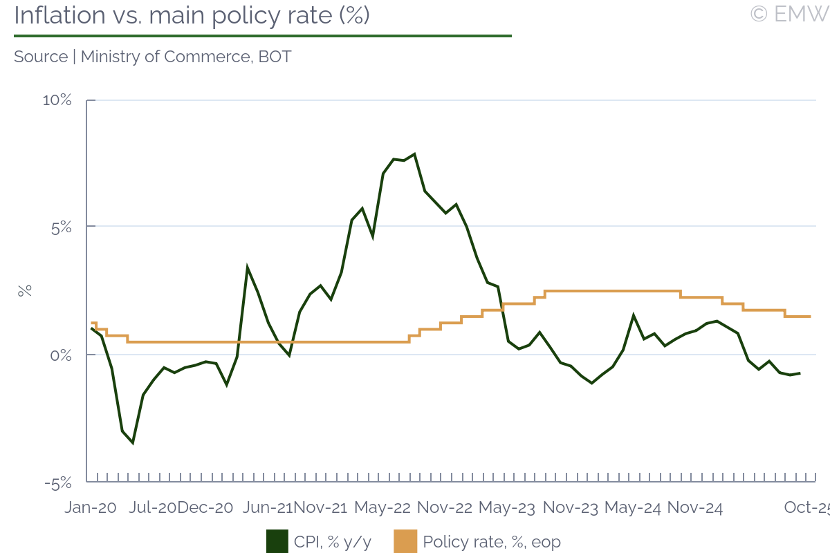A hold decision and a 25bp policy rate cut both seem possible at the next meeting of BOT's Monetary Policy Committee (MPC) on Dec 17, the last one for 2025, in our view. On Wednesday, the MPC voted 5 to 2 to keep the policy interest rate unchanged at 1.50%. Two MPC members favoured a 25bp cut. The decision was a moderate surprise, as the market expectations were for a 25bp cut. This was the first MPC meeting under Governor Vitai Ratanakorn. On Wednesday, the MPC assessed that monetary policy should be accommodative to support the economy. The transmission of previous key rate reductions to the economy is ongoing. Most MPC members prioritised the timing and effectiveness of monetary policy given the limited policy space and hence supported a hold decision. Two members supported further easing to ensure that financial conditions stay conducive to economic recovery, help support liquidity and mitigate the debt burdens faced by SMEs and vulnerable households. The prevailing monetary policy framework aims at maintaining price stability, supporting sustainable growth and preserving financial stability. The committee will monitor macro-financial developments and risks closely. The MPC is ready to adjust the monetary policy stance if the economic and inflation outlook shifts. One argument in favour of a policy rate cut in December is the expected deceleration of economic growth in 2026. The below-target inflation is another likely reason for a rate reduction, as well as the fewer-than-previously-expected foreign tourist arrivals. If it persists, the strong exchange rate of the baht against the US dollar will be also an argument in favour of a rate reduction. Reasons supporting a hold decision could be, among other things, the still high household debt and the need to preserve policy space. Economic growthThe MPC forecasts GDP growth of 2.2% in 2025 and 1.6% in 2026. In June, the projections were 2.3% and 1.7% respectively. Thailand's economy expanded by 2.5% in 2024. The goods exports have begun to experience the effects of US trade policies. The impact is smaller than previously expected, though. The value of goods exports is forecast to rise by 10.0% this year and fall by 1.0% next year. In June, the two growth rates were seen at 4.0% and -2.0% respectively. The value of merchandise exports climbed 5.9% in 2024. The MPC projects 33.0mn foreign tourists this year and 35.0mn next year. In June, the projections were 35.0mn and 38.0mn respectively. There were 35.5mn foreign tourists in 2024. The MPC forecasts moderate growth of private consumption and noted further support from government stimulus measures. The central bank forecasts that private consumption will rise by 2.1% in 2025 and 1.8% in 2026. In June, the two growth rates were expected to be 2.0% and 1.7% respectively. Private consumption increased by 4.4% in 2024. InflationHeadline inflation is now projected at 0.0% in 2025 and 0.5% in 2026, below the previous assessment mainly because of energy and raw food prices. In June, the two rates were seen at 0.5% and 0.8% respectively. The inflation is anticipated to stay subdued mainly due to supply-side factors, and to gradually return to the 1-3% target band by early 2027. According to the MPC, deflationary risks remain low as the prices of most goods and services keep rising or stay unchanged. Core inflation is forecast at 0.9% in each of 2025 and 2026. The private sector's medium-term inflation expectations are well-anchored within the target range. LendingIn line with previous key rate cuts, the interest rates in the banking system and the financial markets have decreased. Nonetheless, overall credit growth remains negative because of soft demand from large corporates, debt repayments, and cautious lending to high credit risk borrowers, particularly SMEs and low-income households. The growth of business and retail loans hence remained negative. While the credit quality is broadly stable, the SME loan quality deteriorates. The MPC also noted the appreciation of the baht against the US dollar, which affected some exporters. There is a need to monitor credit growth and movements of the baht, the press release said. The MPC supports helping vulnerable groups with additional targeted financial measures. Exchange rateThe exchange rate of the Thai baht was USD/THB 32.564 on Oct 8, which compares with USD/THB 32.305 on Aug 13, the date of the preceding MPC meeting. On Wednesday, the MPC noted the appreciation of the domestic currency against the US dollar since early 2025. The effective exchange rates have been relatively stable. The strengthening of the baht affected exporters significantly, especially in agricultural, agro-manufacturing and textile industries, as well as unhedged SME exporters, the BOT said. The MPC hence sees a need to monitor exchange rate movements. Further reading | |||||||||||||||||||||||||||||||||||||||||||||||||||||||||||||||||||||||||||||||||||||||||||||||||||||||||||||||||||||||||||||||||
