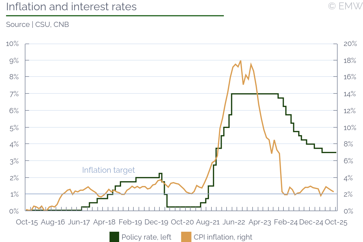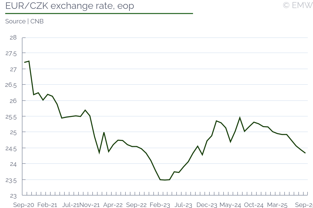 Rationale: The CNB board was very predictable this time, and there were no surprises. The vote to keep the policy rate unchanged at 3.50% in September was again unanimous, as in August, and economic conditions have not changed much since then. The tone of the post-meeting statement was again on the hawkish side, and the outlook continues to be perceived as inflationary overall. The potential impact of introducing the ETS2 in 2027 was added as an inflation risk, which only adds to inflationary factors. Meanwhile, the possibility for a slower-than-anticipated German growth was mitigated due to fiscal expansion. The minutes showed a broad consensus, though we did see some dovish notes from Jan Prochazka. Nevertheless, the overall impression was that the CNB board is still very much entrenched in its current position, and would rather leave interest rates stable for a while. Furthermore, there was broad agreement that a strong CZK is aiding efforts towards taming inflation, so there is no desire to do something about it. A tight labour market was very much into the board's attention, given that wage growth in Q2 once again exceeded the CNB's projections. This chimes with the remark of CNB governor Ales Michl that the board did not mind a stronger CZK, and it was one of the reasons why the board did not believe monetary conditions needed to be tighter. Eva Zamrazilova was her usual hawkish self, arguing that household consumption was too strong, and that wage growth only fuelled it further. Communication has been sparse this time around, though there is still time until the blackout for monetary policy comments expires. In this case, it most likely means that the CNB board has not shifted its stance considerably. The September inflation data did show a headline inflation nearing the 2% target, but it was entirely due to food prices. Meanwhile, core inflation has likely remained elevated, at 2.8% y/y, which is the indicator that currently matters more to the CNB board. While the economy is showing signs of a slowdown, its source is still primarily manufacturing, even though household spending may be losing some steam as well. Yet, as service price inflation has remained sticky, and looks to be at that level for a while, we don't see inflation numbers changing the CNB board's current position. Headline inflation could easily end up around 2% y/y in October as well, with food prices again being the main factor, while core inflation remaining high. Service producer prices have actually shown a faster increase in September, so structural factors are still in play. We see the next inflexion point being the 2026 budget bill, which will be likely rewritten by the new government. Since this will likely happen in late February 2026, it will be after the first MPC meeting in 2026, scheduled for Feb 5, 2026. This is why we expect that the first opportunity for a shift in policy will be at the MPC meeting in March 2026, and not earlier. ANO leader Andrej Babis, who is about to return as prime minister, has been already giving hints about some fiscal expansion, even though he is blaming the outgoing government for the need to boost spending. There is some argument in that, as it turns out the outgoing government has left transport infrastructure underfunded. Yet, the pretext is not that relevant here, the important point is that the 2026 budget will likely lead to some fiscal loosening, which will pile up on inflation pressure. A looser 2026 budget will put CNB governor Michl in an interesting position, though. Michl has been hammering quite long about the risk from a fiscal expansion, so he will be expected to put his money where his mouth is. Even if Michl stalls, due to his close ties with Babis, there are enough people on the board who will do the job for him. On the other hand, if ANO decides to remain orthodox and not hurry with spending expansion (which appears increasingly unlikely), then we may see a rate cut as early as in Q1 2026. Yet, we doubt the next government will make the CNB's job easy, which means that monetary conditions will only need to get tighter from where we stand.