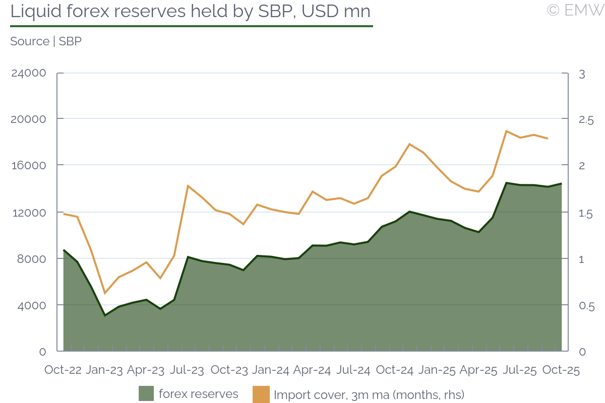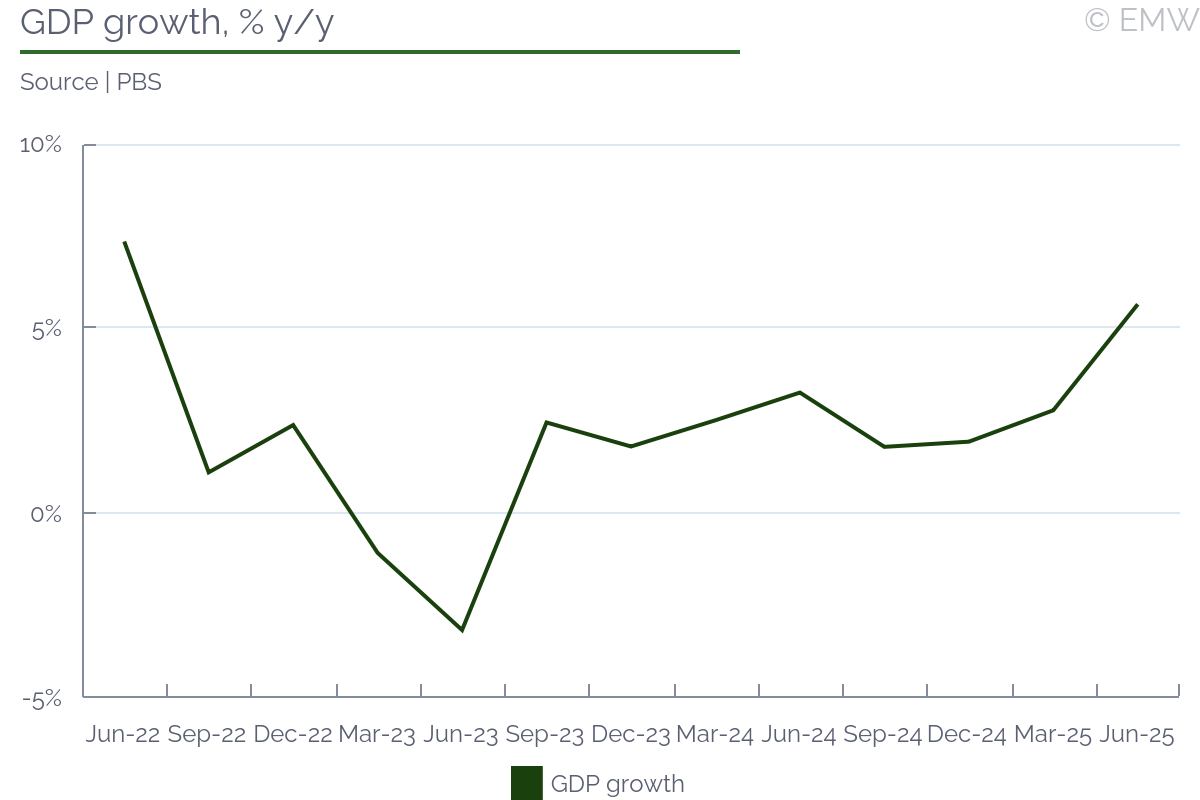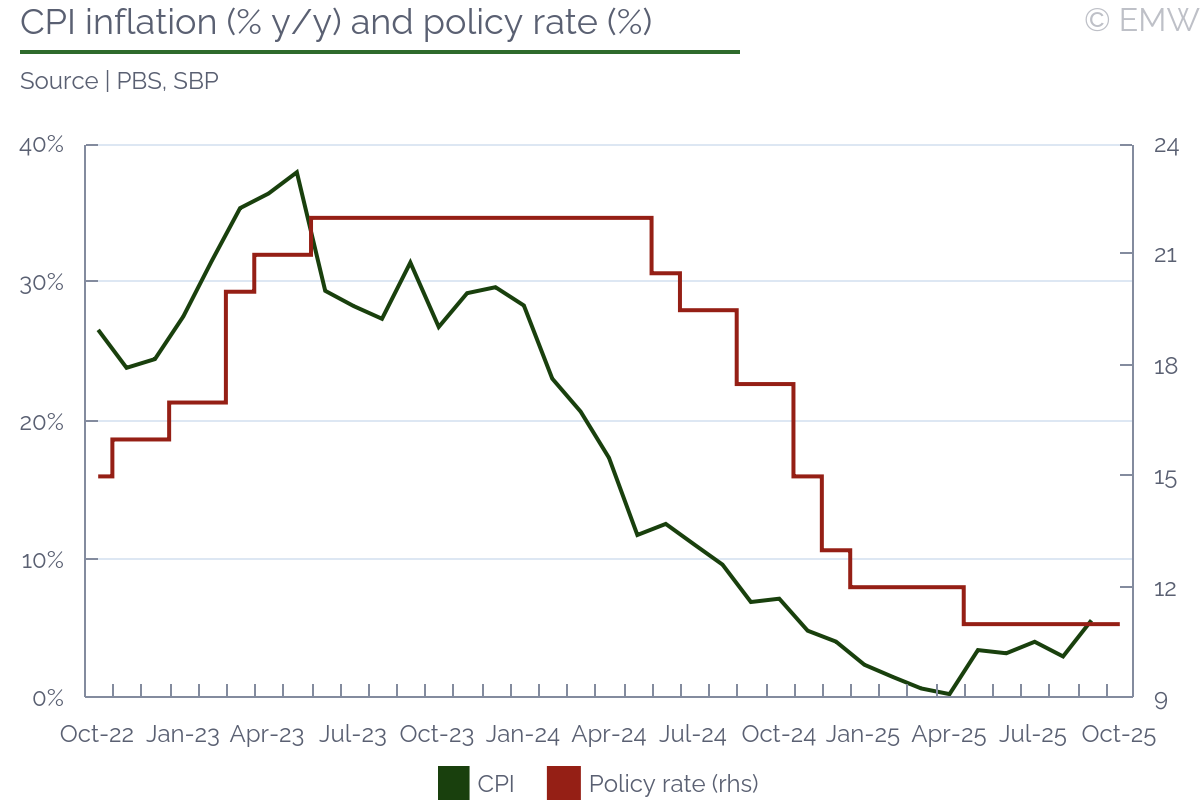 The State Bank of Pakistan (SBP) left its key rate unchanged at 11.0% at its policy meeting on Oct 27, in line with market expectations. The decision came amid rising inflation pressures driven by food supply disruptions following flood-related crop losses and the prolonged border closure with Afghanistan. The central bank said the overall macroeconomic outlook has improved compared to its earlier assessment, citing a lower-than-anticipated impact from the floods, which led it to revise its GDP growth forecast slightly upward. The favourable external sector outlook was maintained, supported by strong remittances and financial inflows. We expect the SBP to hold its benchmark interest rate through FY26, keeping its monetary stance tight in line with IMF recommendations. With inflation projected to exceed the upper bound of its 5-7% target range in the coming months and imports picking up amid the economic recovery, the central bank, in a subtle forward guidance, signalled an extended rate pause, noting that the current real policy rate remains "adequately positive." Inflation environmentCPI inflation rose to an eleven-month high of 5.6% y/y in September, driven primarily by higher food prices, an upward adjustment in gas tariffs, and elevated healthcare and education costs. Core inflation remained broadly stable in rural areas at 7.8% y/y but edged up to 7.0% y/y in cities. The SBP projected headline inflation to breach its 5%-7% target range for a few months in the second half (Jan-Jun) of FY26, reverting to the target range in FY27. The tone was slightly optimistic, considering inflation was previously projected to cross the 7% level for "most of the second half". The SBP noted that, unlike previous flood episodes, the recent surge in food prices appears to be milder than anticipated earlier. That said, price pressures are largely contained, aided by subdued global oil prices, exchange rate stability and stable electricity prices. However, risks persist stemming from higher food prices on account of crop losses and an increase in the minimum support price for wheat, as well as another likely hike in gas tariff from January. GDP growthThe SBP upgraded its GDP growth forecast, in line with its better-than-expected outlook for the agriculture sector. It noted that economic activity gained further momentum, supported by improved domestic demand in part due to a sharp fall in interest rates and positive business sentiments. Growth is projected to reach the upper end of its earlier forecast range of 3.25-4.25% in FY26, up from 3.0% expansion in FY25. Previously, the central bank had projected GDP to come in near the lower end of this forecast range. The SBP's forecast is upbeat than the IMF's forecast range of 3.25%-3.50% for the current fiscal year. It is also well above the World Bank's projection of 3.0%. External sectorThe external position is expected to strengthen, with the liquid foreign exchange reserves held by the SBP estimated to rise to USD 15.5bn by end-December 2025 and USD 17.8bn by end-June 2026, up from USD 14.46bn as of Oct 17. The uptrend is seen aided by robust loan disbursements, bilateral debt rollovers, and continued interbank purchases. These inflows are projected to offset the current account deficit, which the central bank estimated in the range of 0-1% of GDP in FY26. In Q1, the current account deficit stood at USD 594mn. Rising imports are a key threat to the external sector's stability. According to the SBP data, non-oil imports jumped by 14.0% y/y in Q1 FY26, due to a surge in imports of vehicles, machinery, and food items. Exports, on the other hand, grew at a milder pace of 6.5% y/y during this period. Nevertheless, robust remittance inflows - projected to reach a fresh record high of USD 41bn in FY26 - would keep the current account deficit in check. Moreover, the SBP noted that the flood-induced import requirements are expected to be somewhat lower than anticipated earlier. Conclusion Overall, we expect the SBP to hold its key rate steady through June 2026 as flood-related disruption to supply chains and crop losses keep inflationary pressure elevated in the near term. The real interest rate is set to narrow as inflation is projected to exceed the target range in the coming months. Given the IMF's emphasis on maintaining adequately positive real rates, the central bank is likely to adopt a cautious monetary policy stance. Further, as economic growth continues to strengthen - partly reflecting the impact of the earlier cumulative 1,100 bps rate cuts - the scope for further easing appears limited. Further Readings Previous policy rate decisions | |||||||||||||||||||||||||||||||||||||||||||||||||||||||||||||||||||||||||||||||||||||||||||||||||||||||||||||||||||||||||||||||||