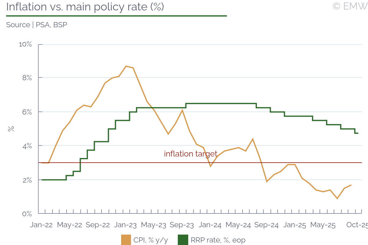 We think that BSP's Monetary Board (MB) is likely to reduce the policy interest rate by 25bps at its next meeting on Dec 11, the sixth and final one for 2025. Last Thursday, the MB decided to reduce the central bank's Target Reverse Repurchase (RRP) Rate by 25bps to 4.75%. The central bank also cut the overnight deposit and lending rates by 25bps to 4.25% and 5.25%, respectively. The decision was a surprise, as most economists polled by Bloomberg and Reuters had expected the BSP to keep rates unchanged. The MB's assessment is that there is scope for a more accommodative monetary policy stance. The benign inflation outlook and the moderating domestic demand justify further support to the economy. As the effects of earlier policy easing work through the economy, the central bank will continue to be vigilant to emerging risks while maintaining price stability consistent with sustainable growth and employment. BSP Governor Eli Remolona Jr. said that another policy rate reduction is possible at the December MB meeting, and more cuts are also on the table, the BusinessWorld reported. InflationThe outlook for inflation is favourable and well within the 2-4% target band, the BSP said on Thursday. Inflation expectations continue to be well-anchored. Some upward pressures could arise from potential adjustments of electricity rates and possible increases in tariffs on rice imports. However, the risks to the inflation outlook are limited given that price pressures are anticipated to ease. The IMF forecasts annual average CPI growth of 1.6% this year and 2.6% next year, according to the October World Economic Outlook published on Tuesday. In April, the two inflation rates were predicted at 2.6% and 2.9%, respectively. The IMF noted in the latest report that inflation in the Philippines surprised on the downside. The inflation target range is 2.0-4.0%. The end-of-period y/y CPI growth is predicted at 1.5% in 2025 and 2.8% in 2026. Economic growthThe outlook for economic growth in the Philippines has weakened, the MB said last Thursday. Governance concerns about public infrastructure spending weigh on business confidence. The signs of softening demand also reflect persisting uncertainty from external factors. On Friday, Remolona told CNBC that he expects the slowdown to be short-lived, maybe two or three quarters, and then they will see a better trajectory than before. He hence anticipates more than just a catch-up. On a related note, the BSP governor was also quoted by BusinessWorld as saying that they expect growth of 5.3% this year and 6.0% next year. The Philippine government targets GDP growth in the range 5.5-6.5% this year and 6.0-7.0% per year over the period 2026-2028. On Tuesday, the IMF lowered its projections of GDP growth in the Philippines in 2025 and 2026 to 5.4% and 5.7%, respectively. In July, the two rates were forecast at 5.5% and 5.9% respectively. Exchange rateThe peso is trading at USD/PHP 58.192 at the time of writing, which compares with USD/PHP 58.433 on Oct 9, the date of the latest MB meeting. On Thursday, Remolona said they will only defend the domestic currency if it weakens sharply enough to potentially become inflationary. Further readingPress release after Oct 2025 monetary policy action Schedule of monetary policy meetings | |||||||||||||||||||||||||||||||||||||||||||||||||||||||||||||||||||||||||||||||||||||||||||||||||||||||||||||||||||||||||||||||||