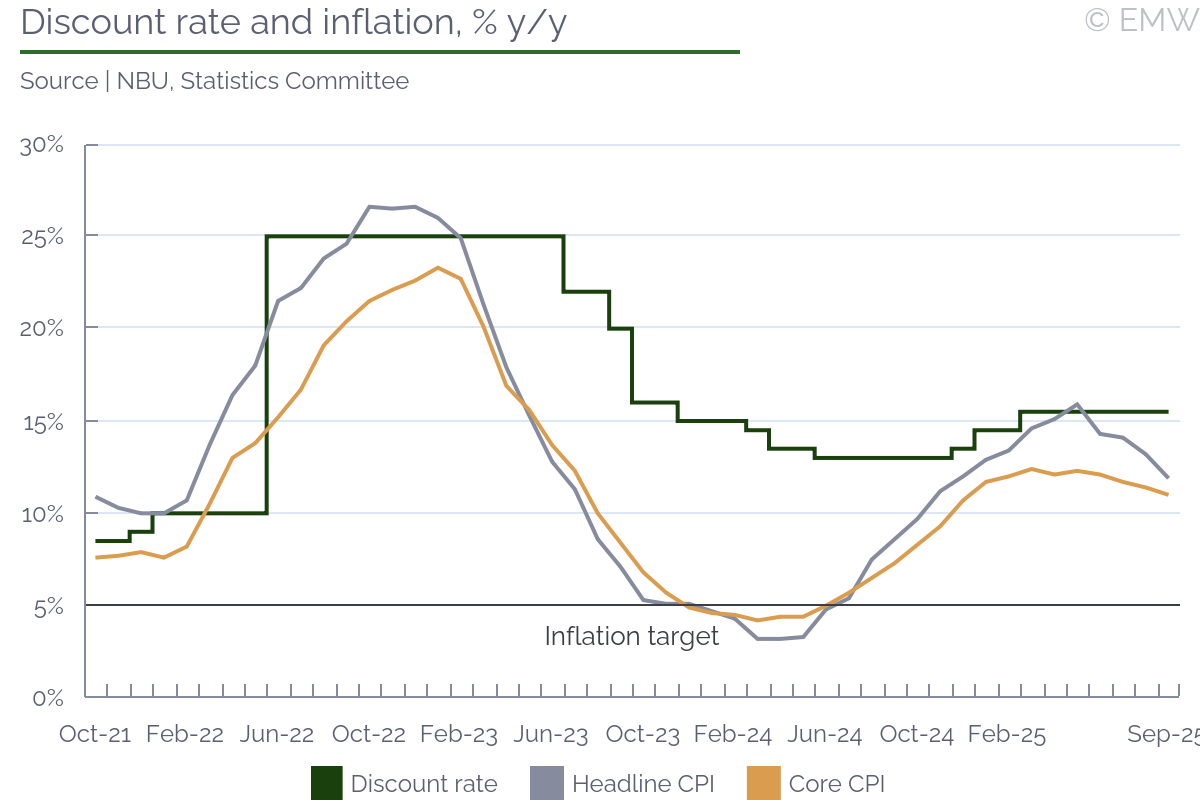 The central bank (NBU) has left the key policy rate at 15.5% four times since last spring. Another on-hold decision is likely also tomorrow, although the NBU may also consider a cut, as last summer it planned easing by end-2025. Policy easing would appear premature now, amid the war escalation when Russia has been threatening to black Ukraine out ahead of winter. Also the IMF reportedly pushes for some hryvnya devaluation, which would slow disinflation, and uncertainty about budget financing increased recently. The NBU's disinflation forecast for H2 2025 has materialised against the background of relative macroeconomic stability and significant foreign aid inflow, slower real wage growth, a good vegetable harvest which eased the food price growth, and on base effects in the utility sector. Headline CPI inflation fell to 11.9% y/y in September from 13.2% in August, which was lower than anticipated by the NBU. At the same time, core inflation at 11.0% y/y in September, down from 11.4% in August, was in line with NBU expectations. All MPC members were in favour of an on-hold decision at the Sep 10 key policy rate discussion, just like in April, June and July, according to the minutes published by the NBU on Sep 22. The MPC members agreed that there should be room for starting an easing cycle in Q4 2025. At the same time, they differed on its pace. Most of them agreed that the key rate should be cut to 14.5% by end-2025 and further to 12.5% by end-2026, as outlined by the NBU in the July macroeconomic report. But several MPC members advocated a slower pace, to 13%-14% by end-2026.