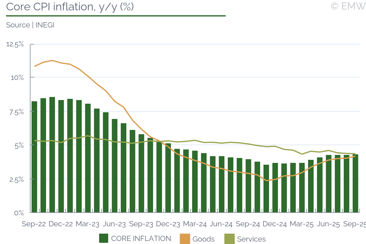 Core CPI inflation slowed to 4.24% y/y in October H1, adding 10 fortnights above 4.00%, while the CB continues an easing cycle that began in August 2024 and is not about to end. CPI inflation has slowed, hitting 3.63% y/y in October H1, adding 7 fortnights below 4.00%, and slowing by 1.06pps y/y. However, this deceleration has come fully on the back of non-core inflation. Some board members seem to disregard this, focusing on general disinflation, noting general inflation is in line with its historic values. This dovish side of the board minimizes lingering inflationary pressures, some of which are visible in core inflation data, in our view. This dovish position is particularly headed by Governor Victoria Rodríguez and Deputy Governor Omar Mejía. On the other hand, Deputy Governor Jonathan Heath insists the CB should focus on core inflation, not on the disinflation driven by non-core inflation, warning non-core inflation is not driven by the economic cycle nor by the CB's monetary policy. Moreover, in a recent interview, the deputy governor warned that non-core inflation is intrinsically volatile and it's unreasonable to anticipate the low pressure it's yielded in recent months can extend for long, anticipating inflation will accelerate so long as core inflation fails to slow. We believe this is the main debate to have in the Monetary Policy Council (MPC) in coming sittings, as the board ponders further easing. However, we see no appetite from the dovish side of the board or from the kingmakers to highlight lingering core inflation pressure. Indeed, We only see Deputy Governor Galia Borja pondering this lingering pressure in recent prints, perhaps standing as the more likely board member to eventually join Deputy Governo Heath in voting against further easing. Thus, we remain confident the CB will cut its Monetary Policy Rate (MPR) by 25bps in November, in a 4-1 vote. There is a possibility that a new 25bps cut in December comes from a 3-2 vote, if Borja leaves the dovish side of the board. However, we believe this is unlikely; indeed, we expect two 4-1 votes to close the year, bringing down the policy rate to 7.00%. Given how dovish the majority of the MPC has been, we expect further easing in early 2026, even as inflationary pressures persist. Barring a surprising acceleration of CPI inflation, we anticipate the CB will cut its policy rate by 50bps in Q1, bringing it down to 6.50% by March-end. Looking at Q1, it remains to be seen how the MPC will react to new inflationary pressures. On this, we insist the 2026 budget is inflationary, raising taxes on sugary drinks, videogames and tobacco, while cutting some exceptions (mostly for banks) and imposing tariffs on countries with which Mexico does not have a free trade agreement. The govt plan to again raise the minimum wage by 12% adds to this inflationary pressure, in our view. The MPC has not pondered these pressures, per the latest minute, except for Deputy Governor Heath, who warns of the inflationary pressures of these measures. It remains to be seen if any other board member will recognize this looming pressure in the next two sittings. Still, once the pressure begins to materialize, it will be harder to turn a blind eye on this pressure. Finally, we expect the MPC to highlight the Federal Reserve's recent easing. Indeed, the bulk of the MPC agree that the Fed's recent easing gives them room to continue their easing cycle. Even Deputy Governor Heath recognizes that the Fed is giving leeway to the dovish side of the board, considering that, in his view, there is no further room to cut the difference with the US. Overall, we are confident the CB will cut its policy rate by 25bps in November, bringing down the policy rate to 7.25%. We fully expect the CB will vote for another 25bps cut in December and will cut its policy rate further in early 2026. How much easing comes in 2026 might depend on the Federal Reserve's actions and the dovishness of the kingmakers in the CB's board, as they continue to minimize core inflation pressures. Indeed, given the dovishness of the bulk of the board, we see the MPR falling to 7.00% by year-end, and to 6.50% by Q1-end.