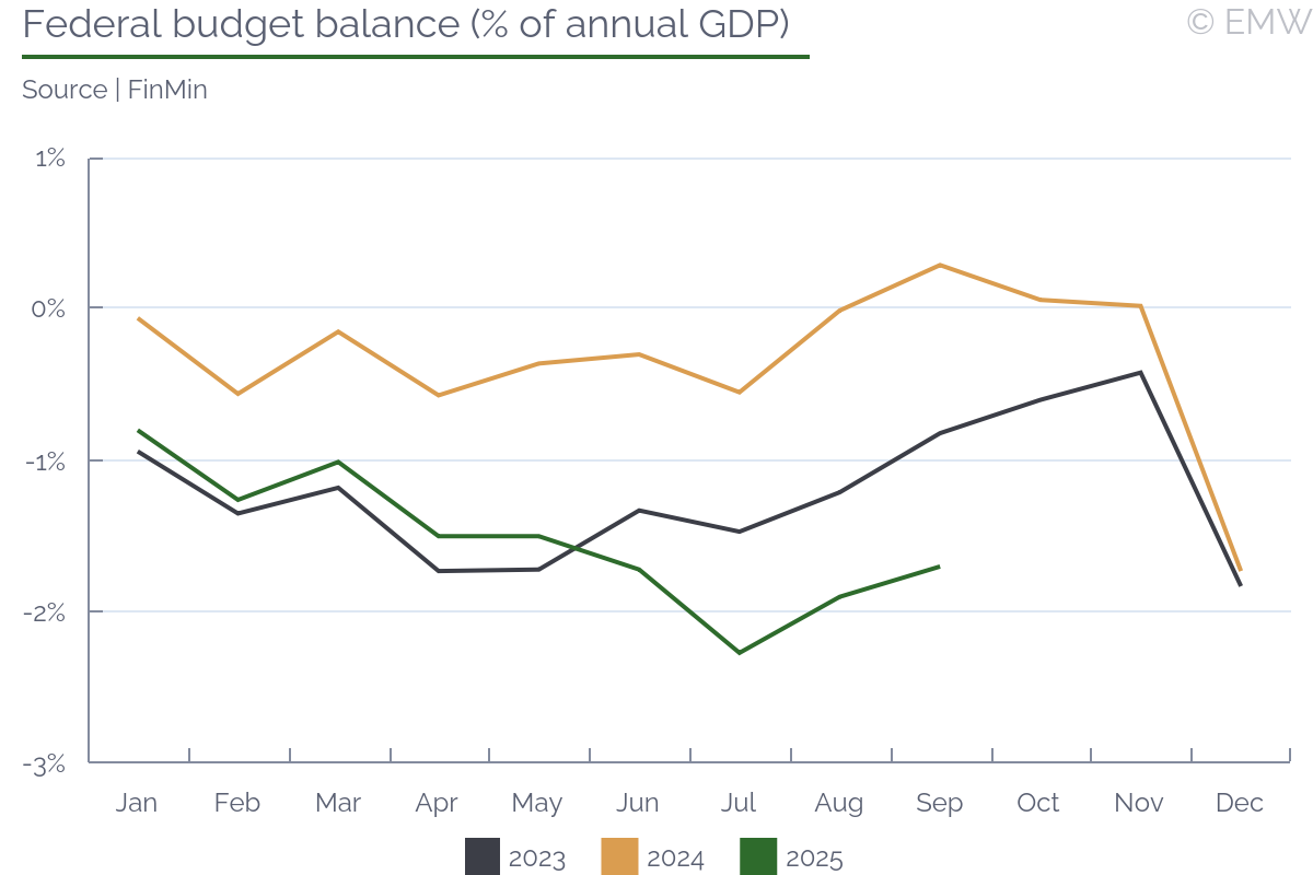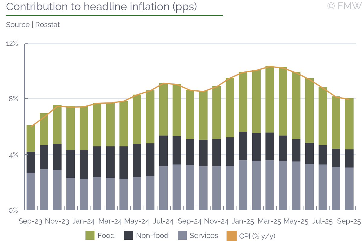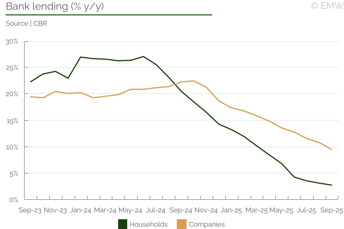 Forecasting the next CBR rate decision is more difficult than usual, seen also in the market consensus which is split almost equally between a hold and a 100bp rate cut. On one hand, arguments for keeping the rate unchanged are an increase in core inflation, distorted by one-off factors, as well as a sharp rise in inflation expectations of companies and professional forecasters. On the other hand, arguments for a cut include too moderate credit activity, weakening in demand, and a rather neutral fiscal stimulus for now. This is taking place amid an uneven external environment, which may require additional measures to support economic activity. However, given that the CBR has often acted more hawkishly than even the market's most cautious forecasts, we expect it to keep the key rate at 17.0% or cut by a below-consensus 50bps. Inflation reached 8.5% y/y as of Oct 13, gradually increasing since September. SAAR inflation also picked up to 6.7% in September, way above the 4% inflation target again. Thus, the average SAAR came in at 6.4% in Q3, compared to 4.8% in Q2. However, we note that Q3 inflation is still significantly lower than CBR's expectations (8.5%), but in Q4 it should be higher as the CBR expected it closer to 4%. The indexation of utility tariffs certainly contributed to this acceleration, but was not the main factor this year. Since the beginning of September, we have observed an earlier-than-usual rise in fruit and vegetable prices and accelerating fuel price growth. Moreover, the increased inflation rate for meat products and drugs also contributed to the overall negative result. Growing prices are explained by lack of supply rather than high demand. Following the rising inflation, as well as very early price adjustments ahead of the VAT increase taking effect in early 2026, inflation expectations in October accelerated and reached 19.6% among companies - the highest level since March. Analysts surveyed by the CBR also raised their expectations for both the current year and 2026. Household inflation expectations for October are yet to be published, while the improved data for September are likely outdated. Bank lending rates in September still suggest overcooling as growth in lending to households dropped further to 2.8% y/y due to muted demand, while lending to companies eased to 9.5% y/y amid lower output. Both sectors continue to borrow more modestly also in monthly terms with the smallest decrease observed in mortgages, which rely on subsidies. The same is true for savings in both y/y and m/m perspective. Back in September, it was expected that a small cut would make the market anticipate a longer hawkish stance and decrease demand for credit. In our view, that is happening now. Such low credit activity suggests a policy rate cut, but as the CBR is long concerned with demand that is too high for supply to keep up with, we doubt that it can be the main argument. Regarding the new 2026 budget, the CBR clearly wants to present it as a disinflationary factor that does not force it to take a more hawkish monetary stance. CBR officials commented that the budget law does not over-expand expenditures and moves towards increasing indirect taxes, instead of an even bigger deficit, which is welcome. They also emphasized that this would lead to only a slight adjustment to the macro forecast. In our view, despite the legitimacy of all these arguments, the regulator may still fear an increase in the deficit by the end of this year and early next year due to advance payments based on the pattern of the last two years. Doubts may also lie in the area of revenue collection. | |||||||||||||||||||||||||||||||||||||||||||||||||||||||||||||||||||||||||||||||||||||||||||||||||||||||||||||||||||||||||||||||||