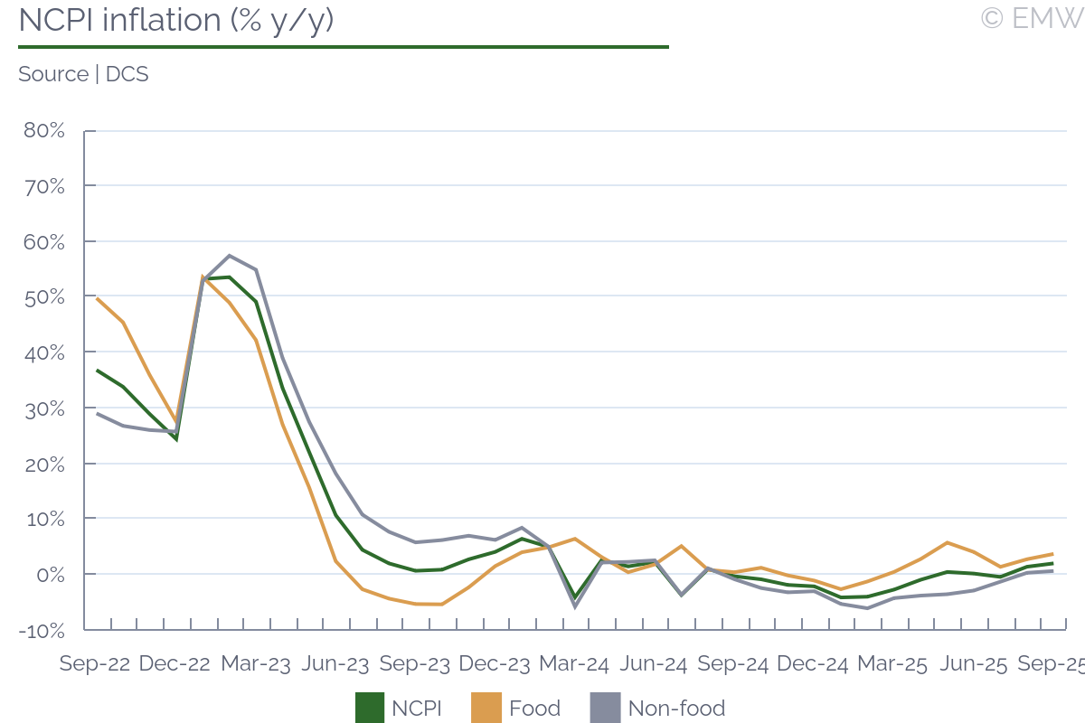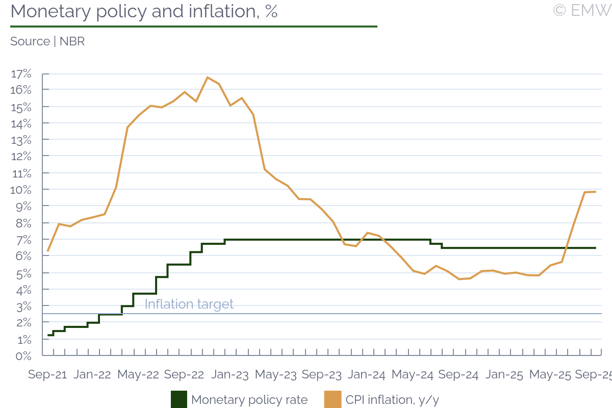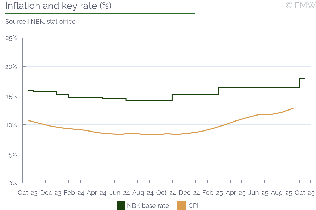On Oct 10 the NBK delivered a 150bp hike, raising the base rate to 18%. We expected tightening, though our baseline scenario was for a 100bp hike, in line with earlier indications by the bank. Not surprisingly, the NBK highlighted recent CPI inflation dynamics as decisive. We remind that the CPI rate posted 12.9% y/y in September, exceeding NBK's year-end forecast range. In addition, core and seasonally adjusted inflation have been on the rise for a few months, which is a concern. The NBK traditionally sees fiscal stimuli, domestic consumption and credit growth as inflationary factors and these were noted again. The bank's assessment of near-term developments is cautious as well. Externally, there is uncertainty in some partner economies, though the impact of domestic tendencies is deemed decisive at present. Specifically, the NBK sees consistent pressures from food and fuel prices, import growth, and the upcoming VAT hike. Its next rate-setting decision will also include an update of its macro forecasts, which may entail an upward revision of the inflation projection for end-2025 or beyond. In general, the NBK expressed confidence that the steep October hike will prevent a wage-price spiral. It is also confident that the gold purchase mirroring scheme and the revised minimum reserve requirements for lenders will reinforce inflation management efforts. Nevertheless, the bank has said further tightening is still possible next month if inflation dynamics do not stabilise in the short run. At this stage, we are not committing to a hike prediction, but additional data can change this in the next couple of weeks. | |||||||||||||||||||||||||||||||||||||||||||||||||||||||||||||||||||||||||||||||||||||||||||||||||||||||||||||||||||||||||||||||||