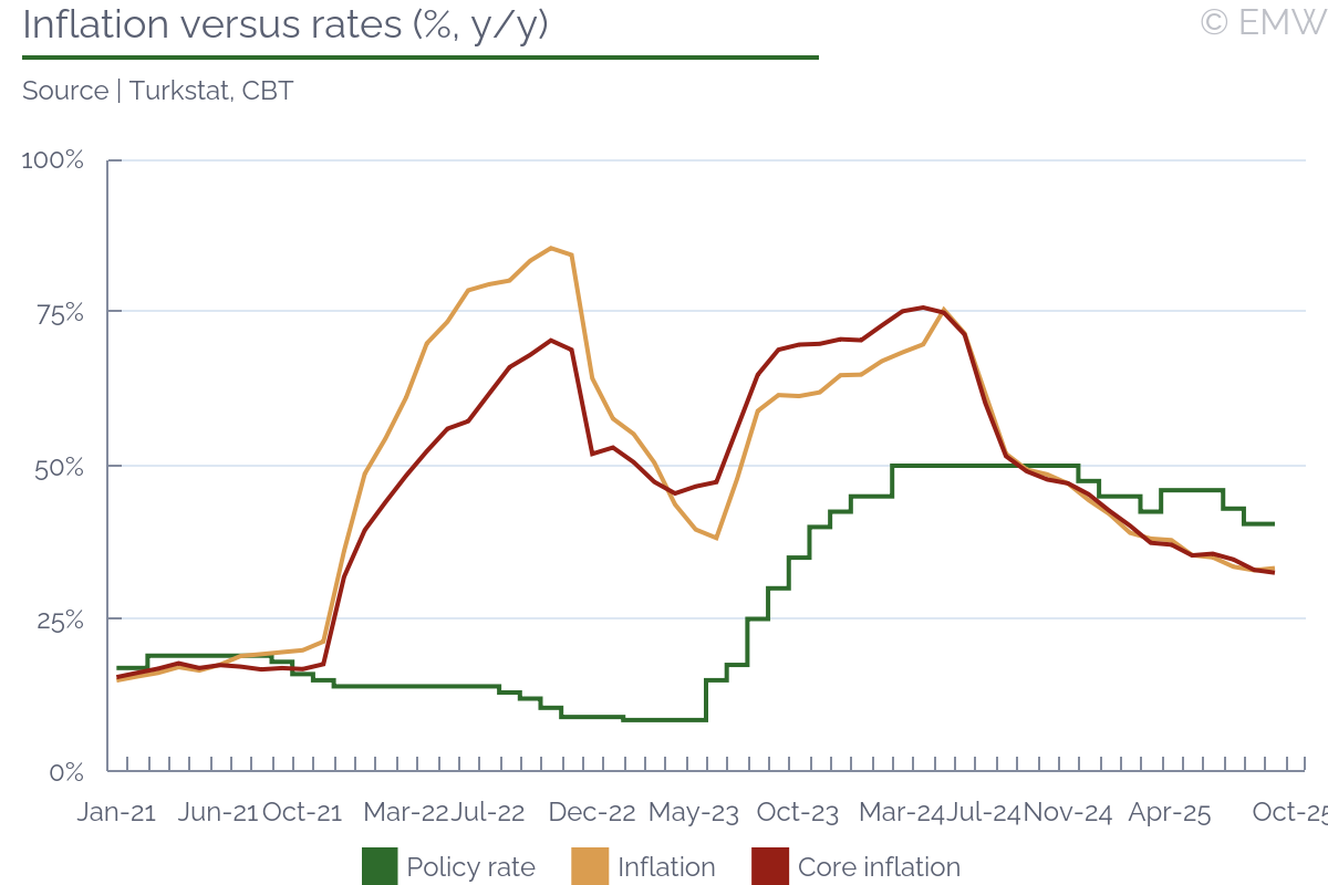 We anticipate the CBT to maintain its monetary easing trajectory at the upcoming MPC and reduce the policy rate by 150-200bps. With CPI inflation substantially exceeding expectations and standing at 33.3% y/y, the current policy rate of 40.5% yields ex-post real rates near 7.2pps relative to headline CPI. This buffer may provide the CBT room to advance the easing cycle without immediately undermining disinflation credibility. On the external side, Turkey's CDS has traded below pre-19 March levels, when IMM mayor Ekrem Imamoglu was detained, which we evaluate as a constructive development. Yet four substantial risks loom ahead, we note. First, the trailing three-month average CPI stood above 30% in annualised terms, which is well above the CBT's 24% target and its 29% upper forecast band. This gap creates material credibility exposure, particularly if market participants interpret the overshoot as evidence that price pressures remain inadequately controlled, potentially forcing the CBT to either defend its guidance through delayed easing or accept a re-pricing of rate expectations. Second, the MPC convenes one day ahead of a critical legal event, amplifying headline risk that could disrupt the curve and constrain the CBT's operating flexibility, we assess. As the government hardens its international diplomatic stance, domestic frictions are intensifying, with the CHP's Oct 24 court proceedings particularly vulnerable. Erdogan reportedly has tacit approval from Trump, based on the recent comments from Tom Barrack, to pressure the opposition. We foresee heightened political strain, with potential spillover effects on market sentiment and positioning. Third, as of today, the two-year benchmark bond interest rate stands around 40.61% and in yesterday's tender the compound stood at 40.46%. These are already close to the recent policy rate of the CBT of 40.5%. So, the markets are conveying limited tolerance for aggressive easing, we think. Last but not least, recent GDP data showed resilient activity. Demand has moderated, but not sufficiently to secure rapid disinflation, in our view. Output gap dynamics and persistent services inflation would argue for measured easing and a cautious tone. Therefore, when all these are considered, perhaps the best strategy would even be a pause to assess incoming data without adjusting the policy rate. Yet, the CBT likely faces considerable political pressure, given the real sector's struggle with elevated borrowing costs, we think. The manufacturing sector remained in contractionary territory for eighteen consecutive months, we note. Against this backdrop, we expect the CBT to deliver a baseline 150bp cut with restrained communication, though a 200bps reduction could be also delivered should the CBT choose to move faster. Summary of September rate-setting meeting MPC rate decision in September | |||||||||||||||||||||||||||||||||||||||||||||||||||||||||||||||||||||||||||||||||||||||||||||||||||||||||||||||||||||||||||||||||