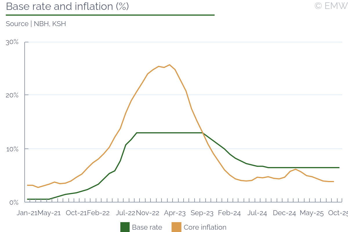 The MPC will maintain its current policy stance of keeping tight monetary conditions at least till December, we maintain our baseline scenario. The MPC did not budge from its monetary policy stance on its rate-setting meeting in October in a situation of rising government pressure to cut rates. We recall that PM Viktor Orban renewed the government calls for lower policy rate, saying that the inflation target was unnecessarily high and that there was room for rate cuts in the longer term. Economy minister Marton Nagy followed suit and argued that the inflation target could be achieved also by a lower policy rate. The real interest rate could still remain positive, but it could be lower, Nagy said, in our opinion implying room for rate cuts of around 1pp. NBH officials have insisted on keeping the current policy stance despite the government pressure, we note. NBH executive director in charge of monetary policy Adam Banai pointed out that monetary policy needed to be wary about any forint weakening because the pass-through effect on inflation has become stronger than in previous years and because household inflation expectations have remained elevated. NBH deputy governor Zoltan Kurali also stated on Oct 7 that rushing with rate cuts could weaken the forint, adding that savings was an important monetary policy channel and the high real interest rate stimulated savings. The situation has not radically changed since the MPC September meeting and the September rate decision indicated that the policy rate should remain unchanged for a prolonged period of time, Kurali emphasised. The MPC did not revise its forward guidance on its meeting in October, fuelling our expectations that it will stick to its current policy stance in the near term. In the longer term, we believe that recent positive developments could create an opportunity for the MPC to reduce the policy rate without sacrificing its careful and patient policy approach. In particular, the Q3 Inflation Report of the NBH showed some improvement of the inflation outlook and the September inflation data showed an encouraging slowdown in food inflation, we note. In addition, the forint exchange rate has remained fairly strong and the MPC has already expressed satisfaction about its impact on manufacturing PPI and import prices. The inflation outlook, however, will benefit from a more sustained slowdown in import prices, so the MPC will need to continue supporting a stronger forint in the next month, we believe. Disinflation in the food sector will also need to become more firmly entrenched, which could contribute to moderating consumer inflation expectations. This process could eventually open room for credible monetary policy easing, but the appropriate conditions for this will not be present in the next months, we expect. Accordingly, the updated NBH forecast with the December Inflation Report will be more indicative whether a shift of the monetary policy stance will be possible, in our view. The MPC reiterated after its October meeting that tight monetary conditions were still warranted and monetary policy will continue to follow a careful and patient approach, together implying no change in the monetary policy stance in the short term. The MPC highlighted the increased importance of the forint for the inflation outlook and inflation expectations. The MPC noted some improvement in inflation expectations, but cautioned that they were still elevated, requiring stable forint in order to ensure they become anchored in line with the mid-term inflation target. It also sounded hawkish on the recent tame inflation data, pointing out that it reflected a strong downward impact from the government's price restrictions, while pricing behaviour remained excessive outside the scope of the price regulations.