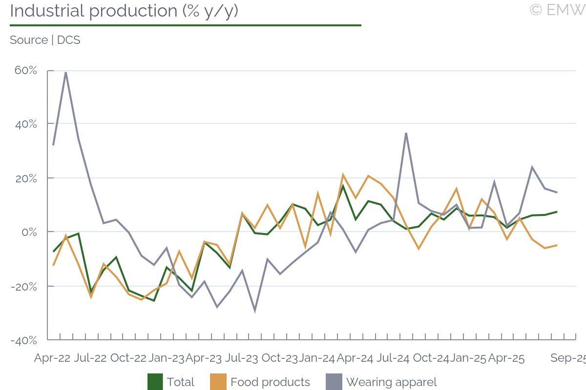 The Central Bank of Sri Lanka (CBSL) is expected to maintain its policy rate at 7.75% in the coming review, extending its pause after a series of early-2025 rate cuts that totalled 250 bps. Having front-loaded monetary easing to spur recovery, the CBSL has since shifted to a more measured stance, prioritising currency stability and reserve rebuilding. The monetary authority continues to signal confidence in the price trend, while acknowledging persistent vulnerabilities in the external and fiscal accounts. The policy pause coincides with stronger macro indicators. The IMF and Sri Lankan authorities reached a staff-level agreement on the fifth review of the USD 3bn Extended Fund Facility (EFF), clearing the way for a USD 347mn disbursement once approved by the Executive Board. This will bring total disbursements since 2023 to USD 2.04bn, reaffirming external support for the government's reform agenda. The IMF assessment notes that fiscal reforms have been sustained, growth has exceeded expectations, and the external position is gradually strengthening. Inflation OutlookInflation has normalised after nearly a year of deflation. Colombo consumer prices rose 1.5% y/y in September 2025, up from 1.2% in August, marking the second consecutive month of positive inflation. The rebound was led by higher food prices - particularly coconuts, sea fish, milk powder, and private education fees - while fresh fruit and fuel prices fell. Food inflation accelerated to 2.9% y/y, and non-food inflation eased to 0.7%, with mild price gains across clothing, household goods, and education. The CBSL expects headline inflation to edge gradually toward its 5% medium-term target by mid-2026, as domestic demand firms and cost pass-through normalises. Underlying pressures remain contained; transport and utility prices continue to weigh on the index, offsetting pockets of price increases elsewhere. While inflation has stabilised, weak nominal wage growth and subdued credit expansion suggest that aggregate demand is still below potential. The CBSL is therefore likely to maintain its wait-and-see approach, allowing monetary transmission to consolidate before taking further steps. Growth MomentumThe economic recovery continues to gather pace. Real GDP expanded 4.8% y/y in H1 2025, underpinned by industrial revival and improving domestic consumption. August's industrial output growth accelerated to 7.6% y/y - the strongest so far this year - as manufacturing rebounded across key categories. Apparel production surged 14.7% y/y on stronger external orders, while refined petroleum output jumped an exceptional 488% following refinery restarts. Metal fabrication (+48.7%), mineral products (+10.7%), and machinery (+9.3%) all recorded solid gains, reflecting both private and public investment momentum. The PMI for manufacturing rose to 55.4 in September, supported by higher new orders and inventory accumulation ahead of the year-end season. However, light manufacturing sectors - such as paper, plastics, and furniture - remain weak, revealing a still-fragile industrial base. The World Bank projects real GDP growth at 4.6% in 2025, moderating to 3.5% in 2026 as base effects wane and external demand stabilises. While macro stability has been restored, output remains below pre-crisis levels and poverty remains elevated, roughly double 2019 levels. External and Fiscal Conditions Sri Lanka's external position has strengthened but remains structurally delicate. The current account surplus rose 7% y/y to USD 368mn in August - the eighth consecutive monthly surplus - driven by resilient worker remittances and modest export growth. Cumulative external surplus reached USD 2.04bn for January-August 2025. The trade deficit narrowed slightly to USD 414mn as exports rose 4.1% y/y, while imports increased 2.6%, reflecting controlled domestic demand and import substitution. Gross official reserves stood at USD 6.2bn at end-September, covering about 3.7 months of imports - an improvement from the crisis years but effectively stagnant since late 2024. The CBSL has resumed modest FX purchases, adding USD 177mn in September, but these gains have been partly offset by external debt service and IMF repayments averaging USD 100mn per month. The rupee has depreciated 3.3% year-to-date, a modest adjustment that reflects both valuation effects and controlled market flexibility. On the fiscal side, revenue overperformance continues to anchor confidence. Collections from motor-vehicle imports and excise taxes have outpaced targets, supporting primary balance improvement. Debt restructuring is nearing completion, with new bilateral deals - including an agreement with Australia to reschedule USD 39mn - further solidifying external creditor coordination. OutlookThe CBSL faces a narrow policy corridor: growth is improving, inflation is low, and fiscal consolidation is on track, yet reserves remain stagnant and the external environment is fragile. With inflation below target and credit demand still weak, some easing bias persists, but premature cuts could reignite currency volatility. We expect the CBSL to hold rates at 7.75% through the next review, maintaining a neutral-to-cautious stance. A rate cut may emerge in Q1 2026 only if inflation remains below 3% and reserves show sustained improvement. | |||||||||||||||||||||||||||||||||||||||||||||||||||||||||||||||||||||||||||||||||||||||||||||||||||||||||||||||||||||||||||||||||
