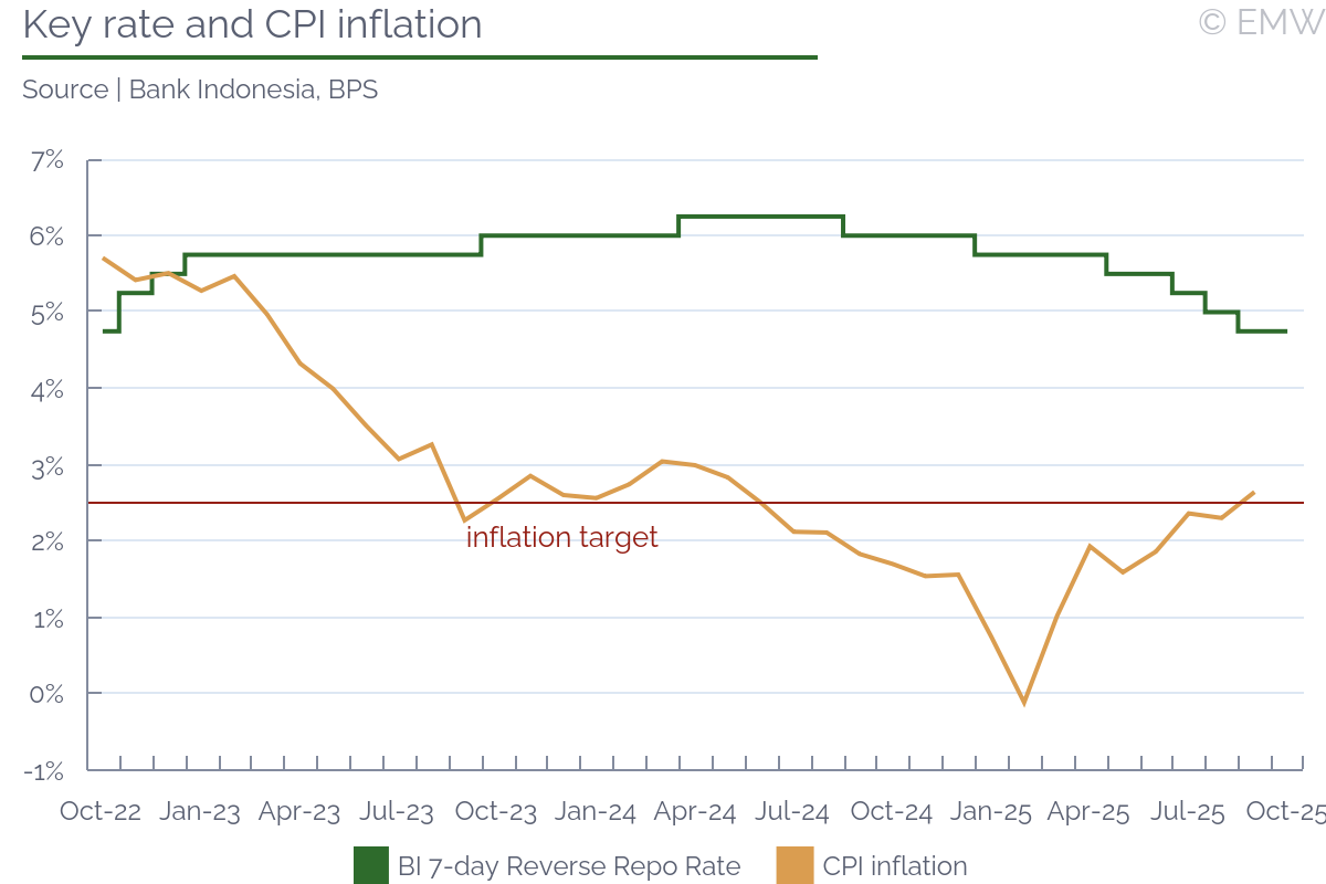 Bank Indonesia cut the key rate by 75bps cumulatively Jul-Sep, before pausing the monetary easing cycle in October. This has brought total rate cuts to five (125bps) since the beginning of the year. The central bank justified the rate cuts with the need to support GDP growth in a low-inflation environment, as the rupiah has stabilised against the dollar, while the latest hold decision came on the background of concern about the rupiah's stability. So far, the central bank has become more and more dovish in light of the low inflation and economic growth slowdown. Moreover, CPI inflation remains subdued and below the midpoint of the central bank's 2.5+/-1% target band. Although it has started to rise, inflationary expectations remain firmly anchored to the central bank's target. We should also note that the new FinMin, Purbaya Yudhi Sadewa, criticised the central bank for being too hawkish and late with rate cuts to stimulate economic growth. The FinMin advised that the key rate should be 1pp higher than inflation, which suggests he sees it at 3.5% in the long term. As a result, we think BI will resume monetary easing as soon as November. GDP growthGDP growth accelerated to 5.12% y/y in Q2 from 4.87% y/y in Q1. Despite the surprising acceleration, BI proceeded with the latest rate cuts, attributing the strong GDP growth to the front-loading of exports to the US in anticipation of the introduction of the 19% import tariffs in August. BI has maintained its GDP growth forecast at 4.6-5.4%, but said economic growth will be slightly above the midpoint, while most IFIs and rating agencies have their forecasts even lower at 4.7-4.9% in 2025. In addition, the government also lowered its GDP growth forecast to 5.0% from 5.2% previously, though even this number now looks optimistic. Private consumption has been slowing down, dragging down overall GDP growth. On the bright side, export prospects have improved, particularly with the recent trade agreement with the US, which saw the US lower the import tariffs on Indonesian goods to 19%. We should note that the government has taken steps to support economic growth in H2. These include a USD 2bn stimulus package to be provided in December, as well as the placement of IDR 200tn government funds from the surplus budget balance (previously kept with the central bank) into commercial banks in a bid to boost lending. Exchange rate stabilityThe rupiah had strengthened since the beginning of May, erasing some of the losses accumulated in March and April, up until August. After the BI started easing monetary policy, the rupiah reversed some of those gains. As a result, its YTD depreciation is about 2.2%, with the exchange rate now back into the USD/IDR 16,600 level in October. The governor stated that Bank Indonesia will continue to use its tools to keep the local currency stable. In fact, the BI has been regularly intervening in the forex market since the beginning of the year, when volatility increased due to capital outflows seen in other EMs as well. Moreover, expectations for more Fed rate cuts have given Bank Indonesia further confidence to slash the key rate as pressure on the rupiah has eased, despite that it remains one of the worst performing currencies in the region. Inflation environmentCPI inflation accelerated to 2.65% y/y in September from 2.31% y/y in August, thus remaining close to the midpoint of the BI's 2.5+/-1% target band. Looking forward, inflation expectations have also shifted towards lower inflation this year, with most projections pointing to CPI inflation remaining below the midpoint of the central bank's 2.5+/-1% target band by the end of the year. The latest IMF forecast points to 1.8% CPI inflation this year. At any rate, Bank Indonesia expressed confidence that CPI inflation will remain under control and within the target band in 2025. This projection looks realistic, in our view, especially given the recent stabilisation around the midpoint of the target band. ConclusionLooking forward, we expect Bank Indonesia to resume its monetary policy easing in November, implementing another 25bp rate cut. In fact, the recent monetary easing amidst the rising pressure from the government has also raised concerns about the central bank's independence. On the other hand, there is a possibility, although lower in our view, that BI keeps the key rate on hold for one more month and focus on accelerating government debt purchases on the secondary market, liquidity provision and stimulating credit growth. We should note that if the Fed continues with the rate cuts due to the persistent low inflation in the US, coupled with the stagnating labour market, it may prompt other central banks to follow suit and reduce rates as well. Further reading | |||||||||||||||||||||||||||||||||||||||||||||||||||||||||||||||||||||||||||||||||||||||||||||||||||||||||||||||||||||||||||||||||