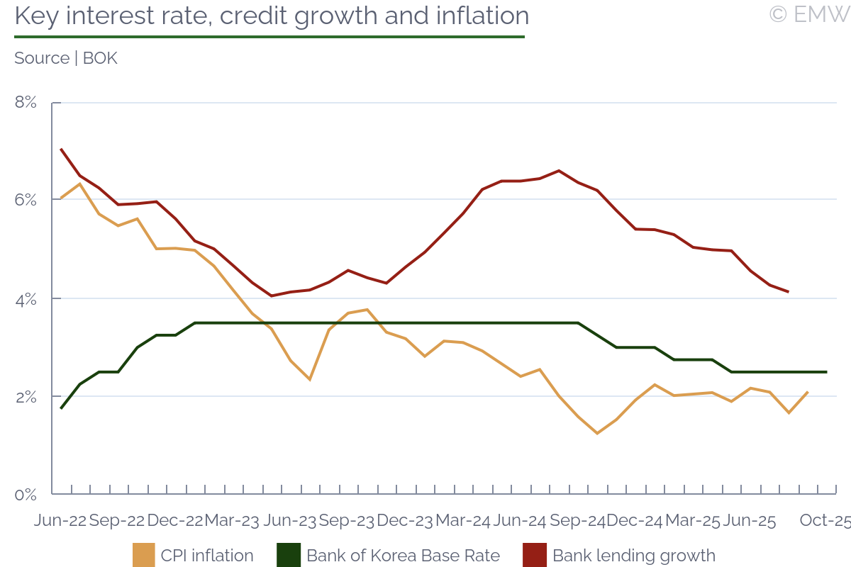 The timing of Bank of Korea's interest rate cuts remains uncertain due to the overheating Seoul real estate market which forced the BOK to stay in hold in its previous three meetings. We remind that the BOK opted to stay on hold in the meeting on Oct 23, but at the same time it maintained its monetary policy easing stance. In terms of future policy outlook, 4 out of the 6 BOK members raised possibility for rate cuts within the next 3 months. Bank of Korea is still expected to provide further support to the economy before it ends the rate cutting cycle as South Korea's growth rate remains under the estimated potential growth rate of 2%. At the same time, the urgency to cut rates has diminished due to the stronger-than-expected GDP growth rate in Q3 and the finalization of the trade deal between the US and Korea. Thus, we think that BOK has the option to either cut the policy rate by 25bps on Nov 27 or delay the resumption of rate cuts until 2026 depending on factors such as the situation in the Seoul real estate market. In our view, the BOK is still likely to cut rates by at 50-75bps before it reaches its terminal rate. Meanwhile, BOK's decision to hold the policy rate was surprisingly supported by President Lee Jae-myung in an interview on Oct 27 who said that a rate cut would have further ignited real estate speculation. Lee stated that the housing market is a "ticking bomb" and the country faces a very dangerous potential crisis due to excessive real estate investment. In addition, he said that fiscal policy and economic policy are more important than monetary policy easing. We think these comments give significant leeway to Bank of Korea to pursue housing market stabilization policy if it so desires. Growth figures also surprised on the upside as the Korean economy expanded by 1.2% q/q and 1.7% y/y in Q3 on the back of solid domestic demand performance. Even though growth is expected to slow down somewhat in Q4 due to the disappearance of government stimulus, the rebound of consumer demand and the stabilization of the construction investment are certainly positive developments. Meanwhile, the inflation rate remains stable as CPI rose by 2.1% y/y in September and the central bank still expects inflation to remain close to the 2% range throughout 2026. The Korean won exchange rate could be also expected to stabilize after the US-Korea trade deal. We certainly think that the main factor to watch for in the coming month before the November meeting is the trend of apartment prices in Seoul. The latest available apartment price growth rate presented by REB showed that apartment prices rose by 0.50% w/w in the week ending Oct 20, which is much higher than what can be tolerated by the BOK, in our view. If apartment prices stabilize after the government announced new housing market regulations on Oct 15, we think that the BOK will likely cut the policy rate by 25bps in November. On the other hand, if apartment prices continue their upward trend despite government regulations, we think that the BOK will delay rate cuts until next year. Useful Links | |||||||||||||||||||||||||||||||||||||||||||||||||||||||||||||||||||||||||||||||||||||||||||||||||||||||||||||||||||||||||||||||||