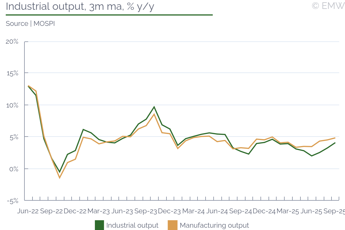 At its October meeting, the Reserve Bank of India's Monetary Policy Committee (MPC) left the repo rate unchanged at 5.5%, extending its pause after 100 basis points of cumulative cuts earlier in 2025. The standing deposit facility (SDF) and marginal standing facility (MSF) were maintained at 5.25% and 5.75%, respectively, with the decision once again unanimous. Governor Sanjay Malhotra described the stance as "neutral with an accommodative bias," citing the need to let earlier policy easing, GST reforms and fiscal measures transmit fully through the economy. The RBI sharply revised down its inflation forecast for FY26 to 2.6%, from 3.1% previously, while lifting its growth projection to 6.8% on the back of resilient domestic demand and policy support. The overall tone was cautiously dovish - signalling that the central bank is preparing the ground for a measured rate cut in December if disinflation holds. Inflation The disinflation cycle has deepened more rapidly than the RBI had projected. Headline CPI eased to 1.54% y/y in September from 2.07% in August - the lowest reading since 2017. Food prices remained in deflation at -2.28%, led by vegetables, oils, pulses, and fruits. Rural food inflation fell to -2.17%, while urban prices slid to -2.47%, supported by favourable base effects and robust agricultural supply. A strong monsoon has anchored food availability, though excessive rainfall in parts of Maharashtra and Madhya Pradesh poses a risk to rabi sowing if flooding persists. Core inflation has edged up slightly on the back of firmer housing (3.9%) and energy (1.9%) costs, but overall price dynamics remain benign. The RBI now expects inflation to average below 3% for most of FY26, rising modestly towards 4% in Q4 as base effects fade and global commodity prices stabilise. With inflation running well below the 4% target midpoint, real policy rates have turned mildly positive, giving the MPC room to pivot toward growth support. Growth Momentum India's growth pulse remains strong. Real GDP expanded 7.8% y/y in Q1 FY26 - the fastest in five quarters - driven by broad-based gains across manufacturing, construction, and services. Sectorally, manufacturing grew 7.7%, construction 7.6%, and services 9.3%, while agriculture accelerated to 3.7% from 1.5% a year earlier. Industrial output rose 4% in September, with manufacturing up 4.8%, led by electrical equipment (+28.7%), autos (+14.6%) and basic metals (+12.3%). Infrastructure and consumer durables each posted double-digit growth, underscoring the strength of capital formation and urban demand. However, consumer non-durables contracted 2.9%, hinting at uneven rural recovery. The manufacturing PMI slipped to 57.7 from 59.3 in August - still solidly expansionary but signalling slower sequential momentum. Fiscal measures are cushioning the cycle. The GST reform, which streamlined the rate structure to two slabs (5% and 18%), and targeted tax reliefs are expected to lift disposable income and consumption through the December quarter. Together with subdued inflation, these factors should sustain real purchasing power even as exports face tariff-related headwinds from the US and Europe. External and Financial Conditions External balances remain manageable. The current account recorded a modest surplus in Q1 FY26 on the back of robust services exports, remittances, and lower oil prices. However, the merchandise trade deficit widened to USD 32.1bn in September as gold and silver imports surged ahead of the festive season. FX reserves climbed to USD 698bn by end-September, covering nearly 11 months of imports. The RBI has continued modest gold accumulation, taking holdings past 880 tonnes - part of a broader strategy to diversify reserves amid geopolitical uncertainty. The rupee, meanwhile, has softened to around INR 88.8 per USD, reflecting global risk aversion and outflows from emerging markets. Liquidity remains abundant. System surpluses persist following earlier CRR reductions and sustained government spending, with money-market rates closely tracking the policy corridor. Bond yields have already priced in a 25 bps cut, while forward-rate agreements imply additional easing in early 2026 if inflation stays below 3%. Policy Outlook The RBI is approaching its December meeting with greater policy flexibility than at any time this year. With inflation well under target and output expanding above potential, the calculus has shifted from fighting inflation to sustaining balanced growth. While global risks - particularly renewed tariff tensions and volatile capital flows - argue for caution, the domestic macro backdrop justifies a calibrated easing. We expect the RBI to cut the repo rate by 25 bps to 5.25% in December while maintaining a neutral-to-accommodative stance. The move would mark a transition from pause to fine-tuning, ensuring policy remains supportive without reigniting price pressures. The central bank is unlikely to signal a full easing cycle; rather, it will emphasise that further action depends on the persistence of low inflation and the resilience of external balances. Our base case is for the repo rate to remain at 5.25% through mid-2026, with the next window for review emerging only if growth decelerates below 6.5% or inflation continues to undershoot the 2-6% band. The RBI's December decision will test its willingness to pre-empt a growth slowdown without undermining its credibility on inflation - a fine line between prudence and proactivity. Further reading | |||||||||||||||||||||||||||||||||||||||||||||||||||||||||||||||||||||||||||||||||||||||||||||||||||||||||||||||||||||||||||||||||