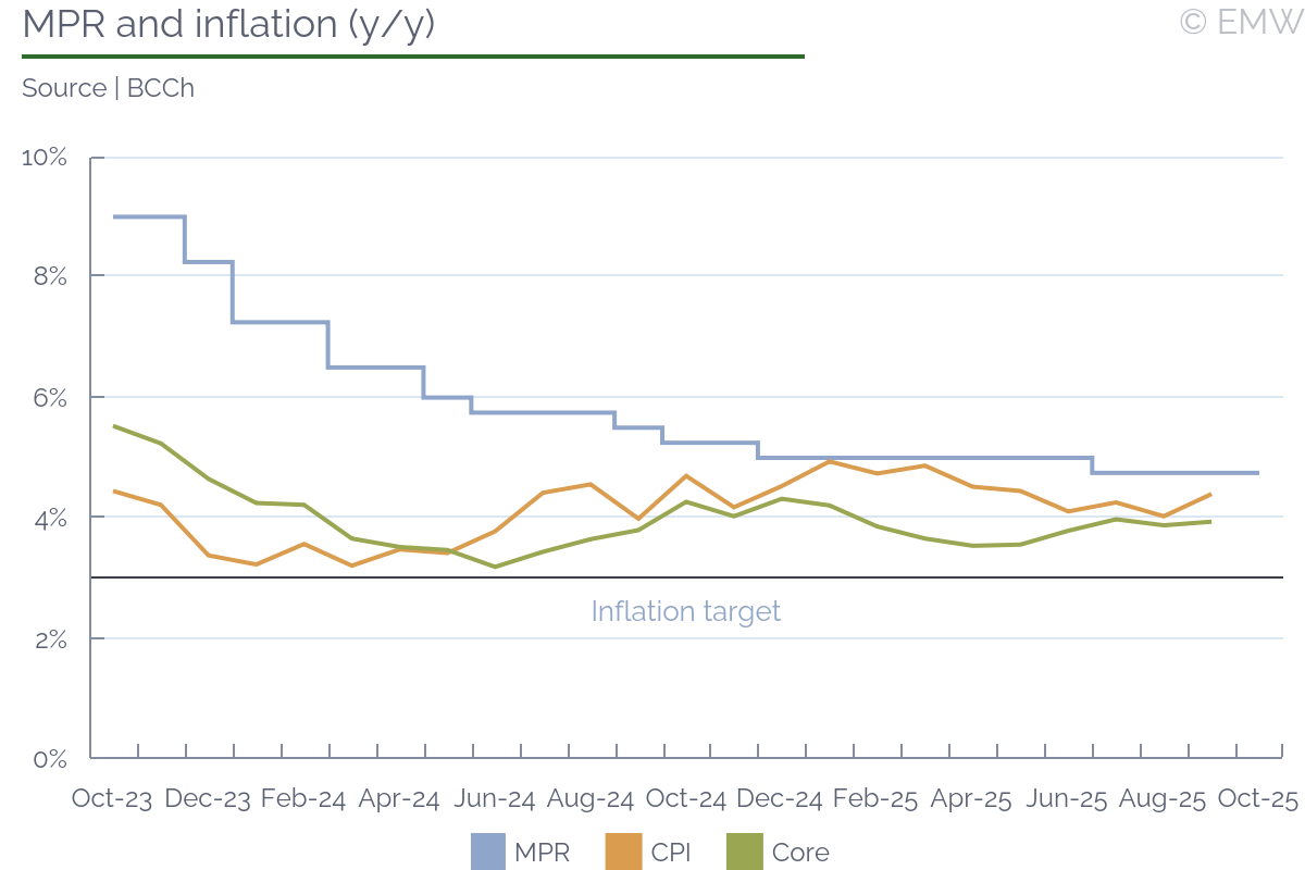 The BCCh's monetary policy council held its benchmark interest rate unchanged at 4.75% in its Oct 28 sitting, as was widely expected, and maintained a cautious tone in its brief guidance that suggests the next cut is likely to wait for 2026. While the guidance was deliberately vague about the triggers and timing for a future cut, we would argue that the monetary policy decision tree currently looks simple. We have been forecasting no more cuts in 2025 since the BCCh published its last monetary policy report, but consensus polls ahead of the October sitting showed a majority still forecasting a 25bps cut in December. That scenario remains plausible, the consensus is likely to shift toward a hold in December and a cut in January with the new BCCh guidance. We are leaning toward March for the next cut. The monetary policy story looks fairly simple right now. CPI inflation has been above the 3.0% y/y monetary policy target since the pandemic. After hitting a post-pandemic low at 3.2% in Q1 2024, inflation increased and has been stubbornly hovering at 4.0%-4.9% y/y since. The monetary policy rate kept declining through 2024 though, pushing the real interest rate down to neutral. With headline CPI inflation currently at 4.40%, expected to end the year above target at 4.00%, and the nominal policy rate at 4.75%, a cut would be hard to justify. In short, the next rate cut will not come until headline and core CPI inflation get closer to 3.0%, and the question is how close would they need to get. For more context to the monetary policy story, headline CPI inflation still contains some residual effects of an overdue power price adjustment that took place in 2024-2025 after price freeze of five years. Core inflation, which excludes the power price noise, behaved a little better than headline CPI, but still hovered consistently in a 3.5%-4.0% range. The real side of the economy is largely neutral for monetary policy currently. The central bank estimates that the economy's output gap is very close to zero, and that the GDP growth composition is relatively balanced, with no particular source of inflationary pressure. There are some concerning spots, for example in persistently weak job creation, but this is something the central bank attributed to a combination of recent reforms that significantly raised labor costs. Lending activity has been weak as well, but starting to trend in the right direction in the last couple of months. Besides the timing for the next cut, the other big question centers on the terminal rate for this cut cycle. The BCCh estimates that the neutral real interest rate is in the 0.50%-1.50% range, and the point estimate is 1.00%. In nominal terms, since the inflation target is 3.00%, the neutral range would be 3.50%-4.50%, but the BCCh would normally be expected to get to 4.00% in the theoretical case that inflation stays at 3.00%. However, recent attempts to replicate the BCCh's methodology for estimating the neutral range yielded that the range should rise to 0.75%-1.75%, and this is leading many to believe that the rate cut process could eventually end at 4.25% or 4.50%. The BCCh has yet to issue any comment on this discussion. | |||||||||||||||||||||||||||||||||||||||||||||||||||||||||||||||||||||||||||||||||||||||||||||||||||||||||||||||||||||||||||||||||