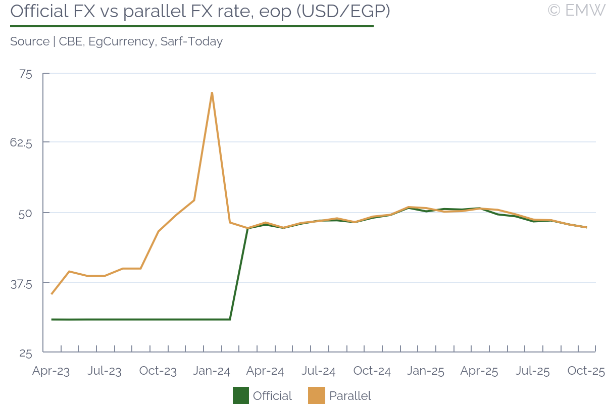 The MPC will hold its next interest rate meeting on Nov 20 and we expect that the committee will deliver another 100bps rate cut, bringing the cumulative cut since April to 725bps. The government raised the petrol and diesel prices by about 13% mid-October as part of a reform program that is monitored by the IMF. The fuel price hike - and especially the sharper 15% increase in diesel prices - is expected to disrupt the disinflation trend. However, the government said there would be no fuel hikes over the next 12 months, so we think the MPC may go with another rate cut. The statistics office will publish the October CPI report on Nov 10, which will give us more clarity. Meanwhile, the pound has gained strength since April due to strong remittance, portfolio, and tourism inflows, and partly due to US policy aimed at weakening the US dollar. Despite the surge of portfolio inflows over the past year and a half, Egypt has managed to boost its resilience to external shocks and the latest two major external shocks - the US tariffs announced in early April and the 12-day war between Israel and Iran mid-June - had limited impact on the country. GDP expanded robustly in 2024/25 as non-oil manufacturing rebounded and private consumption and investments improved further, but economic growth is still below potential, according to the CBE, suggesting that demand-side inflationary pressures are relatively modest. Headline inflation is expected to remain contained during Q4 2025 and to moderate further in 2026, albeit at a slower pace. As such, underlying inflation is expected to converge to its historical average over the medium term as inflation expectations improve further, the MPC said in a recent inflation monitoring report. Inflation is expected to average 14% y/y in 2025 before moderating to 10-12% in 2026 and GDP growth is expected to reach its full potential by mid-2026. Demand-side inflationary pressures may begin to surface after that. | |||||||||||||||||||||||||||||||||||||||||||||||||||||||||||||||||||||||||||||||||||||||||||||||||||||||||||||||||||||||||||||||||
