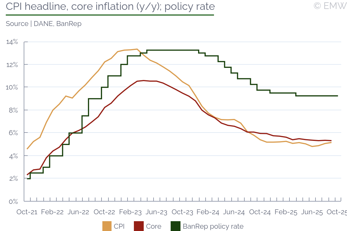 BanRep appears likely to end 2025 by holding its benchmark rate at 9.25%, staying firm amid persistent inflation and despite political pressure from the government. At its Oct. 31 meeting, the board again voted 4-3 to keep the rate unchanged. Inflation increased for the third consecutive month in September to 5.2%, matching the level seen at the end of 2024. Both survey- and market-based inflation expectations rose and remained well above the 3.0% target for the next two years, justifying the cautious stance.