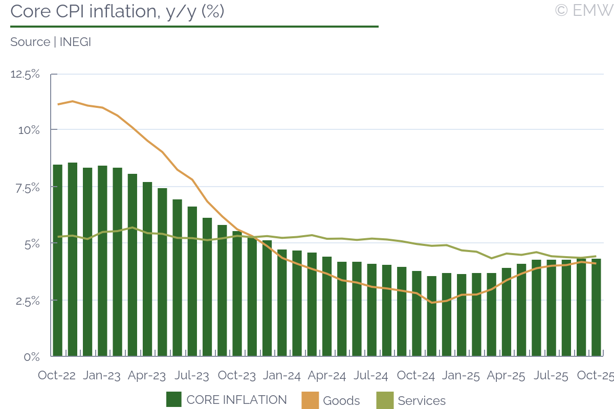 CPI inflation disappointed in November H1, coming at 3.61% y/y, accelerating by 0.11pps h/h and coming above market expectations. The hike came on lingering pressure, with core inflation holding at 4.32% y/y for the second fortnight in a row, tying the worst result recorded since April 2024. The fact core inflation remains so high shows CPI inflation is in no path to converge to the CB's 3.00% target anytime soon, in our view. Still, the CB continued to predict inflation will meet its target by Q3 2026. This projection is not consistent with market expectations, with domestic analysts anticipating CPI inflation will close 2026 at 3.81%, accelerating from its current position. Indeed, as CB Deputy Governor Jonathan Heath has warned a couple of times now, the CB's forecasting has lost credibility because of its over-optimistic CPI inflation projections, in our view. More so, despite still high CPI inflation, lingering pressures and likely new pressures arising in early 2026, the CB has continued its easing cycle without pause and is set to cut its policy rate again in December, by 25bps. Indeed, the market expects a new rate cut on December 18, closing the year with the Monetary Policy Rate (MPR) at 7.00%. Deputy Governor Heath agrees with this projection, although he highlights this new cut won't be unanimous, again. Indeed, we expect the December cut to come from a 4 to 1 vote, with Deputy Governor Heath remaining the lone opposition to the ongoing easing cycle. However, it won't totally a surprise if another board member were to join Heath, bringing a new rate cut coming from a 3-2 vote. The latest sitting minute, published last week, shows the dovish majority that has had full control over the Monetary Policy Council (MPC) is cracking, in our view. Three board members did not commit to constant easing ahead, suggesting a pause stands ahead. We now expect such pause to come starting in the first 2026 sitting, scheduled for February. This is a significant correction in our projections, considering we anticipated easing of up to 50bps in Q1 2026 and, now, we won't be too surprised if no easing comes in Q1 at all. Our 2026 projections will still depend on the tone used in the upcoming cut and the minute to be published in early January. About the magnitude of 2026 easing, we believe the MPC should concern itself on the inflationary pressures to come since the beginning of the year, because of the upcoming minimum wage increase, higher taxes on tobacco, videogames and sugary drinks, and the expected imposition of tariffs on goods coming from countries with which Mexico lacks a free trade agreement. However, the board has shown no concern about these pressures, except for comments made by Deputy Governor Heath, who warns the main concern is the likely two-digit increase of the minimum wage. In our view, a wait and see approach in early 2026 makes sense, particularly because of lingering inflationary pressures and new ones on the horizon. In the more dovish extreme of the Monetary Policy Council (MPC), we expect Governor Victoria Rodríguez and Deputy Governor Omar Mejía favoring further monetary easing in early 2026. Indeed, the governor spoke a week or so a go about the persistence of a negative output gap and saw this as a driver of early 2026 monetary decision making. However, recent history suggest they won't vote against the majority (more so Governor Rodríguez); thus, pauses in early 2026 may come unanimously or in a 4-1 vote. Overall, we are confident the CB will cut its policy rate by 25bps in December, bringing down the policy rate to 7.00%. We expect further easing in 2026. However, we now expect a pause to the easing cycle since the first 2026 sitting, considering a less dovish tone by the CB's board. The latest minute shows a significant change in tone from a very dovish board; however, the tone of the December sitting will be crucial to assess how much easing the CB will end up favoring through 2026. Given the change in tone, it won't surprise us if the CB does not cut its policy rate in Q1.