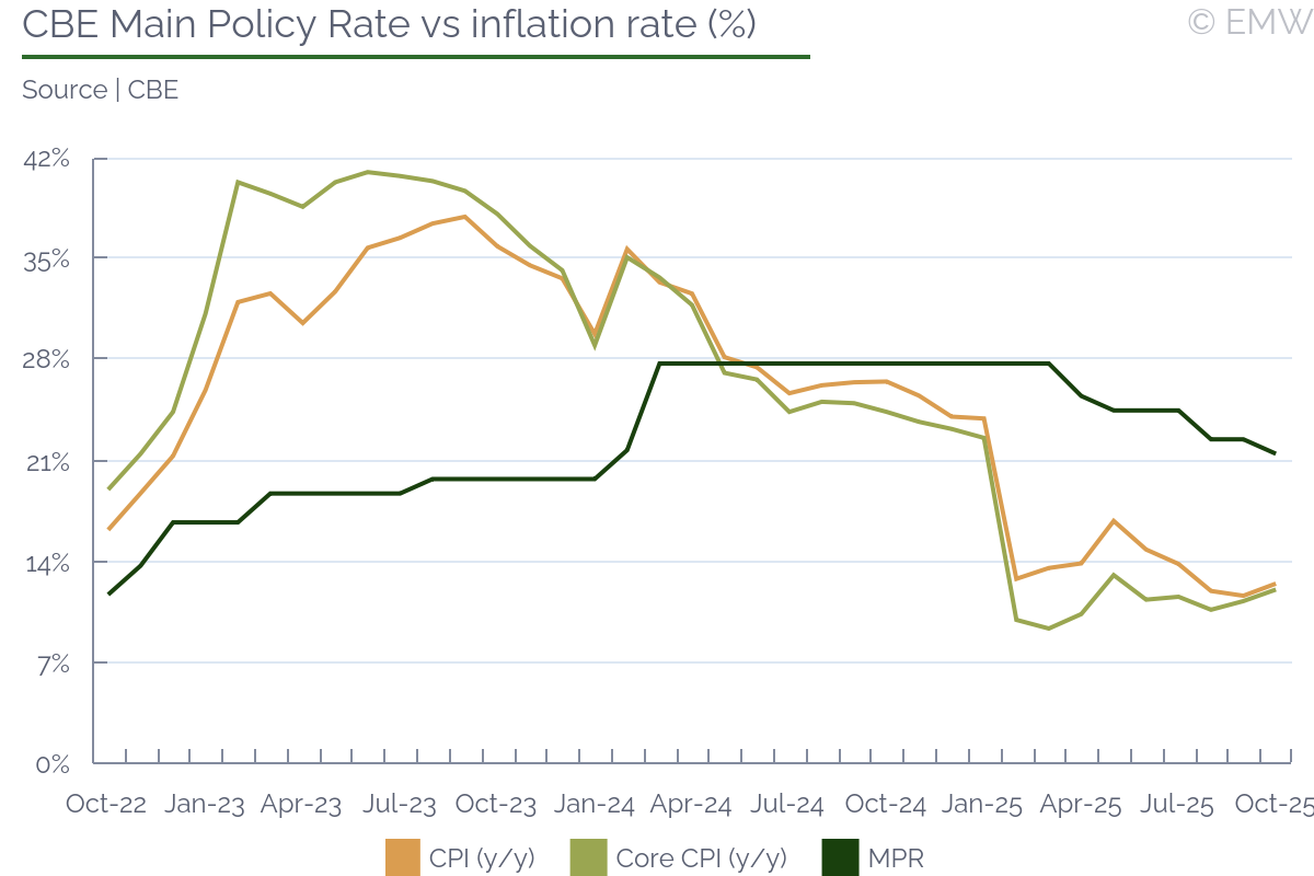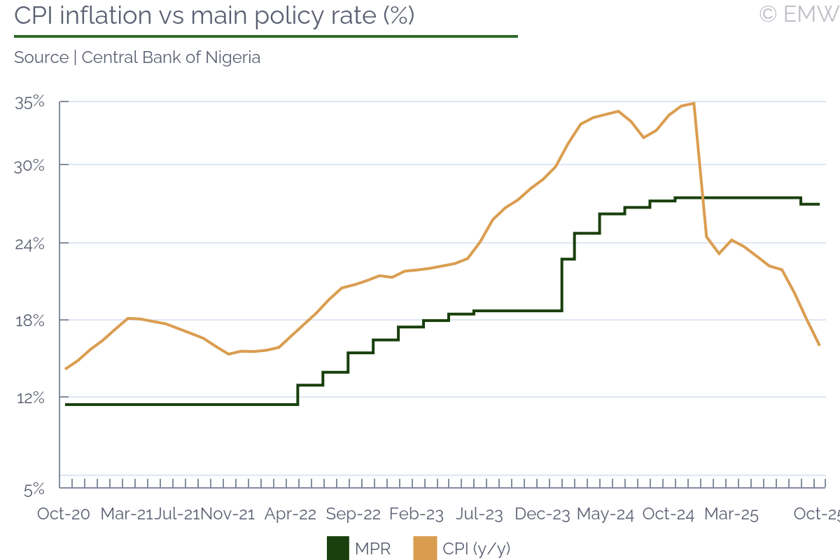 The MPC is widely expected to cut the monetary policy rate when they meet next week on 24 and 25 November. October's inflation rate of 16.05% marks seven consecutive months of slowing inflation and the lowest rate since March 2022. As in September, the slowing in October's headline rate was largely driven by a significant drop in food inflation. Food inflation slowed to 13.1% y/y, from 16.9% y/y in September. Imported food inflation moderated to 9.6% y/y, compared to 12.9% y/y in the prior month. The decline in inflation comes after the MPC cut the monetary policy rate by 50bps to 27% in September. Financial experts expect inflation to continue its downward trend in the coming months, supported by stronger macroeconomic fundamentals, easing food prices and a more stable energy environment. The improving economic environment has boosted market confidence. In October, Fitch affirmed Nigeria's 'B' rating with a stable outlook, while S&P maintained its 'B-' rating but upgraded the outlook to positive in November. We also anticipate continued stability and a downward trend in inflation into the rest of 2025. These expectations could lead to a cut in the MPR (by 100-150bps) at the next MPC meeting. This week, CBN governor Olayemi Cardoso reported that Nigeria's foreign reserves have risen to USD 46.7bn as of November 14. This is the highest level in seven years. The governor credited the increase to stronger investor confidence and improved oil earnings. He said Nigeria's recent removal from the FATF Grey List has further raised credibility in global financial systems and boosted prospects for trade finance and foreign investment. Despite these advances, Cardoso stressed that Nigeria still faces significant challenges which include commodity-price volatility and long-standing structural imbalances. He revealed that the CBN will focus on deepening analytical capacity, upgrading modelling tools and expanding the use of big data as it transitions toward a full inflation-targeting regime. Last week, the CBN announced it is partnering with the ministry of finance on the new Dis-Inflation and Growth Acceleration Strategy (DGAS), a framework integrating fiscal and monetary policies to boost GDP growth above 7% and reduce inflation to single digits. DGAS aims to mobilize capital and establish Special Industrial Economic Zones. This framework is in line with persistent calls from experts throughout the year for Nigeria to strengthen coordination between fiscal and monetary policies. Monetary Policy Committee Statement Monetary Policy Committee Meeting Schedule