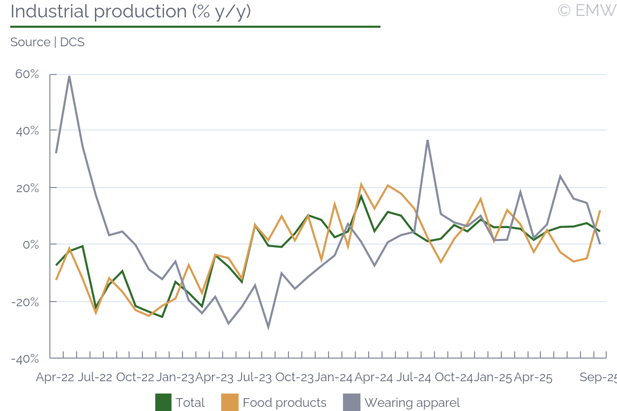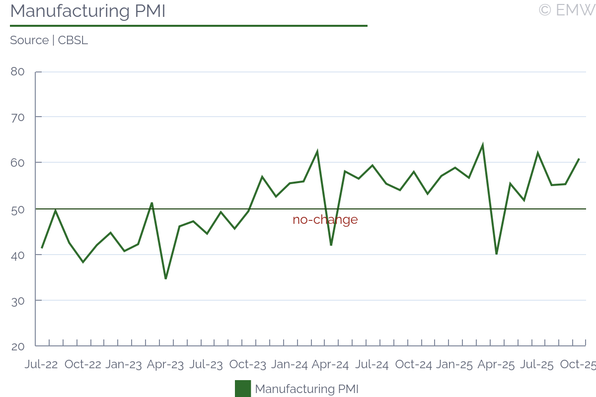 The Central Bank of Sri Lanka (CBSL) maintained the policy rate at 7.75% for a third consecutive meeting on Nov 26, opting to keep its monetary stance neutral as the effects of earlier easing continue to filter through the economy. Having cut rates by 250 basis points between March and May 2025, the CBSL has since pivoted to a watchful pause, balancing a firming growth outlook and low but rising inflation against weak reserve accretion and a modestly depreciating currency. The policy hold comes as key macro anchors remain steady. The IMF Executive Board is expected to approve Sri Lanka's fifth review under the USD 3bn Extended Fund Facility (EFF) on December 15, triggering a disbursement of USD 347mn. The staff-level agreement, finalised in October, affirmed Sri Lanka's reform traction and upward growth surprise. The IMF flagged continued fiscal discipline and a cautiously improving external position, but also noted the importance of protecting the vulnerable and accelerating structural reforms, including trade liberalisation and governance. Inflation OutlookInflation has returned to positive territory after nearly a year of deflation. Colombo CPI rose 2.1% y/y in October, up from 1.5% in September, led by food inflation, which climbed to 3.5% y/y, while non-food prices also picked up to 1.4% y/y. Contribution to overall inflation came nearly equally from food (1.12%) and non-food (0.95%) categories, suggesting that the price gains are becoming more broad-based. The CBSL expects inflation to gradually converge with its 5% medium-term target by mid-2026, supported by recovering demand and normalising costs. Core inflation stood at 1.5% y/y in October. While price pressures remain contained, weak wage growth and soft credit expansion continue to weigh on aggregate demand. As a result, the CBSL has opted to maintain a neutral bias, preferring to let past rate cuts transmit fully before recalibrating. Growth MomentumGrowth indicators have turned broadly positive, supported by festive season demand, investment momentum, and improved credit conditions. Industrial production rose 6.2% y/y in Q3, marking the third straight quarter of post-crisis recovery. That said, momentum eased slightly in September (4.7% y/y), down from 7.6% in August, as refined petroleum output and machinery production dipped due to base effects and inventory adjustments. The Manufacturing PMI surged to 61.0 in October, signalling strong expansion. New orders, especially in food and beverages, drove the rally, while production, employment, and stockpiling also picked up. Sentiment for the next quarter is optimistic, underpinned by year-end demand and improved business confidence. The Services PMI also rose sharply to 66.0, from 58.7 in September, driven by wholesale and retail trade, financial services, and personal services. New business orders, especially in finance, continued to grow, and hiring remained positive, albeit more modest. The strong PMI readings point to a broad-based Q4 rebound, reinforcing the view of a domestic consumption-led recovery. External ConditionsSri Lanka's external position softened in September, recording the first monthly current account deficit of 2025 at USD 183mn, largely due to a 43.7% y/y surge in the trade deficit. Imports jumped 24.5% y/y-driven by vehicle and capital goods-while exports rose 12.5% y/y. Despite the monthly setback, the Jan-Sep current account remained in surplus at USD 1.9bn. The services account delivered cumulative net inflows of USD 2.9bn, bolstered by tourism earnings (USD 2.5bn, +5.3% y/y) and transport services. However, monthly inflows dipped due to weaker maritime and air transport. Worker remittances remained a key buffer, rising 25.2% y/y in September to USD 696mn, the highest monthly figure since 2020. Gross official reserves held steady at USD 6.2bn, with the rupee depreciating 3.9% YTD by end-October. OutlookThe CBSL's monetary policy remains calibrated to protect macro stability while enabling recovery. With inflation stabilising, industrial output broadening, and the PMI showing renewed business confidence, the economic rebound appears to be gaining structure. However, slower reserve accumulation, a widening trade gap, and uncertain global financial conditions argue for a prudent stance. The 2026 Budget, yet to be passed , targets a 5.1% fiscal deficit and commits to maintaining the IMF reform trajectory. With no major tax hikes, a focus on digitalisation, targeted social spending, and renewed investor facilitation measures, the budget supports CBSL's efforts to anchor expectations without overheating the economy. For now, policy settings are likely to remain unchanged through Q1 2026. A rate cut may materialise only if inflation remains durably below 3%, reserves show sequential gains, and fiscal consolidation continues to hold. The central bank's next move will hinge on a delicate mix of domestic recovery signals, external account resilience, and global monetary dynamics. | |||||||||||||||||||||||||||||||||||||||||||||||||||||||||||||||||||||||||||||||||||||||