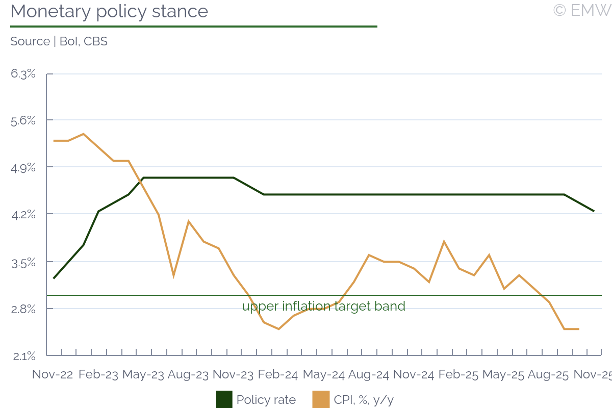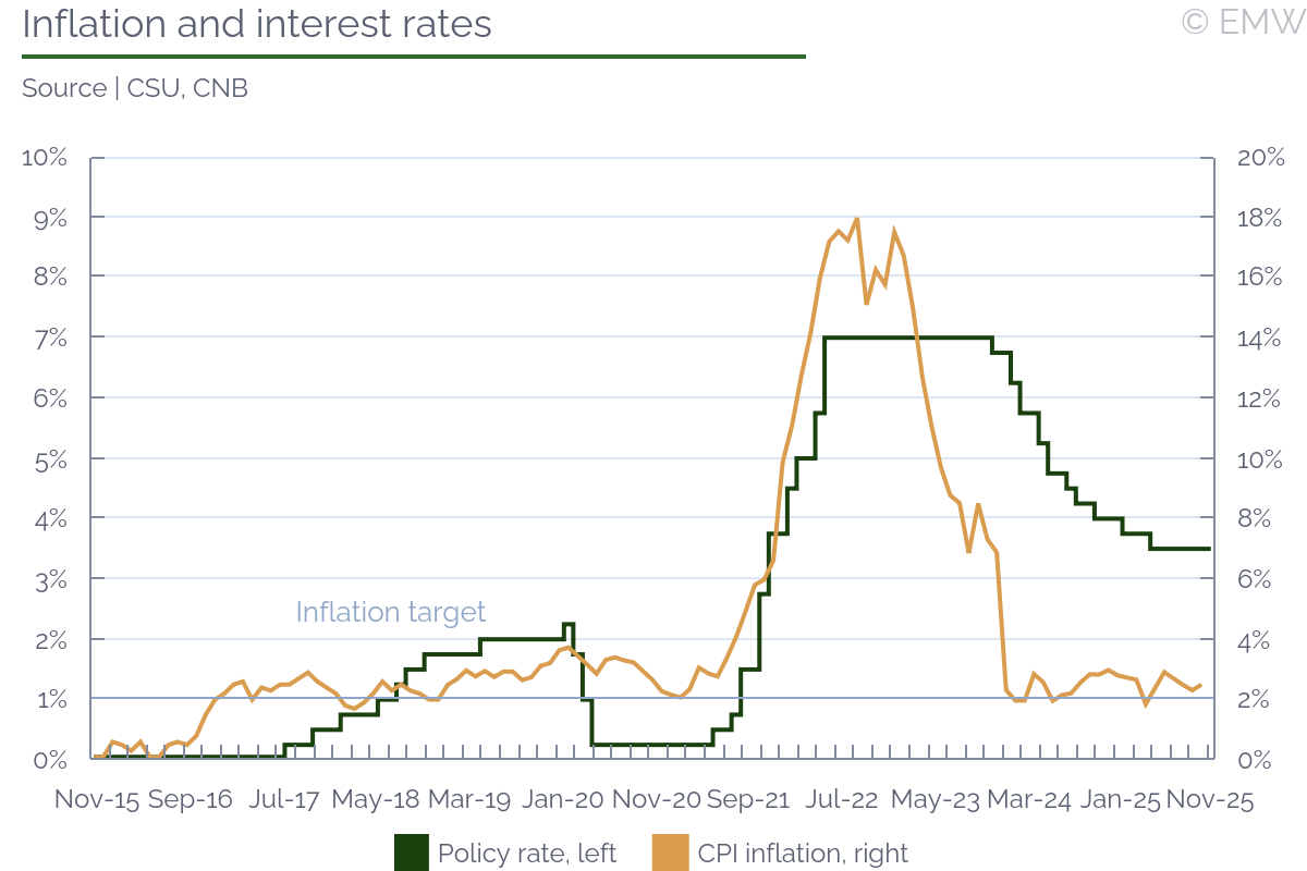 Rationale: The CNB board provided no surprises yet again at its MPC meeting in November, and reinforced its hawkish stance. If anything, the tone of the post-meeting statement turned a bit more hawkish, as it clearly outlined that the outlook was still inflationary, and that risks were only mounting. For the first time, a risk stemming from high government debt in developed economies was added to the statement, as the CNB board is likely concerned with recent developments in France. However, the key risks to the inflation target remain domestic ones, as structural pressure stemming from the labour market and the service sector is still considered high. Furthermore, there are potential risks related to fiscal policy, as the new ruling coalition has made quite generous promises. While most of these will be likely implemented in 2027, the CNB board is apparently wary of fiscal loosening as well. As a result, the CNB board has retrenched in a cautious position, preferring to keep interest rates stable. The decision was again unanimous, and based on board member remarks, there is still consensus about the current stance. During the presentation of the autumn staff forecast, Jan Prochazka mentioned that the latest decision was "easy", implying that there was no disagreement over the current course of action. This was confirmed by the minutes from the November meeting, with board members being increasingly concerned about structural changes in the economy that will likely maintain inflation elevated longer than previously anticipated. In particular, sticky service price inflation is seen directly related to a tight labour market and a robust nominal wage growth. Speaking of the new staff forecast, it lowered GDP growth projections to what markets currently expect, and it still expects core inflation to remain elevated well into 2026. The CNB board is clearly not paying much attention to the headline inflation measure currently, given that food price volatility has led to some noticeable deviation from the staff forecast. However, the forecast has been on the money as far as core inflation is concerned, which is why it remains the indicator to watch. Recent economic developments only support the CNB's current stance, as there has been nothing to indicate that inflation pressure is easing any time soon. Service provider prices maintained a high growth, suggesting that final consumer service prices will remain elevated as well. The labour market keeps showing signs that any easing currently going on is through low-skilled positions, which has a small impact on wage levels. Employer surveys suggest that wage growth will remain substantial in 2026 as well, as they cannot afford losing skilled personnel. With all that in mind, we expect that interest rates will remain stable well into 2026, assuming no new economic shocks take place. Core inflation is expected to start easing in Q3 2026 at the earliest, which is why we place the possibility of some more monetary easing at that point of the year. The delayed introduction of the ETS2, to the beginning of 2028, will likely provide the CNB with some easing space in H2 2026. We don't expect that to exceed 50bps, and only provided that there are no other factors that generate inflation pressure. As global uncertainty remains high, the CNB is very likely to end its wait-and-see approach, which is why rate stability is the path we predict for a while.