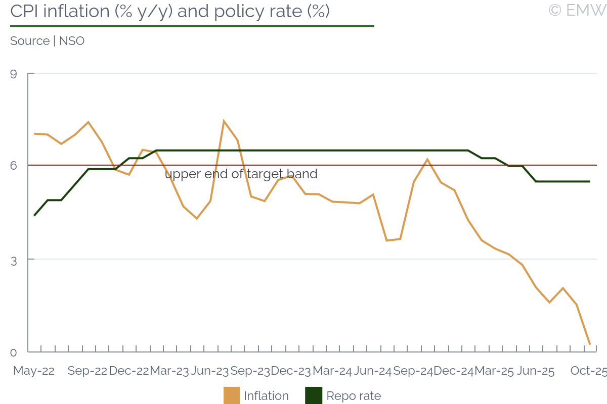Next MPC announcement: 20 November 2025 Current policy rate: 7.0% EmergingMarketWatch forecast: 6.75% We expect the MPC to deliver a 25bps rate cut in November, lowering the repo rate to 6.75%, stepping on the now formally adopted lower 3.0% inflation target with a 1% tolerance band, and looking through the temporary upside pressures on CPI in the final quarter while as usual focusing on the policy horizon. The structural shift in the inflation-targeting framework is expected to embed lower inflation into wage negotiations, social grants, and administered-price adjustments. This shift materially alters the longer-term outlook for services inflation, including education, medical insurance, and utilities, which have historically contributed to higher inflation persistence. The October CPI print will be available for the MPC meeting in November where we expect an acceleration to 3.6% y/y from 3.4% y/y recorded in September. The SARB's Q4 forecast of 4.0% may be revised lower, potentially towards 3.8-3.9% amid the currency's appreciation and declining global oil prices. Domestic fuel price data from the CEF already point to a moderate pump price cut in December, while rand firmness, if sustained, supports further moderation into 2026. In this context, the MPC's emphasis on the policy horizon rather than temporary base effects reinforces the argument for measured easing. Governor Lesetja Kganyago has reiterated that the central bank's priority is to entrench disinflation and drive expectations closer to the new target. He has highlighted that business inflation expectations remain "sticky," even as trade-union expectations have moderated, stressing that the SARB will "bring them down" through credible policy. He has also drawn a direct link between the lower inflation target and South Africa's sovereign risk premium, underscoring that a credible disinflation trajectory reduces borrowing costs and strengthens the macro-financial foundation. This credibility has recently received additional support from South Africa's exit from the FATF grey list, which removes a persistent drag on risk assessments and financial-sector confidence. Furthermore, recent discussions around a potential S&P credit rating upgrade provide an even more favourable backdrop. Together, these developments reinforce the downward drift in the sovereign risk premium and improve the transmission of monetary policy through lower funding costs and better capital-flow dynamics. The global environment also provides cover for easing after the recent 25bps Fed cut widened the SARB's room to manoeuvre and a November reduction would preserve the interest-rate differential even if the Fed remains cautious in December. The rand continues to benefit from softer global dollar dynamics, though geopolitical tensions and trade-related protectionism still weigh on broader emerging-market sentiment. The SARB has consistently noted that monetary policy alone cannot offset structural impediments, but the combination of credible fiscal coordination, governance improvements, and reduced sovereign-risk pressure has materially strengthened South Africa's macro footing. Overall, we expect a majority of MPC members to favour a 25bps reduction, particularly given that two members already voted for a cut at the September meeting. The balance of evidence since then including lower inflation risk, improved credibility, a stronger institutional backdrop, and supportive global conditions could sway the MPC majority toward another cut after the pause in September. Provided inflation expectations continue to move toward the 3% anchor and CPI follows the projected disinflation path, the SARB should have room for further gradual reductions in 2026, aligning the policy stance with inflation settling at 3% over the forecast horizon. Monetary Policy Committee Statement | |||||||||||||||||||||||||||||||||||||||||||||||||||||||||||||||||||||||||||||||||||||||