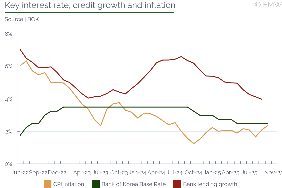 The Bank of Korea is likely to hold its policy rate yet again at 2.5% in its next policy meeting on Nov 27 due to its concerns about excessive real estate speculation, in our view. We remind that the BOK has held its policy rate at 2.50% in the past 3 meetings, with only 1 member voting for a rate cut in the past 2 meetings. The central bank had signalled a wait-and-see attitude regarding the impact of macroprudential measures taken by the government in late June and mid-October to tame real estate prices, especially in the capital Seoul. Considering that both growth and inflation have picked up recently, BOK is likely to stay on hold for longer, or potentially change its policy stance. The bank has maintained a policy easing stance throughout the entire 2025 in light of the fact that GDP growth remains below the estimated potential growth rate of 2%. However, BOK's governor Rhee signalled a potential shift in the policy stance in an interview on Nov 12, depending on incoming data. Real estate prices remain key factor preventing easingIn our view, the central bank would have cut the policy rate by 25bps in its previous meeting on Oct 23 if real estate prices did not surge higher at the beginning of the month. As a result, authorities adopted a new round of macroprudential measures on Oct 15 aimed specifically at discouraging real estate speculation in the capital Seoul. The government has been also supportive of BOK's actions, with President Lee supporting the rate freeze in an interview on Oct 27 in which he also said the real estate market is a "ticking time bomb." At the same time, the BOK released a report on Nov 11 in which the authors said that further monetary policy easing might be ineffective due to the unreasonable housing price expectations that distort investment activity and crowd out other investment. The minutes from the Oct 23 meeting also showed that five out of the six BOK members expressed serious concerns about the situation in the property market as only 1 member voted for a rate cut in last month's meeting. Looking at recent data, apartment prices in Seoul rose by 0.19% w/w in the week ending Nov 3, which is still a very strong increase as it implies an annualized growth of more than 10%. In our view, the BOK will want to see apartment price growth rate of below 0.10% w/w in the capital Seoul before it resumes easing. Inflation reaches a 15-month high in October as domestic demand recoversCPI inflation accelerated to 2.4% y/y in October from 2.1% y/y in September, reaching a 15-month high. This is another reason for the BOK to stay on hold as inflation accelerated tangibly for a second month in a row. In particular, core CPI inflation remained relatively high at 2.5% y/y in October, which suggests some revival in demand-pull pressures. Still, most forecasts continue to expect that inflation will average around 2% in both 2025 and 2026. Simultaneously, domestic demand rebounded in Q3 as private consumption rose at the fastest pace in 12 quarters by 1.3% q/q in Q3 led by the consumption stimulus provided by the new government. In addition, the construction downturn seems to have bottomed in Q3, which supported the recovery of investment demand. As a result, gross fixed capital formation rose by 0.8% q/q in Q3 and posted its first increase in 9 quarters. Despite the impact of US tariffs, net exports also gave a positive contribution of 0.1pps to growth in Q3 thanks to high-flying sales of memory semiconductors. ConclusionOverall, the BOK is less pressured to cut rates due to the strong performance of the domestic economy in Q3, the surging memory semiconductor exports, and the diminished uncertainty about US tariffs. In addition, the new government has given clear signals that it is looking to support growth with a pro-growth Budget 2026. On the other hand, both inflation and real estate prices have become hotter. The persistent weakening of the Korean won versus the US Dollar is another factor that will likely impact BOK's policy decision. In our view, a rate hold in November is almost a done deal as the central bank awaits both a normalization of the property market and the new economic forecasts that will be released in November. Looking at 2026, the BOK might adopt a neutral stance depending on its expectations for growth next year. In particular, if the growth forecast is revised closer to the potential growth rate of 2% in 2026, the BOK will have few reasons to maintain the current easing stance. Useful Links | |||||||||||||||||||||||||||||||||||||||||||||||||||||||||||||||||||||||||||||||||||||||