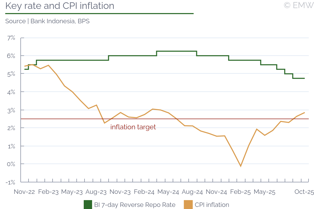 Bank Indonesia cut the key rate by 75bps cumulatively Jul-Sep, before pausing the monetary easing cycle in Oct-Nov. This has brought total rate cuts to five (125bps) since the beginning of the year. The central bank justified the rate cuts with the need to support GDP growth in a low-inflation environment, as the rupiah stabilised against the dollar in the period. However, the last two hold decisions came on the backdrop of a depreciating rupiah, which brought to a temporary halt the monetary easing aimed at stimulating economic growth. So far, the central bank has become more and more dovish in light of the low inflation and economic growth slowdown. Moreover, CPI inflation remains within the central bank's 2.5+/-1% target band, although it accelerated in the last three months, surpassing the midpoint of the target range. Still, inflationary expectations remain firmly anchored to the central bank's target. We should also note that the new FinMin, Purbaya Yudhi Sadewa, criticised the central bank for being too hawkish and late with rate cuts to stimulate economic growth. The FinMin advised that the key rate should be 1pp higher than inflation, which suggests he sees it at 3.5-4.0% in the long term. As a result, we think BI will resume monetary easing once the rupiah stabilises, possibly in January. GDP growthGDP growth eased slightly to 5.04% y/y in Q3 from 5.12% y/y in Q2. Investment and private consumption were the main factors behind the slowdown, while higher public spending largely offset their impact. The BI has maintained its GDP growth forecast at 4.6-5.4%, but said economic growth will be slightly above the midpoint, while most IFIs and rating agencies have their forecasts even lower at 4.7-4.9% in 2025. We should note that the government has taken steps to support economic growth in H2. These include two stimulus packages worth IDR 43tn combined to be disbursed in Q4, mostly December, as well as the placement of IDR 200tn government funds from the surplus budget balance (previously kept with the central bank) into commercial banks in a bid to boost lending. Exchange rate stabilityAfter the BI started easing monetary policy, the rupiah reversed some of the gains made earlier this year. As a result, its YTD depreciation is about 3.0%, with the exchange rate now back into the USD/IDR 16,600-16,800 range in November. The governor stated that Bank Indonesia will continue to use its tools to keep the local currency stable. In fact, the BI has been regularly intervening in the forex market since the beginning of the year, when volatility increased due to capital outflows seen in other EMs as well. Moreover, the Fed rate cuts have given Bank Indonesia further confidence to slash the key rate as pressure on the rupiah has eased, despite that it remains one of the worst performing currencies in the region. However, the pace of Fed rate cuts might slow down, despite widespread market expectations for another 25bp rate cut, judging from the latest comments of Fed chair Jerome Powell. Inflation environmentCPI inflation accelerated 2.86% y/y in October from 2.65% y/y in September from 2.31% y/y in August, thus edging up from the midpoint of the BI's 2.5+/-1% target band. Looking forward, inflation expectations have also shifted towards lower inflation this year, with most projections pointing to CPI inflation remaining below the midpoint of the central bank's 2.5+/-1% target band by the end of the year. The latest IMF forecast points to 1.8% CPI inflation this year. At any rate, Bank Indonesia expressed confidence that CPI inflation will remain under control and within the target band in 2025. This projection looks realistic, in our view, especially given the recent stabilisation around the midpoint of the target band. In his most recent statement, commenting on the possible rupiah redenomination, BI Governor Perry Warjiyo said the central bank is focused on maintaining stability and promoting GDP growth, without mentioning inflation at all. ConclusionLooking forward, we expect Bank Indonesia to keep the key rate on hold in December, possibly awaiting the Fed to take the lead and slash the Fed Funds rate first. In addition, it could focus on accelerating government debt purchases on the secondary market, liquidity provision and stimulating credit growth. In fact, the recent monetary easing amidst the rising pressure from the government has also raised concerns about the central bank's independence, though it has countered those with the last two hold decisions. On the other hand, there is a possibility, although lower in our view, that BI cuts the key rate by 25bps as soon as December, surprising markets once again as it did during the recent monetary policy easing cycle. We should note that if the Fed continues with the rate cuts due to the persistent low inflation in the US, coupled with the stagnating labour market, it may prompt other central banks to follow suit and reduce rates as well. Further reading | |||||||||||||||||||||||||||||||||||||||||||||||||||||||||||||||||||||||||||||||||||||||