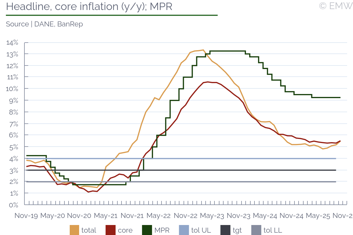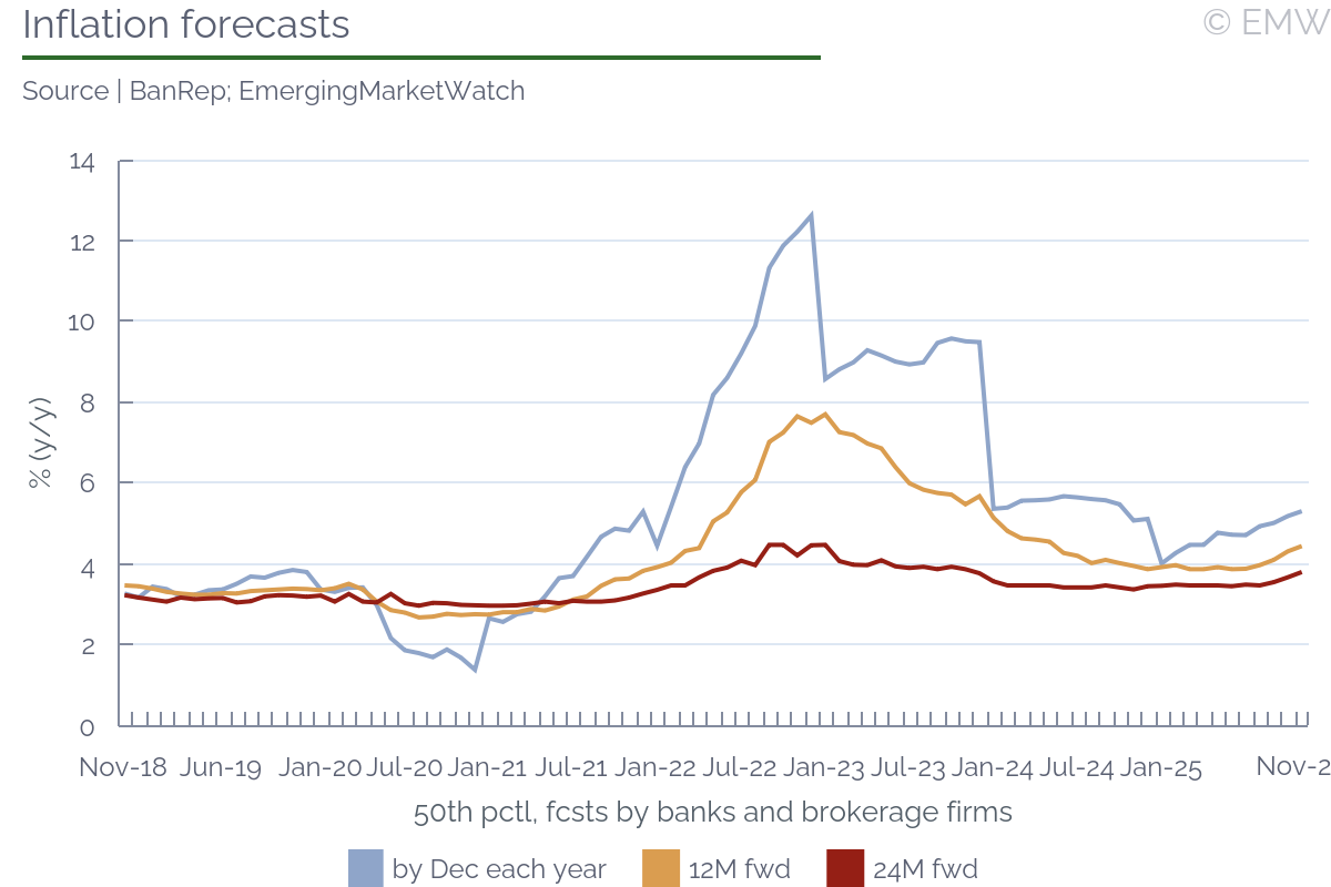 Inflation expectations among banks and brokerage economists rise again in November, with year-end inflation now forecast at 5.3%, up from 5.2% in October, according to BanRep's latest economic analysts survey. This marks the fourth consecutive monthly increase and indicates a continued decline in the short-term outlook. Expectations for the next twelve months rose to 4.47% from 4.35%, extending a five-month streak of increases. For the twenty-four-month horizon, forecasts increased to 3.8% from 3.7% in October, the third straight rise. Overall, these figures suggest that inflation would only drop below the 4% upper limit of the tolerance band sometime between Nov 2026 and Nov 2027. The survey also includes a sixty-month horizon, which had converged to the 3% target in October but now stands at 3.3%. Note that this steady upward trend in expectations increases the likelihood that the more hawkish members of the board will support a rate hike at the final meeting of the year on Dec 19. Board member Mauricio Villamizar first brought up this possibility in late October, and Governor Villar echoed it on Nov 12. We believe the most likely outcome remains a 25bp increase, especially if the November CPI report, due on Dec 5, shows renewed acceleration and if the government announces a 2026 minimum-wage adjustment that the central bank would consider inflationary before the meeting. That said, a pause cannot be ruled out. While Q3 GDP surprised to the upside, this does not necessarily argue for keeping rates on hold. From an orthodox inflation-targeting perspective, stronger-than-expected activity would normally support a more restrictive stance, especially if inflation is proving sticky. However, the key issue here is the unusually high uncertainty surrounding the national accounts data. Preliminary GDP figures have been repeatedly and significantly revised in recent quarters: The q/q growth rate for Q1, for example, moved from 0.8% (initial) to 0.3% three months ago, and, most recently, to 0.5% in the Q3 release (when looking at the SA CA adjusted series). Given this pattern, the Q3 rebound should be treated with caution, and BanRep may prefer to wait for more reliable information before tightening policy further. We therefore believe BanRep is most likely waiting for clarity from the government on the minimum-wage decision. If that announcement is made after Dec 19, and if inflation continues to rise, a rate increase at the end of January 2026 would be hard to avoid.