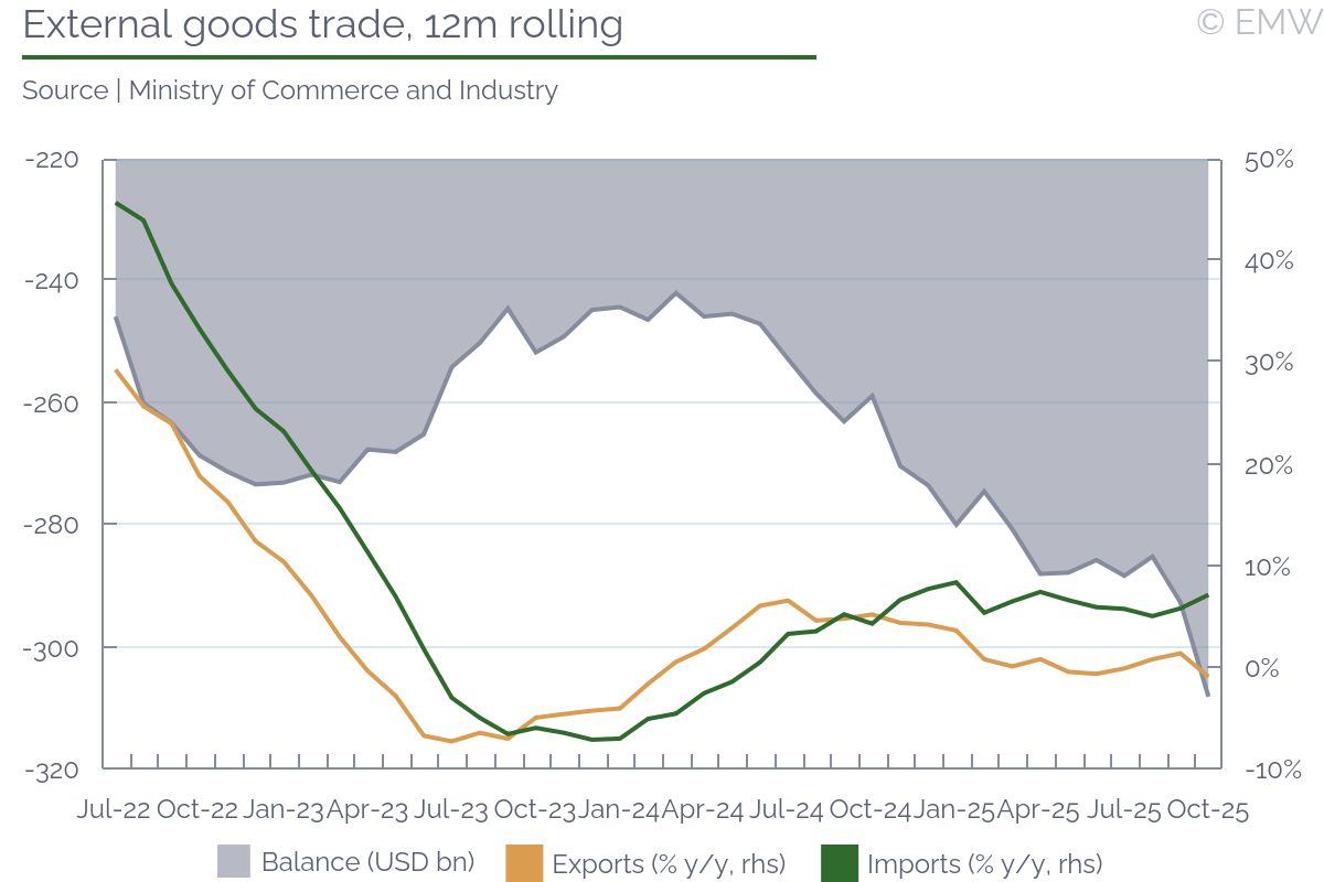 The MPC will hold its next interest rate meeting on Nov 20 and we expect that the committee will deliver another 100bps rate cut, bringing the cumulative cut since April to 725bps. The government raised the petrol and diesel prices by about 13% mid-October as part of a reform program that is monitored by the IMF. The fuel price hike - and especially the sharper 15% increase in diesel prices - has disrupted the disinflation trend. However, the real interest rate remains fairly elevated and the recent appreciation of the pound leaves room for another rate cut, in our view. It should be noted that analysts are divided on this week's meeting - while the majority leans towards a 100bps rate cut, some see a smaller 50bps cut, and other expect the MPC to maintain the current interest rates. As noted, the pound has gained strength since April due to strong remittance, portfolio, and tourism inflows, and partly due to US policy aimed at weakening the US dollar. Despite the surge of portfolio inflows over the past year and a half, Egypt has managed to boost its resilience to external shocks and the latest two major external shocks - the US tariffs announced in early April and the 12-day war between Israel and Iran mid-June - had limited impact on the country. GDP expanded robustly in 2024/25 as non-oil manufacturing rebounded and private consumption and investments improved further, but economic growth is still below potential, according to the CBE, suggesting that demand-side inflationary pressures are relatively modest. Headline inflation is expected to moderate further in 2026, albeit at a slower pace. As such, underlying inflation is expected to converge to its historical average over the medium term as inflation expectations improve further, the MPC said in a recent inflation monitoring report. Inflation is expected to average 14% y/y in 2025 before moderating to 10-12% in 2026 and GDP growth is expected to reach its full potential by mid-2026. Demand-side inflationary pressures may begin to surface after that. | |||||||||||||||||||||||||||||||||||||||||||||||||||||||||||||||||||||||||||||||||||||||