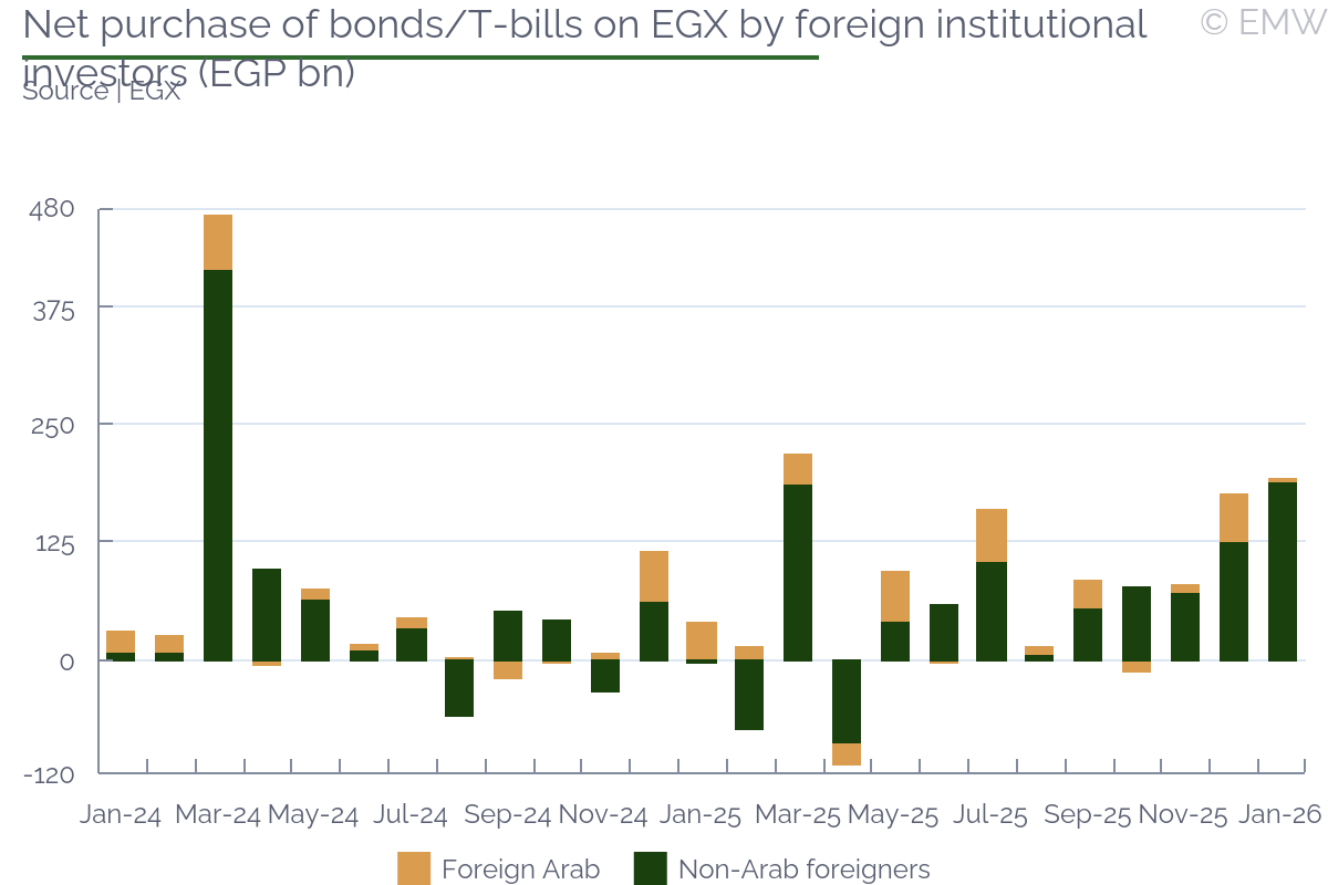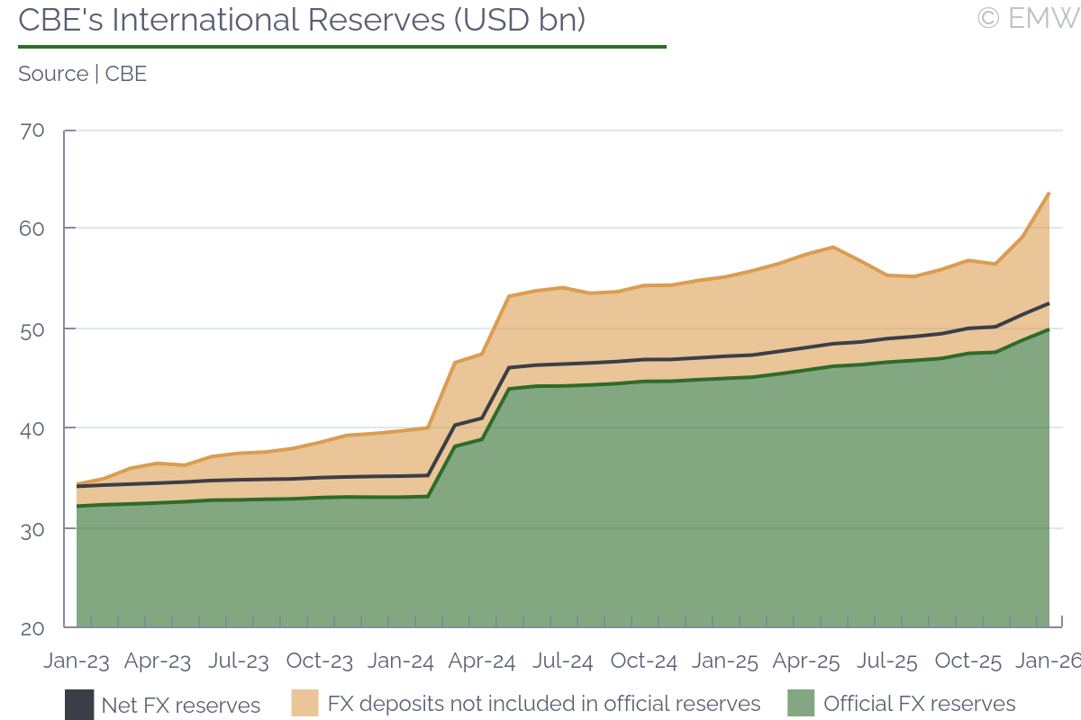 Egypt's net international reserves rose by USD 1.1bn or 2.2% m/m to record-high USD 52.6bn as of end-January, the central bank reported. The m/m increase was mostly due to Gold reserves (+USD 2.6bn, reflecting soaring prices), Currency and Deposits (+USD 1.3bn) and Securities (+1.0bn), while Reserve assets other than derivatives and loans to nonresident banks fell by USD 3.9bn. Egypt recorded another strong month of portfolio inflows in January and the EU disbursed an EUR 1bn tranche that month, whcih supported FX accretion. We note that FX reserves have surged since early 2024 after Egypt received USD 24bn in a massive real estate deal with the UAE, while long-delayed currency reform helped the government secure USD 8bn IMF financing and additional funds from development partners. Portfolio investors rushed in to buy short-term debt attracted by high nominal interest rates and improved FX liquidity. Foreign funds have bought around USD 38bn worth of T-bills and bonds on EGX's secondary market and another USD 8-10bn directly from the banks (not accounting for roll-overs and maturities), the latter boosting the foreign assets of the commercial banks and resulting in a surplus of the banks' NFAs for the first time in two years. Meanwhile, CBE's FX deposits in domestic banks, which are available as a source of FX liquidity, rose by sharp 33% m/m to USD 13.7bn at the end of the review month. We usually attribute the movement in this FX position to portfolio flows, and the increase in January aligns with the strong inflows reported by the stock exchange. Egypt and the IMF reached staff-level agreement in December on the fifth and sixth reviews of the USD 8bn EFF program. The IMF Executive Board is expected to approve the reviews by the end of February, which will unlock USD 2.5bn tranche and will bring total disbursements under the program to USD 5.7bn. Separately, Egypt expects to receive another USD 1.3bn disbursement from the IMF's resilience and sustainability package. Meanwhile, the pound has continued to appreciate, partly due to surging portfolio inflows, strong remittances and tourism arrivals, and partly due to US policies aimed at weakening the USD. Analysts have turned more optimistic on the Egyptian pound, with many expecting it to remain broadly stable throughout the year despite anticipated interest rate cuts by the CBE and the large external debt payments due over the medium term.