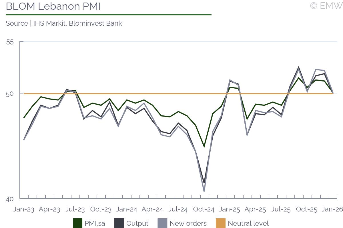 Lebanon's private sector Purchasing Managers' Index (PMI) decreased to 50.1 in January, down from 51.2 in December, remaining just above the 50.0 no-change threshold and signaling a marginal expansion in business conditions for a sixth consecutive month, according to the latest S&P Global PMI report published today (Feb 4). The reading marked the weakest pace of growth during the current upturn and pointed to a clear loss of momentum at the start of 2026. The slowdown reflected softer trends in both business activity and new orders. Private sector output stagnated in January, ending a solid five-month expansion, as demand weakened noticeably. New orders increased only fractionally, weighed down by cancellations, postponed projects and subdued investment activity. Demand from international clients also declined slightly, adding to pressure on overall sales performance. In response to weaker demand, firms reduced purchasing activity for the first time since July 2025, cutting orders of raw materials and intermediate goods. While some businesses reported a lower need to replenish stocks, inventories continued to rise, extending the current accumulation trend to seven months. Supply chain conditions remained broadly stable, with delivery times showing little change during the month. Moreover, cost pressures persisted but eased. Purchasing costs increased due to higher import fees and rising metal and construction material prices, although the rate of inflation slowed to a five-month low. Output charges also rose at a softer pace, with only a small share of firms raising selling prices as they sought to protect margins. Looking ahead, sentiment among Lebanese private sector firms remained pessimistic, albeit slightly less negative than in December. Ongoing security concerns and fears of an escalation in regional military tensions continued to weigh on business expectations, highlighting the fragile nature of the recovery despite the PMI's record six-month run in expansion territory. | ||||||||||||||||||||||||||||||||||||||||||||||||||||||||||||||||||||||||||||||
