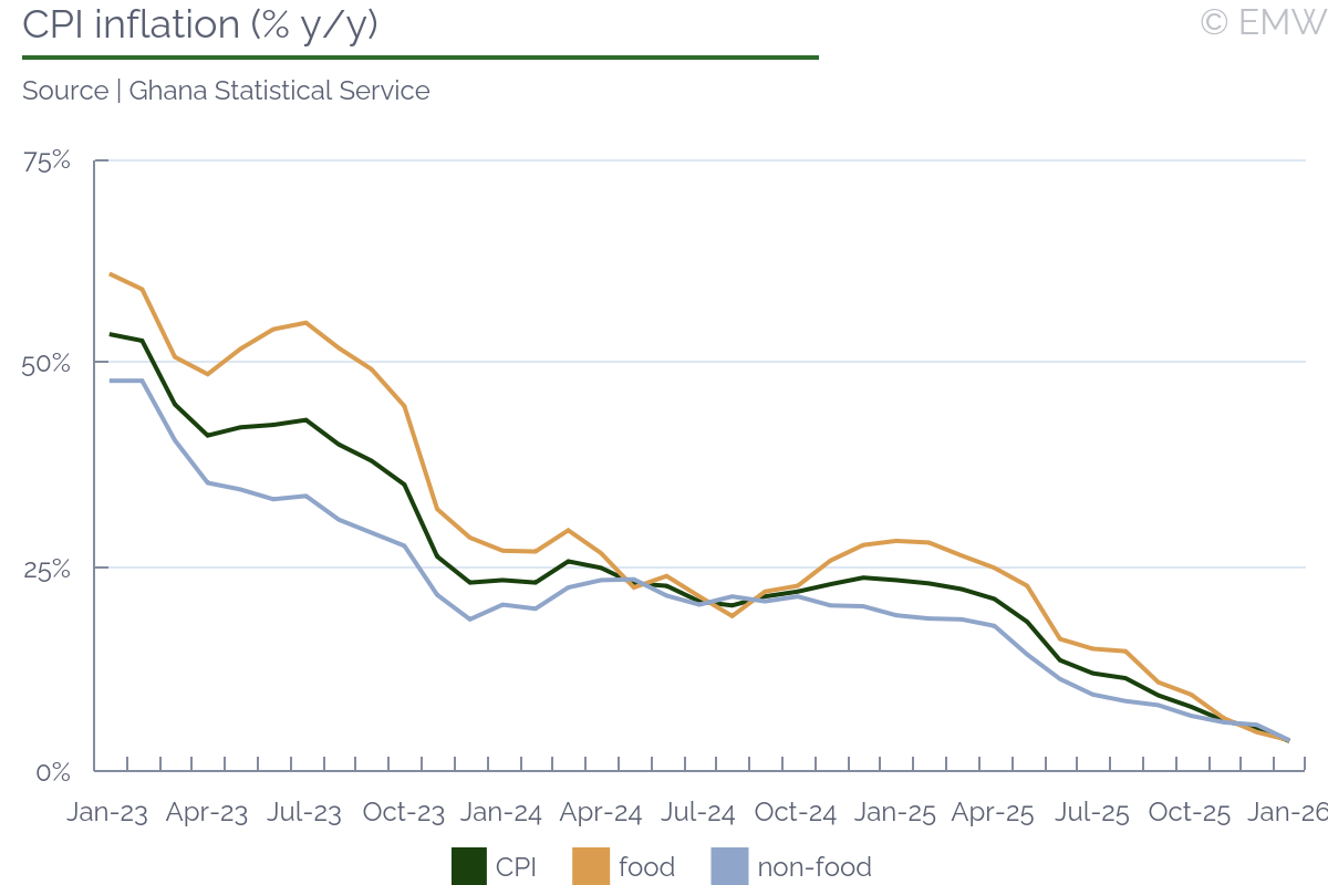 The country's CPI inflation rate slowed down further to 3.8% y/y in January from 5.4% y/y in December, hitting the lowest level since 1985. The VAT rate cut, from 21.9% to 20.0%, as of Jan 1 has had an effect on the headline print, but the biggest downward contributions came from food, clothing and footwear, housing and utilities, and alcoholic beverages and tobacco. Food inflation fell to 3.9% y/y from 4.9% y/y in December, reflecting annual drops in some vegetable, fish and egg prices. However, in m/m terms, food prices still rose by 1.1% m/m, unchanged from the preceding month. Non-food inflation fell even faster to 3.9% y/y from 5.8% y/y, which was due to monthly drop in prices of automotive and solid fuels, as well as of clothing and footwear, and alcoholic beverages and tobacco. The overall CPI rose by 0.2% m/m in January, slowing from 0.9% y/y in December, thanks to the 0.4% m/m drop in non-food prices. The drop in the inflation rate offers more scope for another rate cut by the central bank, possibly already at the next MPC meeting in March. At the meeting in January, it cut the rate by 250bps to 15.5%, after cutting it by a total of 1,000pps in 2025. The central bank said it expects inflation to stay within the medium-term target of 6-8% over the coming year, barring potential spillover from the hikes in utility prices and commodity market volatility. GDP growth is seen to remain strong this year and although this is seen to exert some demand-side pressures, the current monetary conditions are assessed as still tight relative to prevailing inflation dynamics.