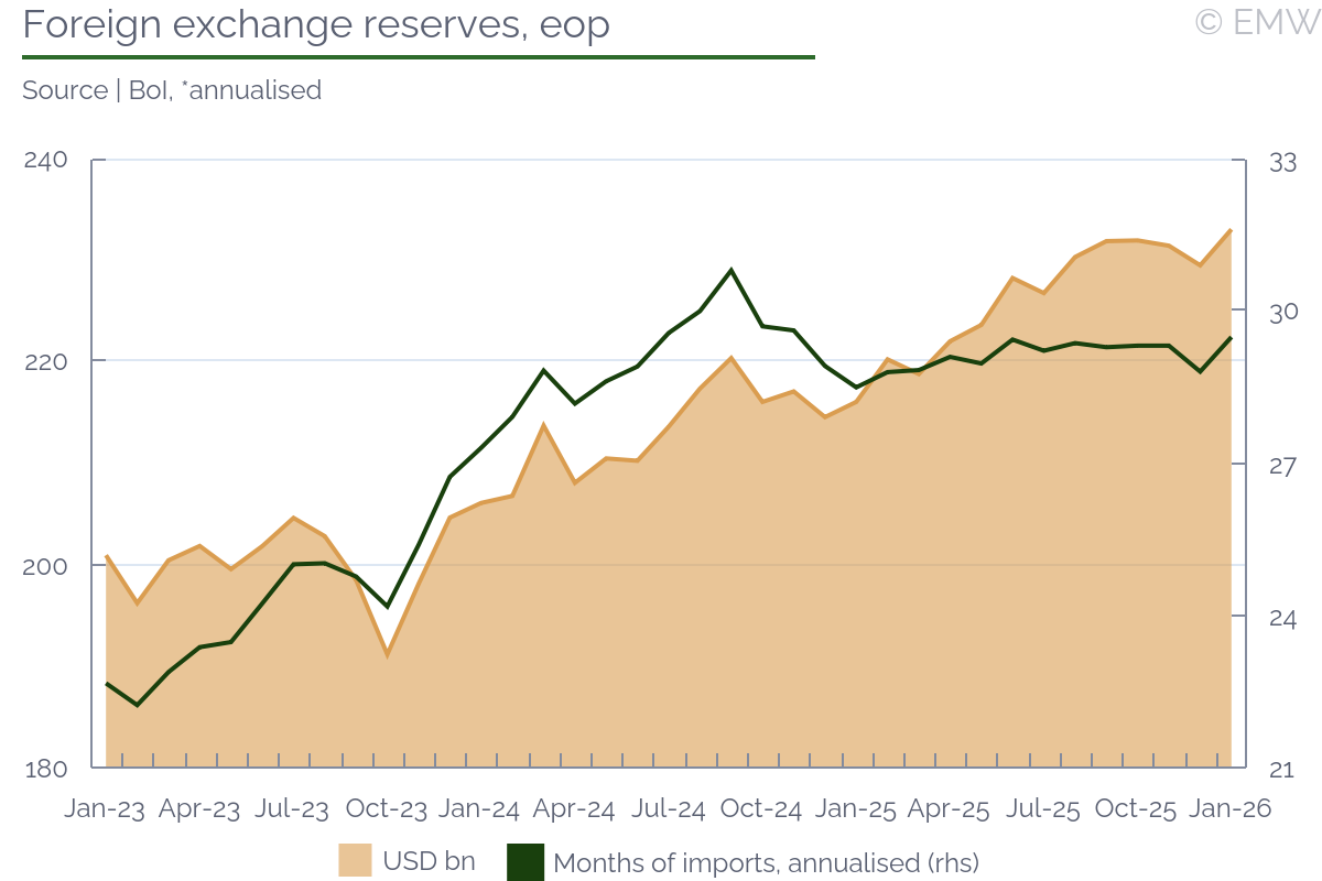 The foreign exchange reserves of the Bank of Israel (BoI) rose by 1.5% m/m or USD 3.54bn to USD 233.0bn at the end of January hitting another record high, according to the latest data from BoI. Revaluation effects were again the major driving force as they contributed by USD 3.07bn in the period. Government transfers also had a positive impact as they rose by USD 465mn in the month as a result of the Eurobond sale. There were no other significant flows in the month, according to the BoI. Forex reserves accounted for 39.9% of GDP at the end of January, the BoI said in the press release. The reserves secured 29.5 months of imports at the end of January, up by 0.7pps during the month, according to our calculations. The import-coverage ratio was the strongest since October 2024. | ||||||||||||||||||||||||||||||||||||||||||||||||||||||||||||||||||||||||||||||