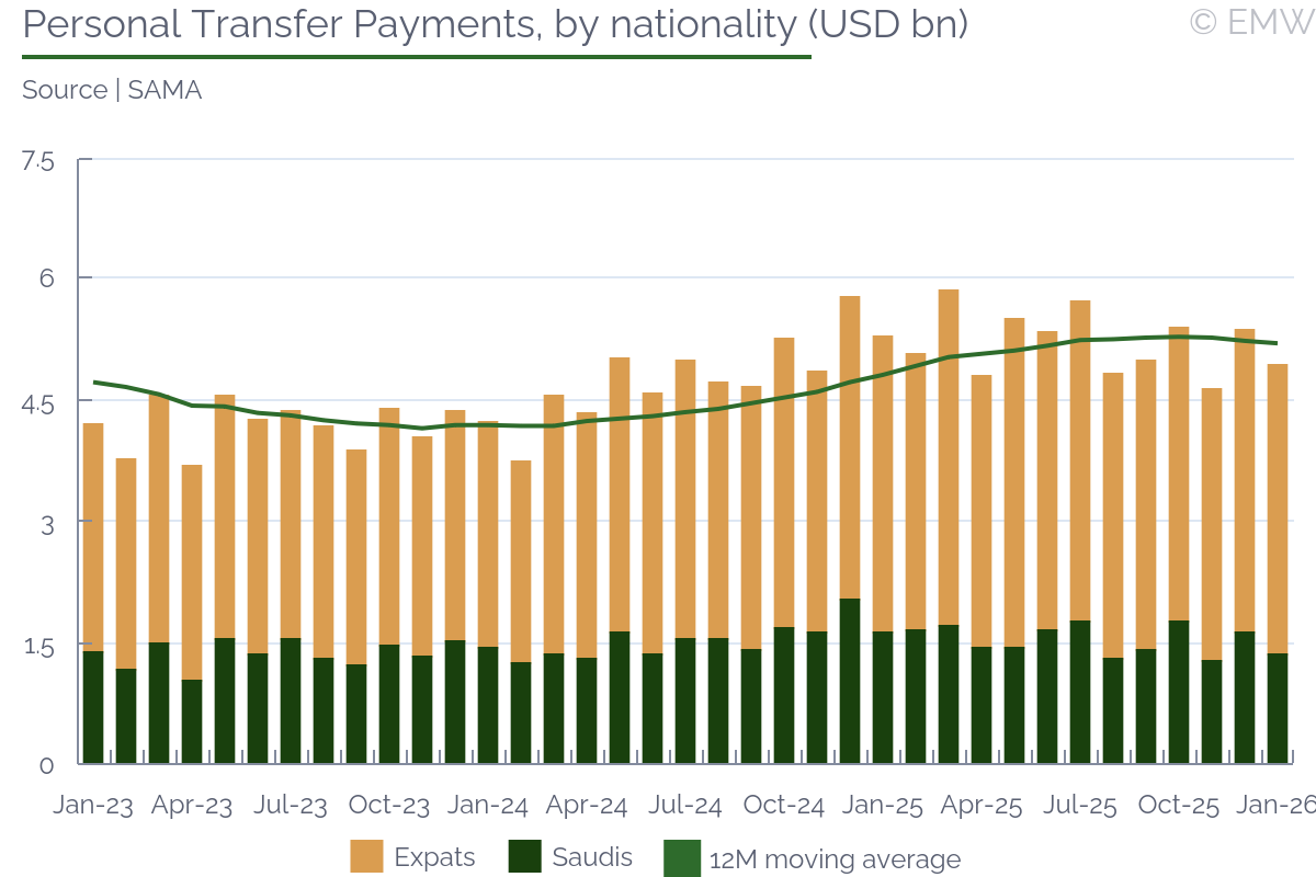The personal transfer payments fell by 5.8% m/m to USD 4.6bn in February, following a strong 8.2% m/m drop in the preceding month, according to figures released by SAMA. Unlike the decline in January, the latest drop was due to the fewer calendar days of February. When adjusted for the number of calendar days, remittances actually rose by 4% on the month. Remittances from expats living in Saudi Arabia account for two thirds of the payments, the rest are payments made by Saudi nationals. The large remittance outflows are a structural feature of Saudi Arabia's Current Account as the country relies heavily on foreign workers, especially in the construction sector. Saudi Arabia scaled down many of the giga-projects due to weaker oil revenues and the war in Iran is likely to drag on investments, so we think the growth in the remittance payments will be contained this year. Further, the government had deployed measures to encourage the employment of Saudis and to reduce the reliance of foreign workers, so we expect a gradual moderation in foreign employment in the coming years. We remind that remittance outflows rose by a strong 11% y/y to USD 62.9bn in 2025, which came on top of the 13% y/y growth recorded in 2024. Remittance outflows account for about 5% of GDP and 14% of SAMA's foreign reserves. The personal transfer payments account for about 45% of Saudi banks' sales of hard currency for specific purposes, with the remaining sales allocated to import financing (around 25%) and foreign contractors (around 30%). The share of personal transfer payments in the total sales of hard currency (including third parties such as foreign banks and other Saudi customers), is around 7%. | ||||||||||||||||||||||||||||||||||||||||||||||||||||||||||||||||||||||||||||||||||||||||||||||||||||||||||||||||||||||||||||||||||||||||||||||||||||||||||||||||||||||||||||||||||||||||||||||||||||||||||||||