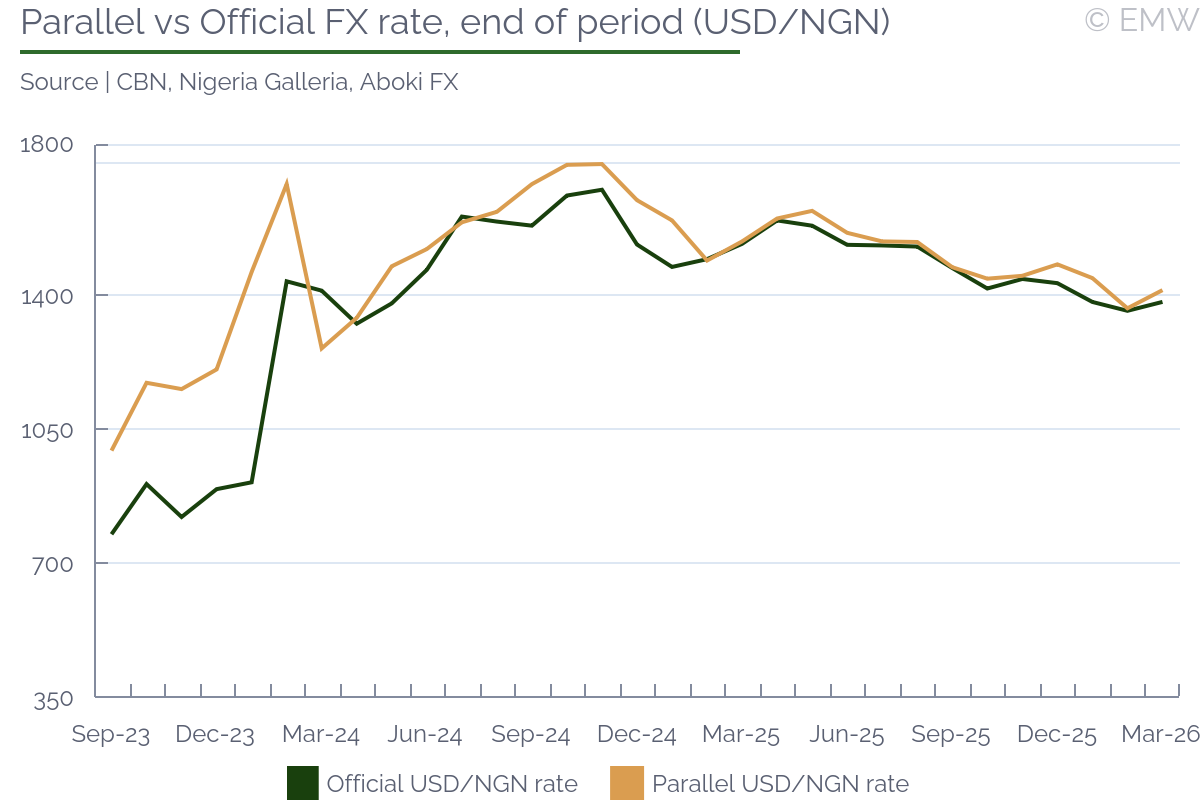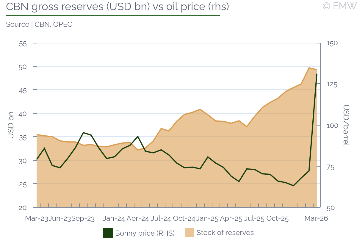 The gross external reserves of the central bank (CBN) fell by USD 398mn or 0.8% m/m to USD 49.3bn as of end of March, after growing by 7.4% m/m the month before. Over the course of the month, reserves peaked at USD 50.03bn on March 11 but have declined continuously since then. Geopolitical conflict in the Middle East triggered a flight from emerging markets, leading to some portfolio outflows from Nigeria. Despite elevated global oil prices, Nigeria has not seen a strong boost in FX earnings because oil production remains limited. March's level of reserves is still among the highest the country has ever recorded (before this year, the highest was USD 47.9bn in April 2013). Reserves are up by a net of NGN 3.8bn in 2026, from USD 45.5bn at the end of December 2025. This is mostly due to a large jump in reserves during February. The central bank projects that Nigeria's external reserves will reach USD 51bn in 2026. The decline in reserves has put some downward pressure on the naira during the past month. The naira closed February at USD/NGN 1,364 and had appreciated to USD/NGN 1,344 by March 19, before steadily weakening to USD/NGN 1,387 by the end of March. On a m/m basis, the currency depreciated by 1.7%. To address currency pressures and boost liquidity, the CBN is introducing new FX measures. Starting May 1, international money transfer operators (IMTOs) must route all diaspora remittances only through naira settlement accounts with authorised banks. Additionally, FX restrictions on international oil companies (IOCs) have been removed which will allow them full repatriation of export proceeds. While analysts caution that giving IOCs full access to FX could temporarily increase FX demand, the long-term benefits are expected to outweigh short-term pressures by easing operational constraints for IOCs and attracting foreign capital inflows. | ||||||||||||||||||||||||||||||||||||||||||||||||||||||||||||||||||||||||||||||||||||||||||||||||||||||||||||||||||||||||||||||||||||||||||||||||||||||||||||||||||||||||||||||||||||||||||||||||||||||||||||||