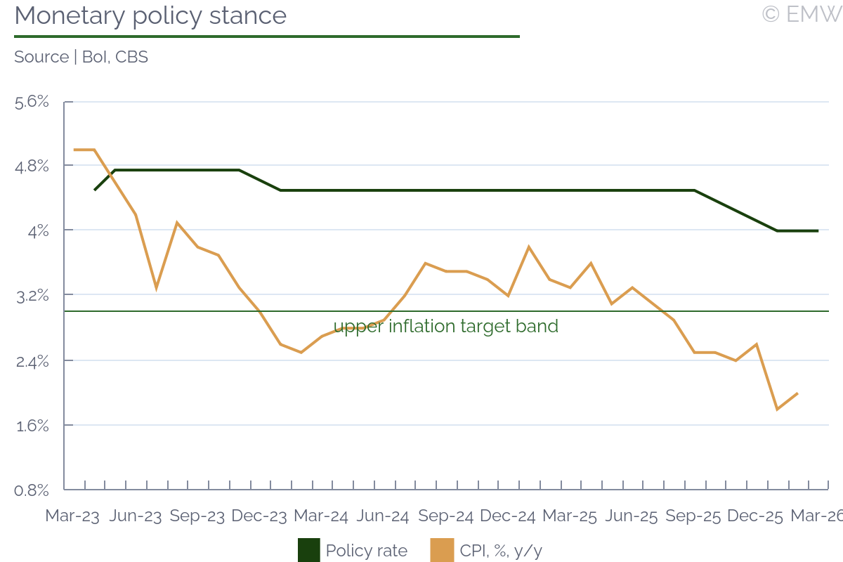 The fighting with Iran and Hezbollah has completely changed the path of the monetary policy and any monetary easing is likely to be delayed towards the end of the year or even early next year. The next decision is set to take place on May 25 with latest central bank and government projections assuming that at least the war with Iran would have ended by then. The duration of the war and its outcome are likely to have a material effect on inflation developments and therefore it is very difficult to predict at this point when and if the monetary easing would continue this year at all. The latest central bank forecast assumes 1-2 policy rate cuts by Q1 2027 as compared to predicted 2 rate cuts by the end of 2026 in the previous projection from January. Governor Yaron has suggested that some easing might indeed take place but certain conditions need to be met. Inflation sped up to 2.0% y/y in February and even if slightly higher than expected, it remained at the mid-point of the 1-3% target range for the second consecutive month and within the band ever since August. The outlook, however, has deteriorated with the start of the Iran war and the next print will very likely confirm that a change in trend has taken place in February. One of the immediate effects on inflation should come from the spike in world oil prices, which in Israel would be moderated in March by the fact that gasoline prices are regulated and were already fixed for March before the war began but we estimate a relatively strong impact of some 0.4pps in April. Flight tickets and sea freight transportation are likely to have added to the upward pressure too as well as another reversal towards a stronger tightening of the labour market due to absences from work and a spike in the number of reservists and general transportation disruptions. The housing component has been with an inflationary impact in the past few months and might continue pushing up the headline CPI increases in the following months as housing stock will be affected by damages from missiles. The shekel appreciation has been an important factor behind the easing inflation but after the initial euphoria at the start of the fighting, the shekel started weakening and will not be able to offset inflationary pressures at least in the short term, we think. GDP increased by 4.2% saar terms (seasonally-adjusted annualised rate) in Q4 and by 2.9% in 2025. Initial data pointed to strong economic activity in Jan-Feb but with the start of the new fighting with Iran, things have changed for the worse. Economic activity was initially restrained to essential activities only and the finance ministry estimated that this would cost some 0.45% of GDP per week but a partial reopening started less than a week after the war began, which should more than halve costs. The previous conflict with Iran pulled the economy to a decline of 4.3% saar in Q2 2025 (previous Iran war was in June 2025) but a strong rebound of 12.7% in Q3 followed, which showed a more than full recovery of the economy. This year's war is likely to have a much larger negative impact on GDP as it is already much longer and more intense. In any case, the MPC is stressing on inflation when deciding on the monetary policy and therefore we think that the economy would not be a major consideration when deciding on the policy rate. Board statements, press briefings, minutes from MPC meetings | ||||||||||||||||||||||||||||||||||||||||||||||||||||||||||||||||||||||||||||||||||||||||||||||||||||||||||||||||||||||||||||||||||||||||||||||||||||||||||||||||||||||||||||||||||||||||||||||||||||||||||||||