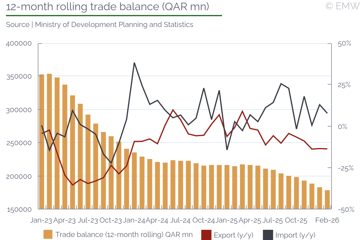 China was the main source of Qatar's imports with a share of 18%, followed by the United States (11%), and the UAE (7%). Outlook The current data aligns with previous projections that Qatar's trade surplus would narrow in the January and February 2026 due to softened hydrocarbon valuations and increased import requirements for major national projects. The industrial base remains heavily reliant on high-value Western engineering and technology - particularly from the US and Europe - to facilitate its energy infrastructure. However, the ongoing US and Israeli strikes against Iran, which began on Feb 28, are complicating Qatar's trade outlook for March and April. State-owned QatarEnergy stopped LNG production and declared force majeure on shipments of LNG following Iranian drone attacks in early March. Even if the conflict ends immediately, it could take at least a month to return to normal production volumes due to the technical complexity of restarting gas liquefaction. This suggests that exports will fall sharply in March and likely April as well. The declaration of force majeure and the logistical paralysis caused by the closure of the Strait of Hormuz will likely result in a historic contraction of export revenues in March and April, as Qatar is physically unable to move its product. Similarly, imports are likely to decrease as foreigners and tourists leave or avoid Qatar and the war in Iran disrupts supply chains and logistics. | ||||||||||||||||||||||||||||||||||||||||||||||||||||||||||||||||||||||||||||||||||||||||||||||||||||||||||||||||||||||||||||||||||||||||||||||||||||||||||||||||||||||||||||||||||||||||||||||||||||||||||||||