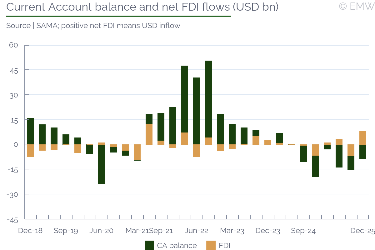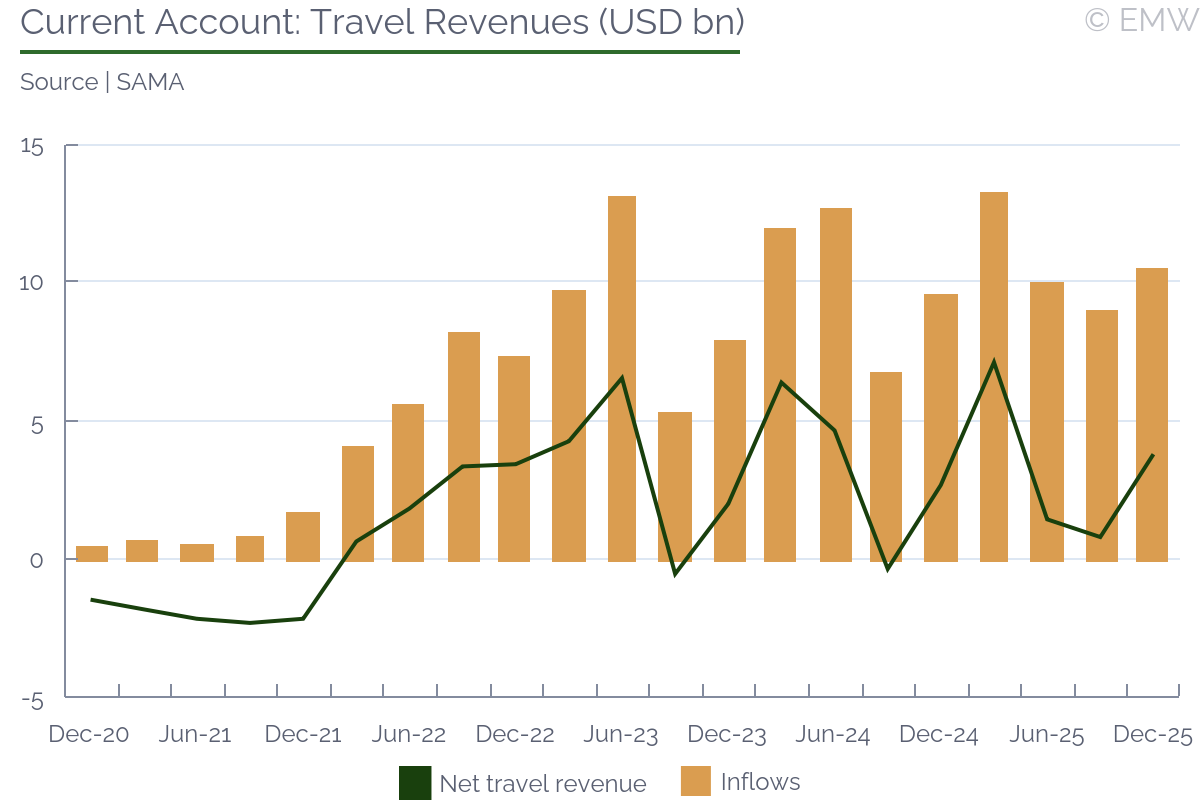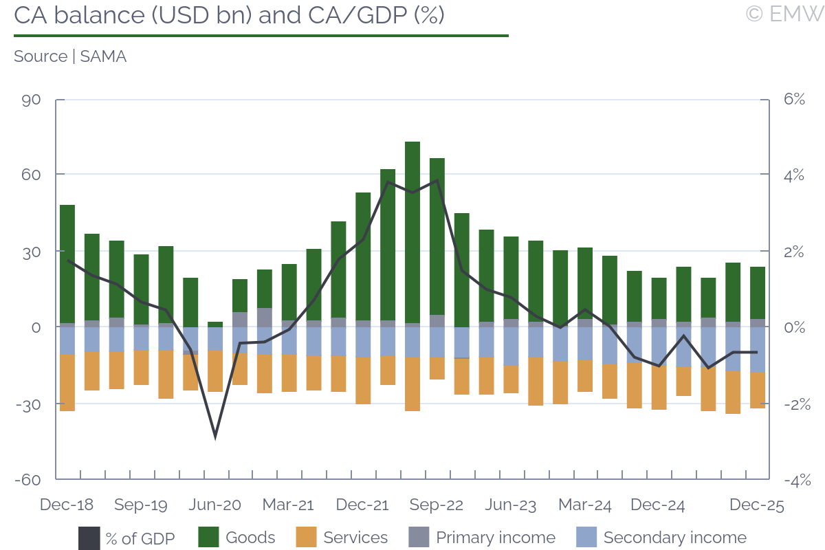 The Current Account recorded a strong deficit of USD 8.2bn in Q4 compared to a similar deficit of USD 8.2bn in Q3 and a USD 12.7bn deficit in Q4 2024, according to preliminary data published by the central bank (SAMA). The y/y moderation in the deficit is due to a steady recovery in oil export revenues (up by USD 2bn or 3% y/y) and higher non-oil exports and service receipts (e.g. travel services). We remind that Saudi Arabia hiked oil production more aggressively last year, but the CA remained in deficit throughout the year dragged down by strong imports (linked to the strong non-oil economic growth) and sizable remittance outflows. The overall CA deficit came in at 2.6% of GDP in 2025, according to our estimates, but the 2026 outlook has become too uncertain. On one hand, Saudi Arabia is reaping the benefits of soaring crude oil prices as the kingdom has rerouted its crude to the Red Sea ports. On the other hand, the oil infrastructure remains vulnerable to Iranian missile and drone attacks, so it remains to be seen how and at what terms the war will end. Perhaps one of the most significant implications for Saudi Arabia and the GCC countries is that the war revealed how vulnerable their economic models are to security escalations and high geopolitical risks. Saudi Arabia's economic diversification program eyed investments in advanced technologies such as AI and data centres and massive residential and commercial real estate projects. The unprecedented nature of the Iranian strikes on data centers and energy facilities across the region exposed the vulnerability of these economic plans. On a positive note, SAMA's foreign reserves are enough to cover around 16 months of merchandise imports and service payments, according to our calculations, which puts the external position in a very healthy position. Breakdown As noted, oil exports rose by 3% y/y to USD 54bn on the back of larger exported volumes. Further, the non-oil exports rose by sizeable 16% y/y to USD 25bn, and they have been steadily rising on the back of exported chemicals, electrical equipment and parts. The effective closure of the Hormuz Strait and the supply line disruptions have already forced some companies to halt operations, which will drag on non-oil exports in Q1 2026. Imports, meanwhile, rose by 3% y/y, which we attribute to Saudi Arabia's non-oil economy that is expanding robustly, driven by private consumption, investments, and looser fiscal policy. According to the statistics office, imports are driven by machinery and electrical equipment as well as transport equipment and parts, but we expect renewed pressure from food imports in 2026. Meanwhile, the deficit in the Service Account narrowed by 19% y/y to USD 14bn, as receipts rebounded by 17% y/y, while payments fell slightly on the year. Freight transport payments remain a major drag on the account, together with construction services and travel. Importantly, the receipts in the travel account have been improving steadily since the pandemic as the kingdom wants to transform into a major tourism destination for secular and religious tourism. Saudi Arabia's tourist sector hosted nearly 116mn people in 2024 (of which 30mn were foreigners) and the government upgraded its 2030 tourism sector target to 150mn (of which 70mn are foreigners). Needless to say, the Iran War may derail the ambitions of the kingdom to emerge as a major aviation hub and destination for secular tourism. The Primary Account, which is traditionally an important source of forex inflows, posted a relatively strong surplus of USD 2.9bn in the quarter, down 5% on the year. The primary account has been falling in recent years due to Saudi Arabia's increased reliance on loans and the kingdom's focus on investments in the local non-oil economy as part of the ambitious diversification program Vision 2030. The deficit in the Secondary Account widened by strong 20% y/y to USD 17.5bn in the quarter, driven by а 20% y/y growth in personal transfers (workers' remittances) to USD 15.5bn. The non-oil economy relies heavily on expatriate workers, especially in the construction sector, but also in high-skill areas, so the deficit in the secondary income has become structural. The government had deployed measures to encourage the employment of Saudis and to reduce the reliance on foreign workers, and eventually froze and cancelled some of the giga-projects during Q4 and Q1 2026, which may ease some of the pressures in the labour market over the medium term. The Financial Account The Financial Account recorded a net liability position of USD 15.7bn in Q4 compared to a net liability of USD 18.1bn in the same period of 2024. The financial account recorded strong FDI and Other investment inflows, coupled with relatively strong portfolio inflows and an overall slowdown in the accumulation of financial assets. FDI inflows rose by 90% y/y to USD 12.9bn, which is a welcomed news for the government and its ambitious plans to diversify the economy away from oil. Saudi Arabia's massive spending plans have not resonated with foreign investors, at least not at the extent the kingdom had anticipated. Many of the giga-projects have been actively seeking foreign investors as they push to meet ambitious targets but were ultimately scaled down, cancelled, or put on hold over the past 5-6 months. The kingdom recorded USD 32bn FDI inflows in 2025, falling below the USD 37bn target set for that year (the target for 2026 is USD 47bn) and the government will have to find ways to attract foreign investments after the war ends. Meanwhile, FDI outflows fell by 62% y/y to USD 5.0bn. FDI outflows have become more erratic over the past few years, which we think reflects Saudi Aramco's investments in hydrogen and oil refinement outside the kingdom as well as real estate investments in North Africa. Portfolio inflows rose by 38% y/y USD 8.0bn, reflecting a sharp increase in debt securities and equity, the latter reflecting the relaxed rules on